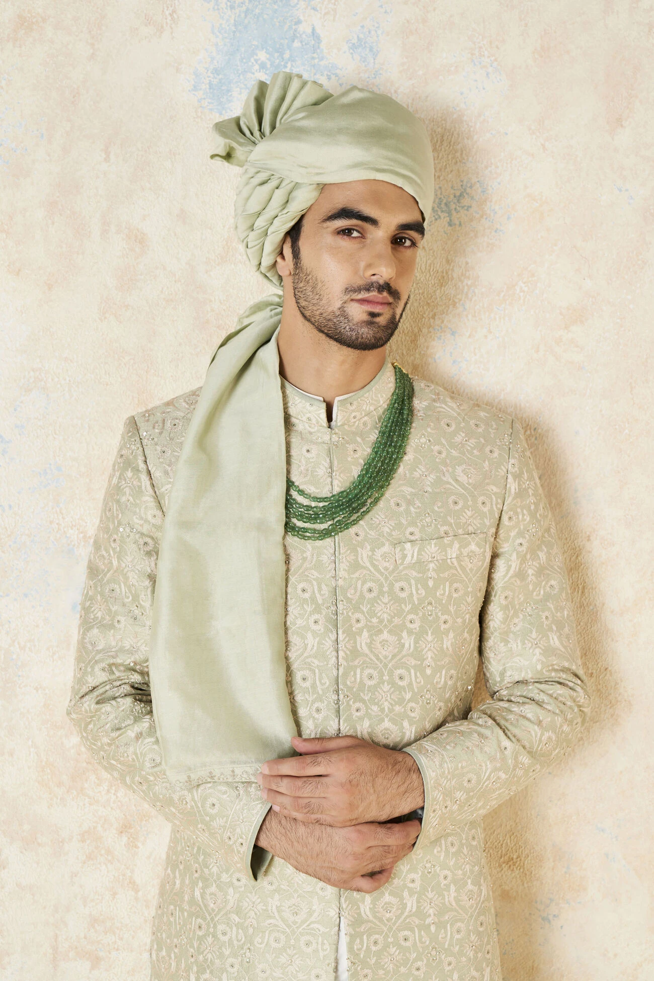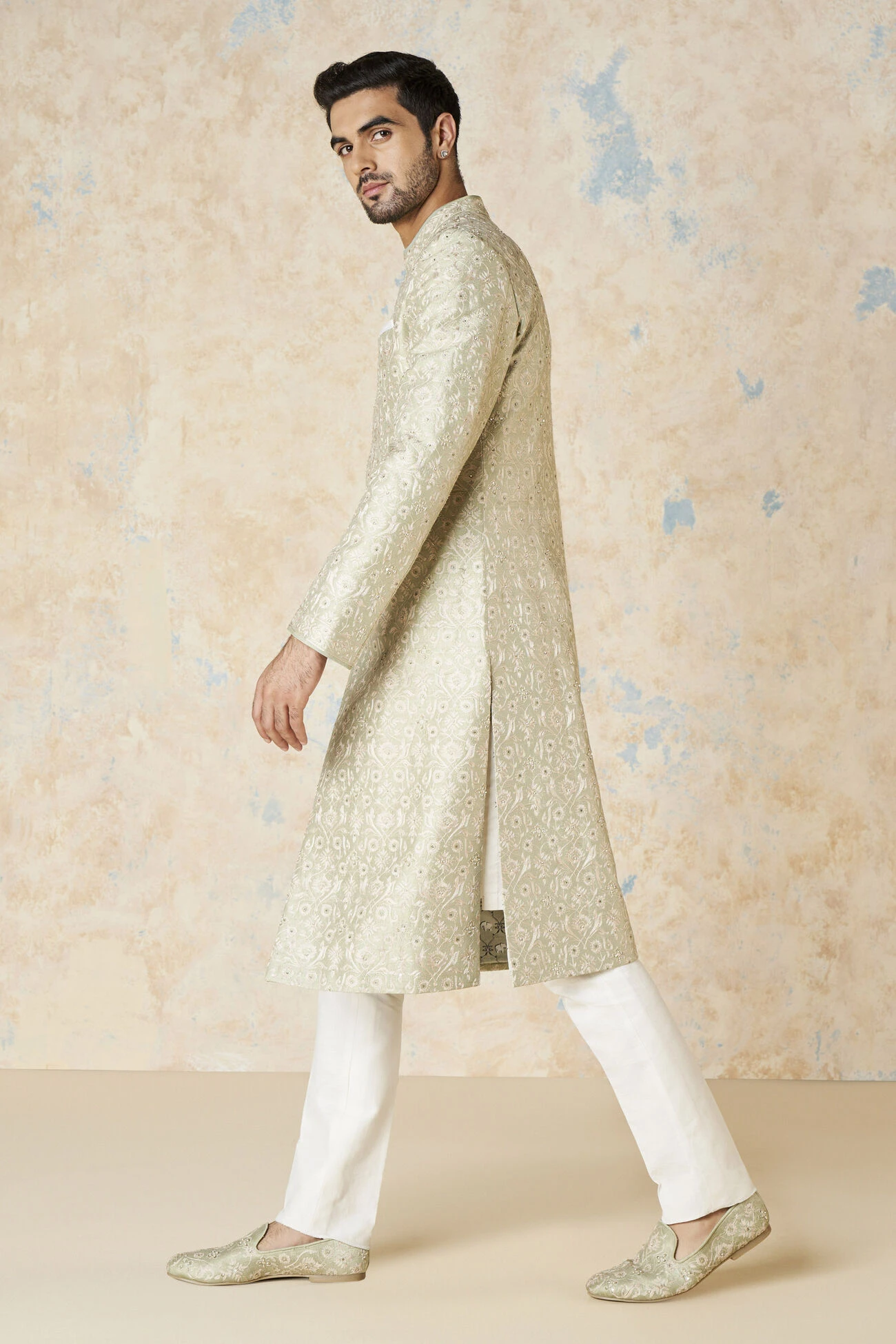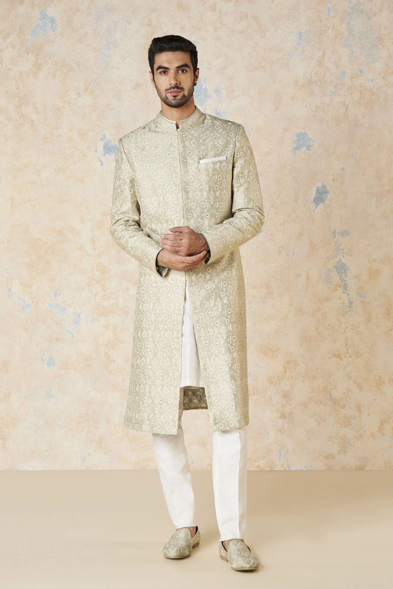 Crafted with aari and zardozi embroidery, the Aajay sherwani is perfect for modern celebrations. Elevated with detailed motifs, this occasionwear essential is a great addition to your wardrobe.