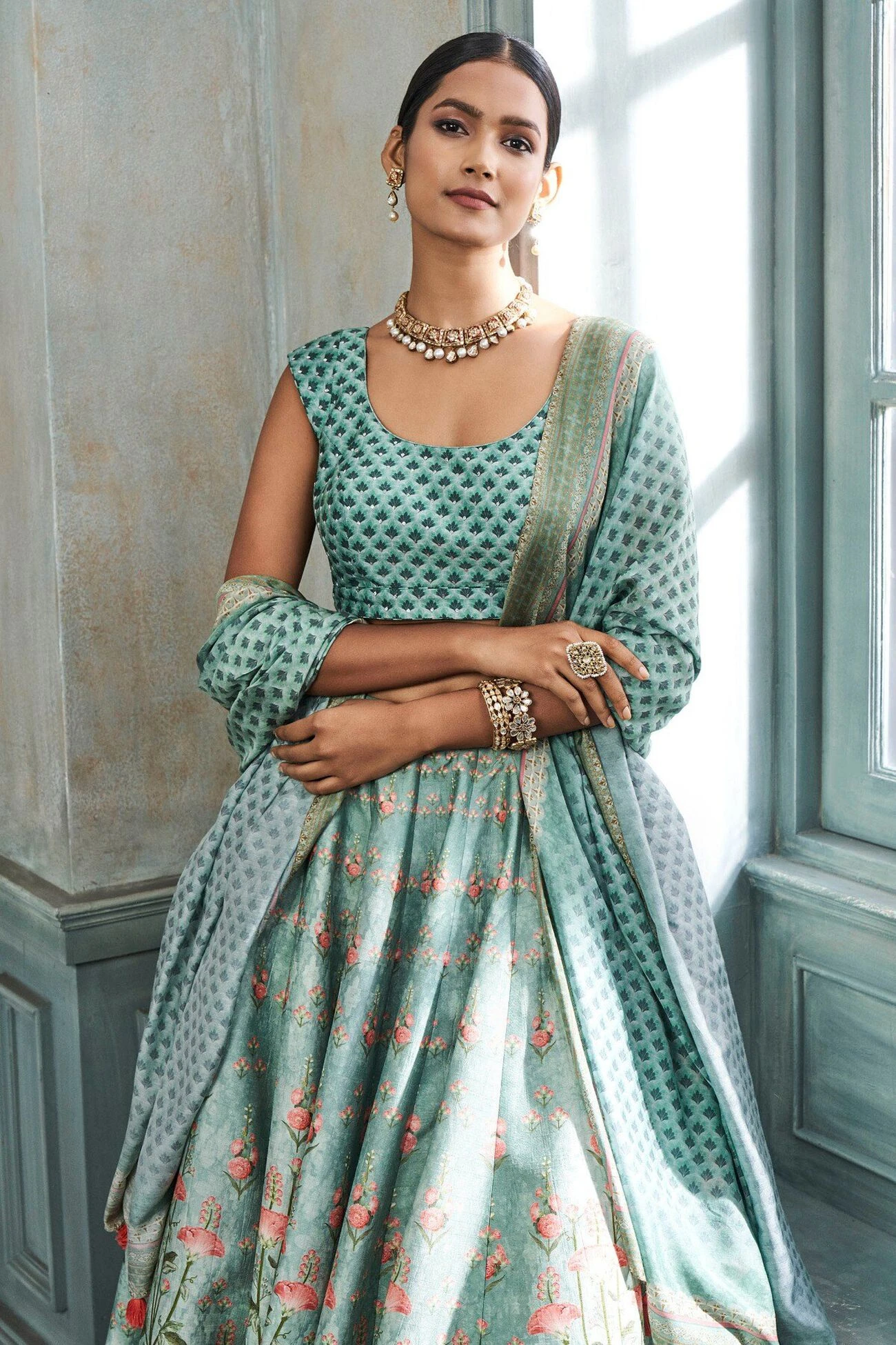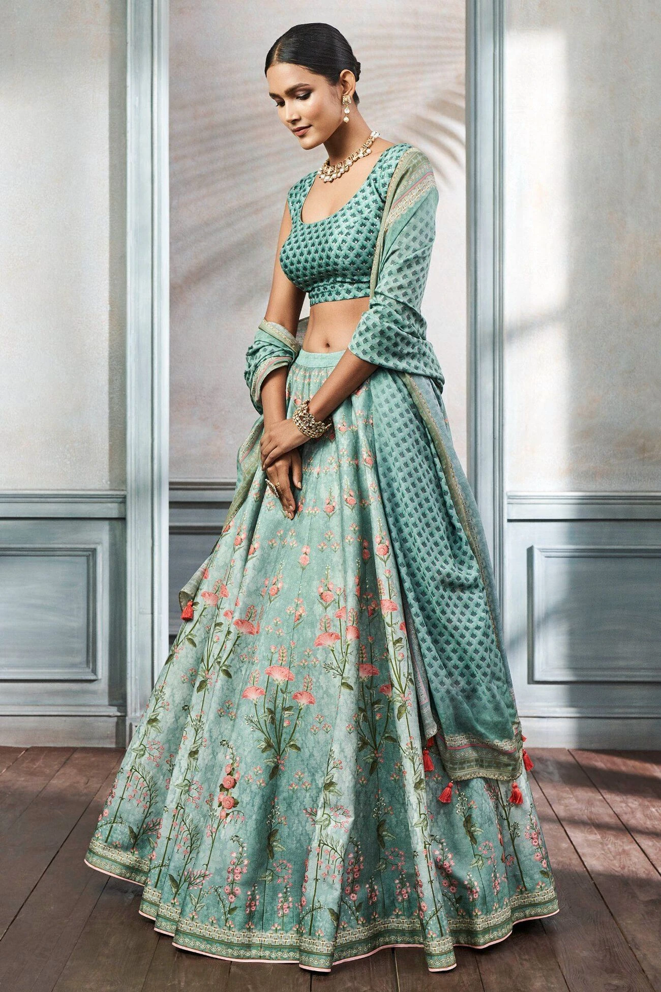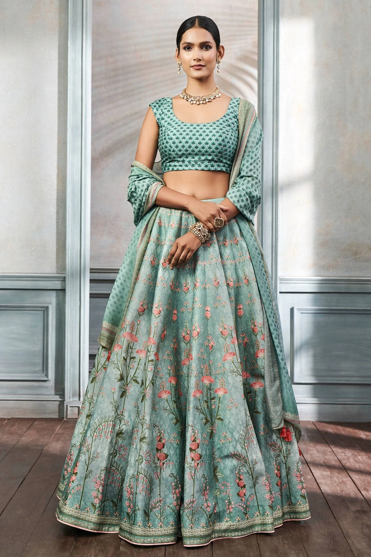The sage green silk lehenga set is printed with floral motifs that remind you of lush beautiful gardens of summer. The Aditri set is a must have this season.