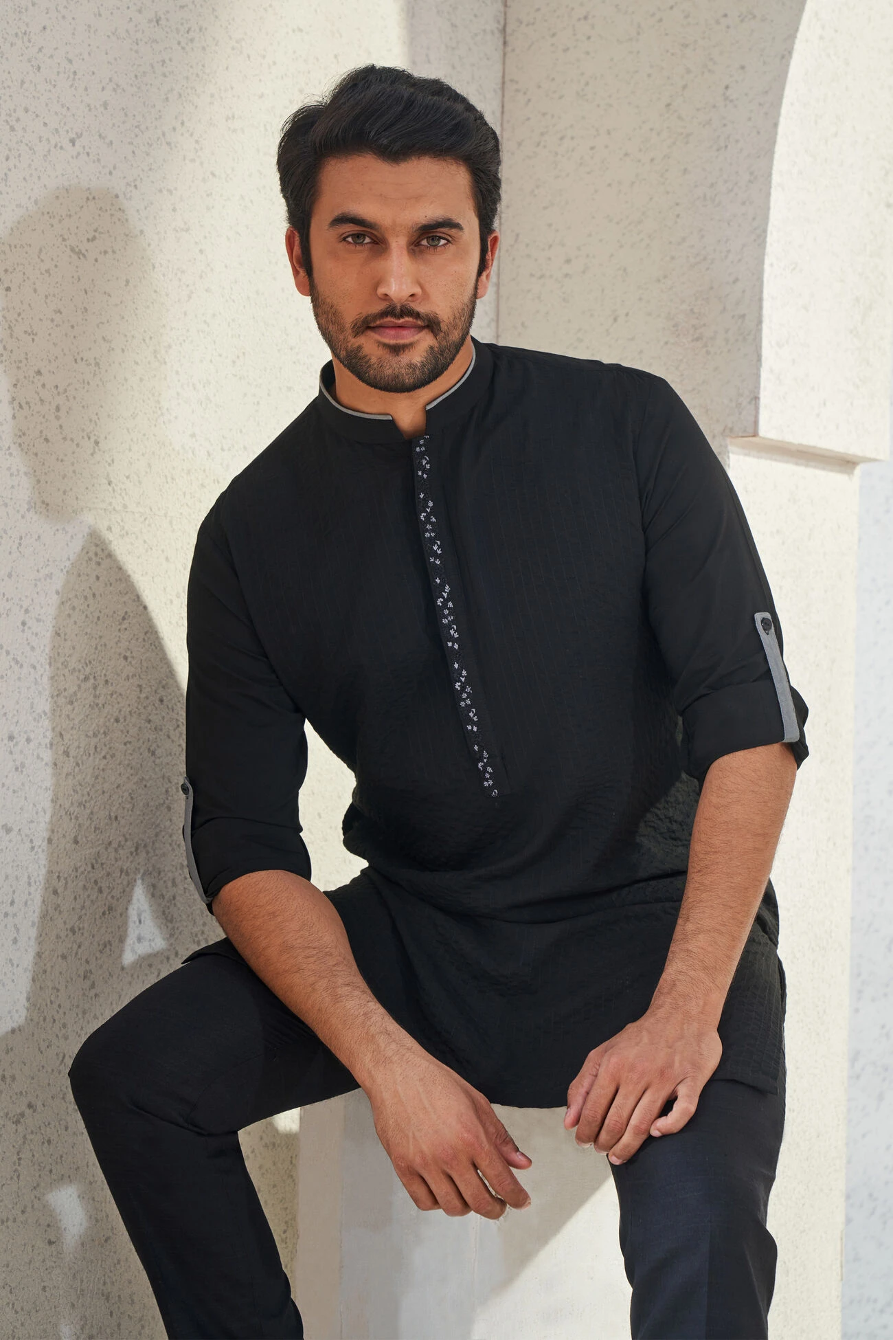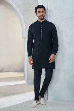 A timeless classic, Afraz makes a bold entrance. A highlighting collar and placket detail elevates the look of this kurta making it a great addition to your wardrobe.
