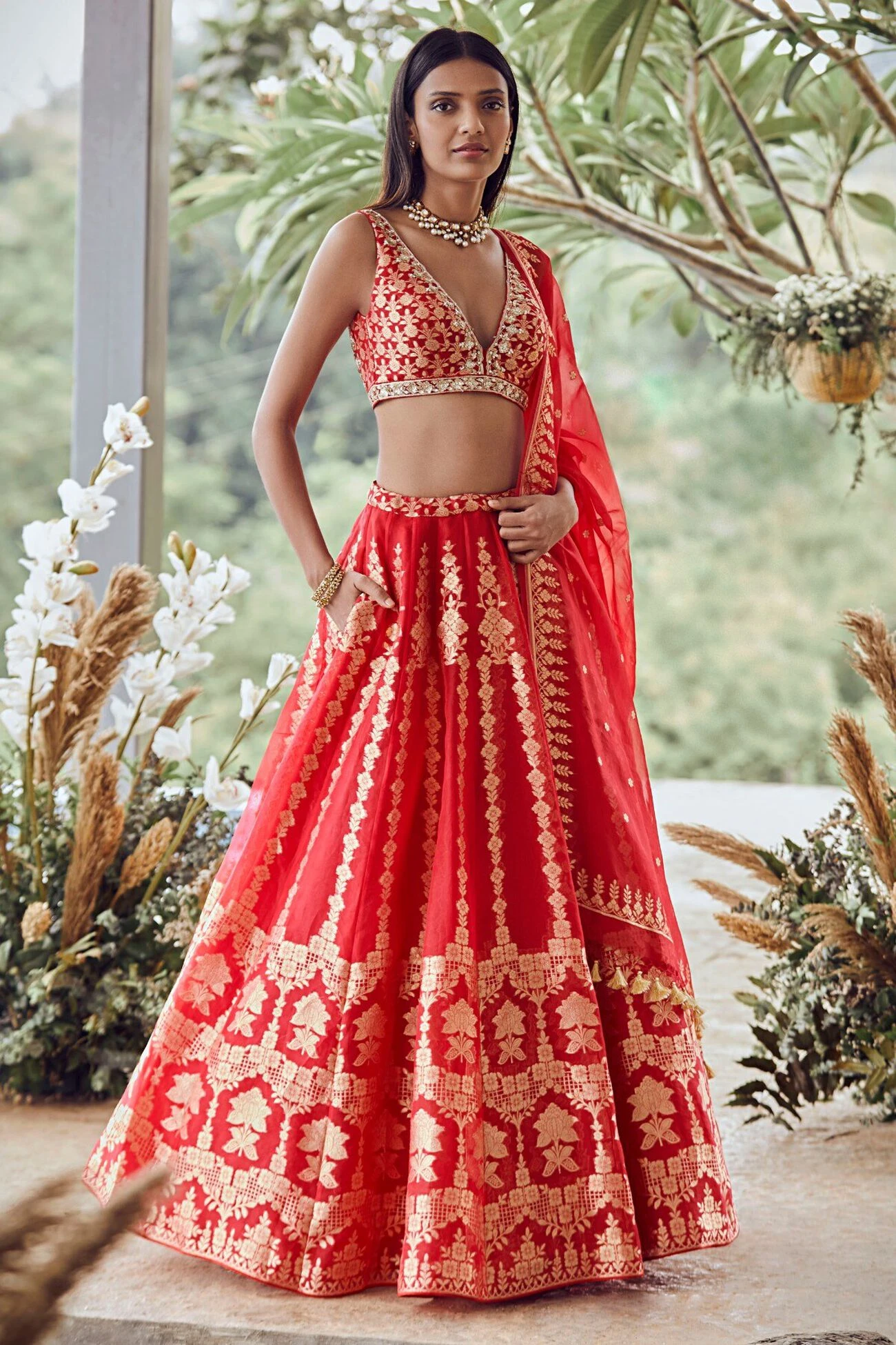 A light red lehenga that calls to mind princesses from times of yore. Its intricate Benarasi work dazzles, while the complementing choli and dupatta add to its soft glamour.