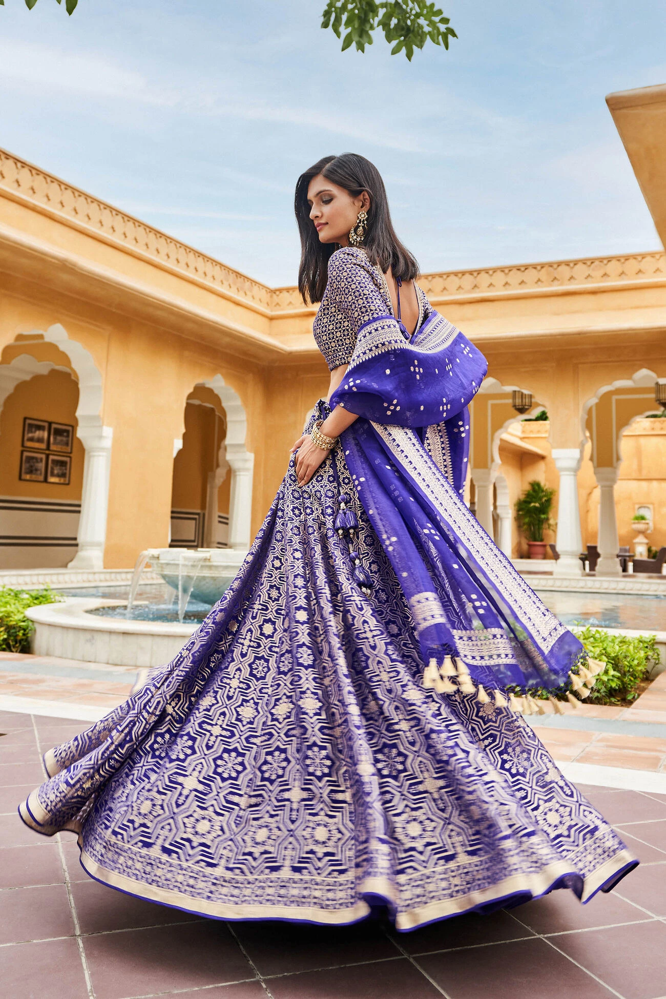 Inspired by architectural motifs from Sindh, the Aniq Lehenga Set handwoven in Benaras is brought to life on blush organza.