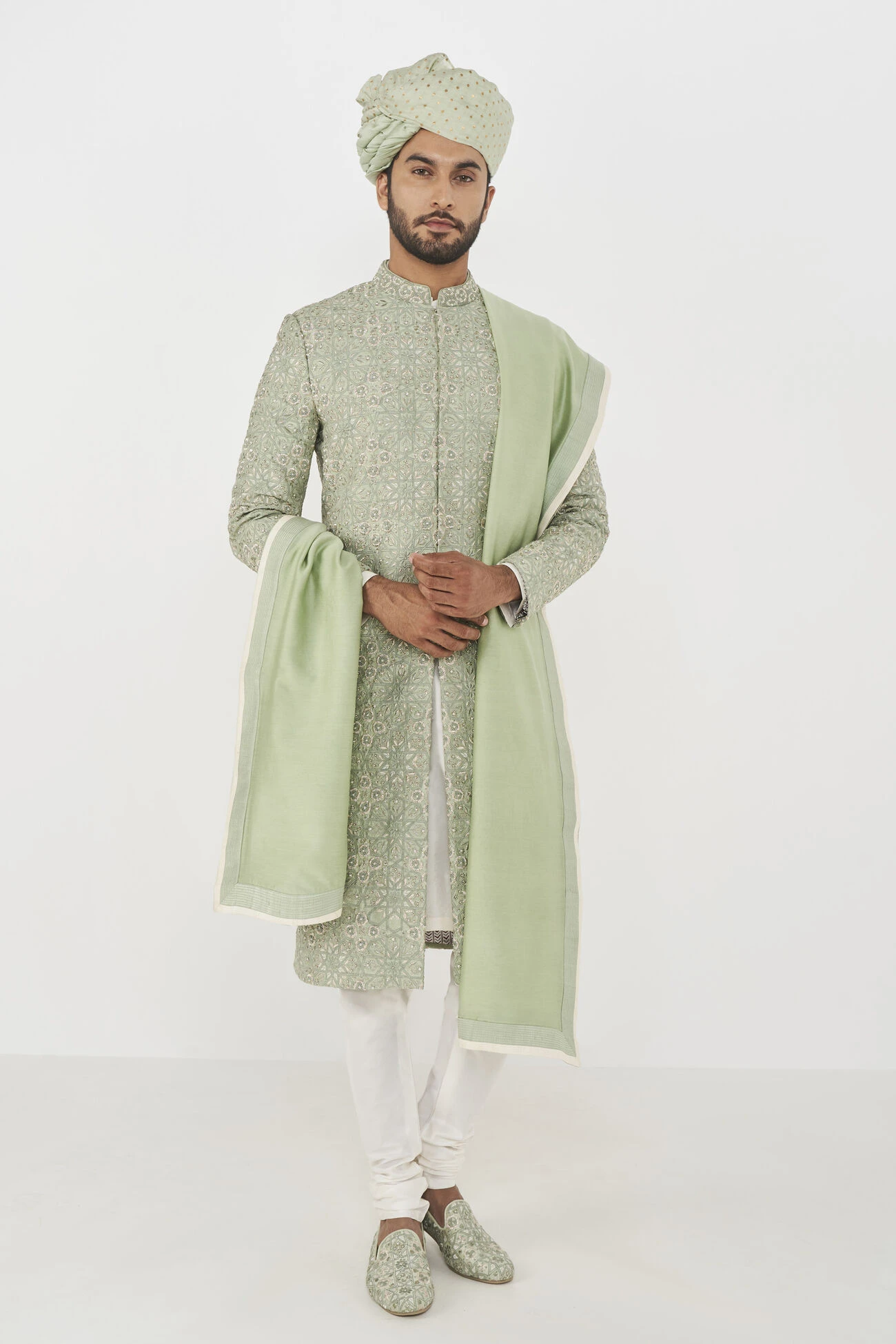 The sage dupatta with stitch lines adorning all sides has a subtle sophistication. Silk-made, this accessory adds panache to your traditional ensembles.