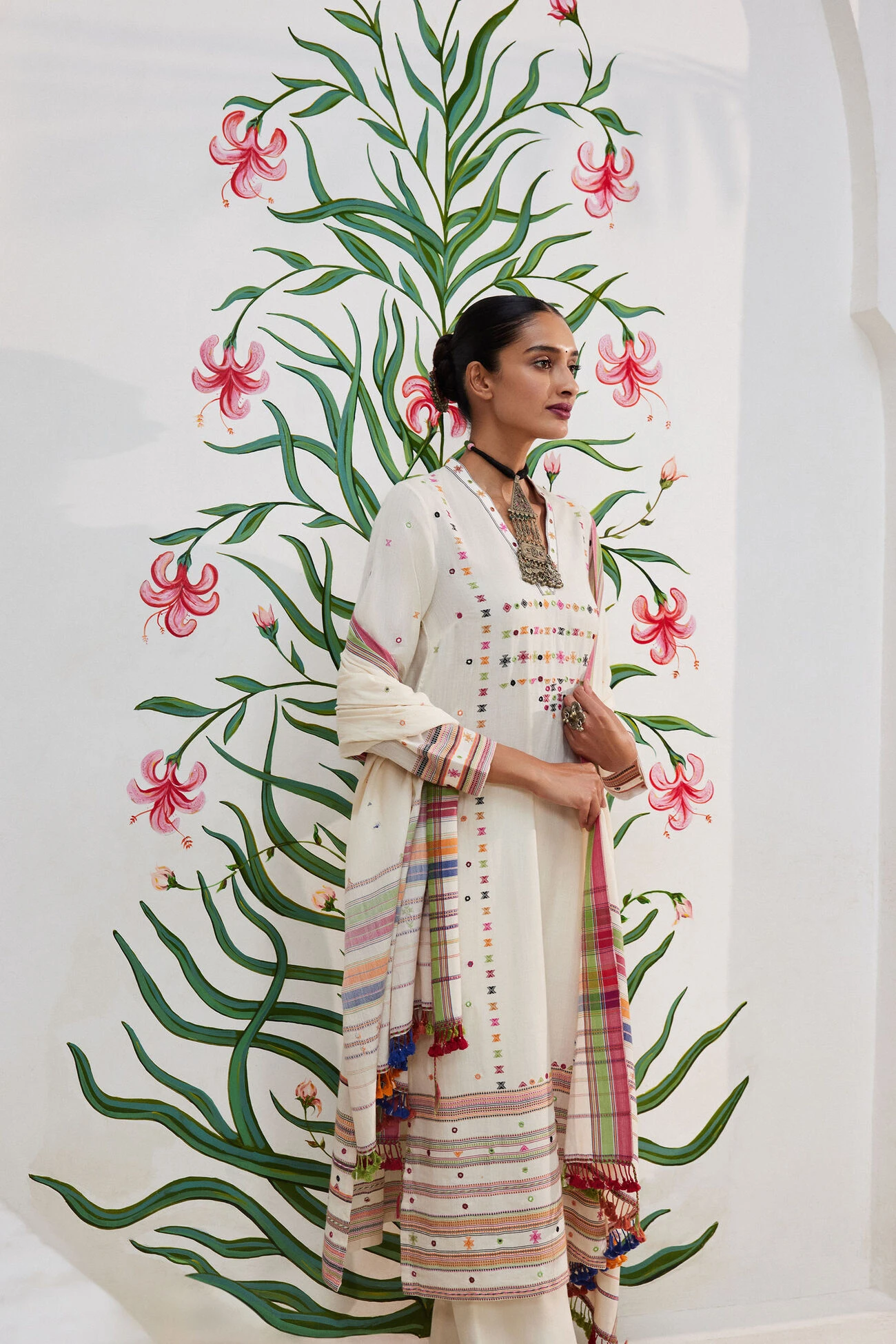 Composed by skilled hands, the Bhujodi weave is highlighted in Arna. A perfect intermix of geometric motifs paired with vibrant threads makes this one a great festive upgrade for celebrations