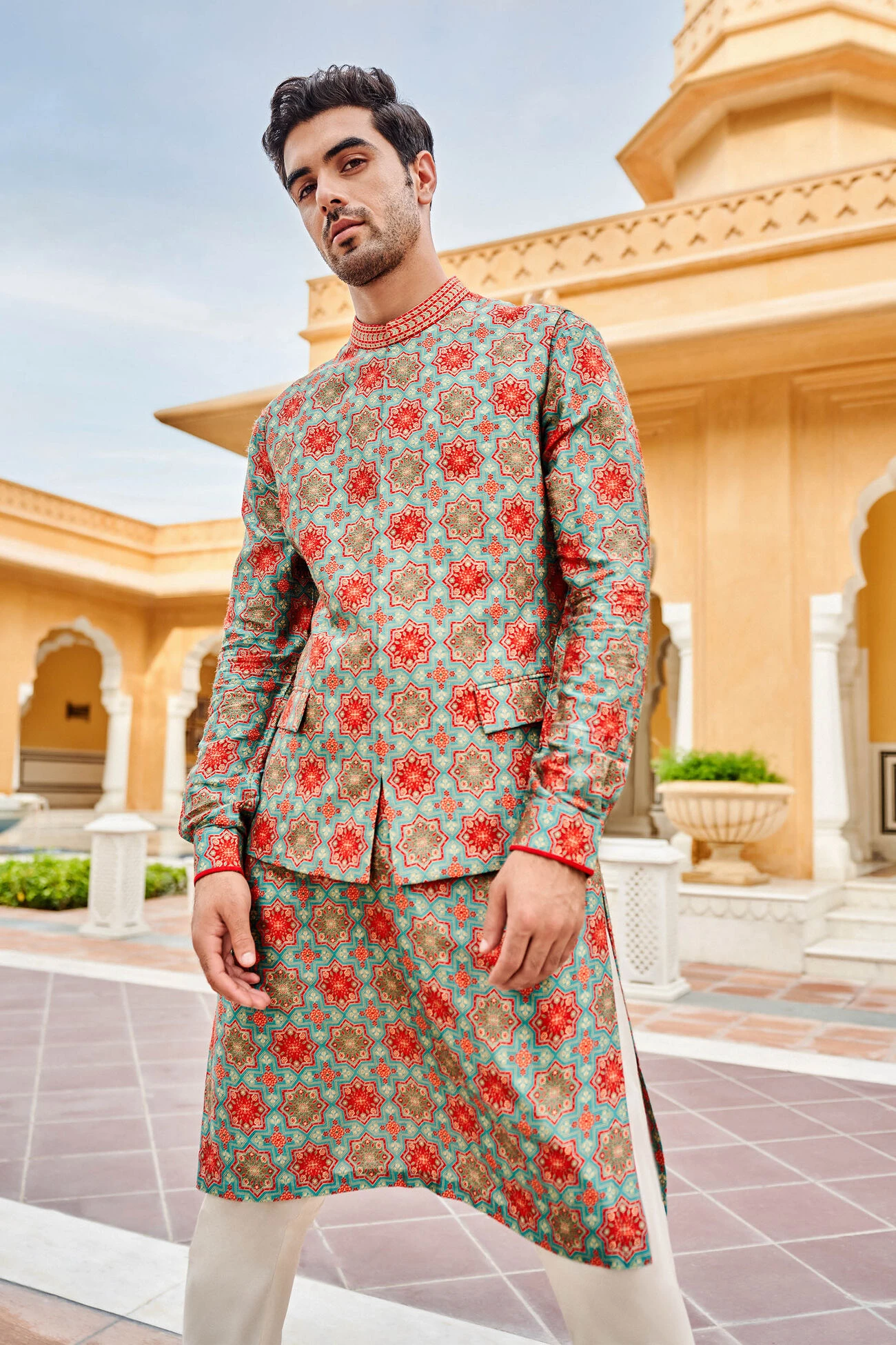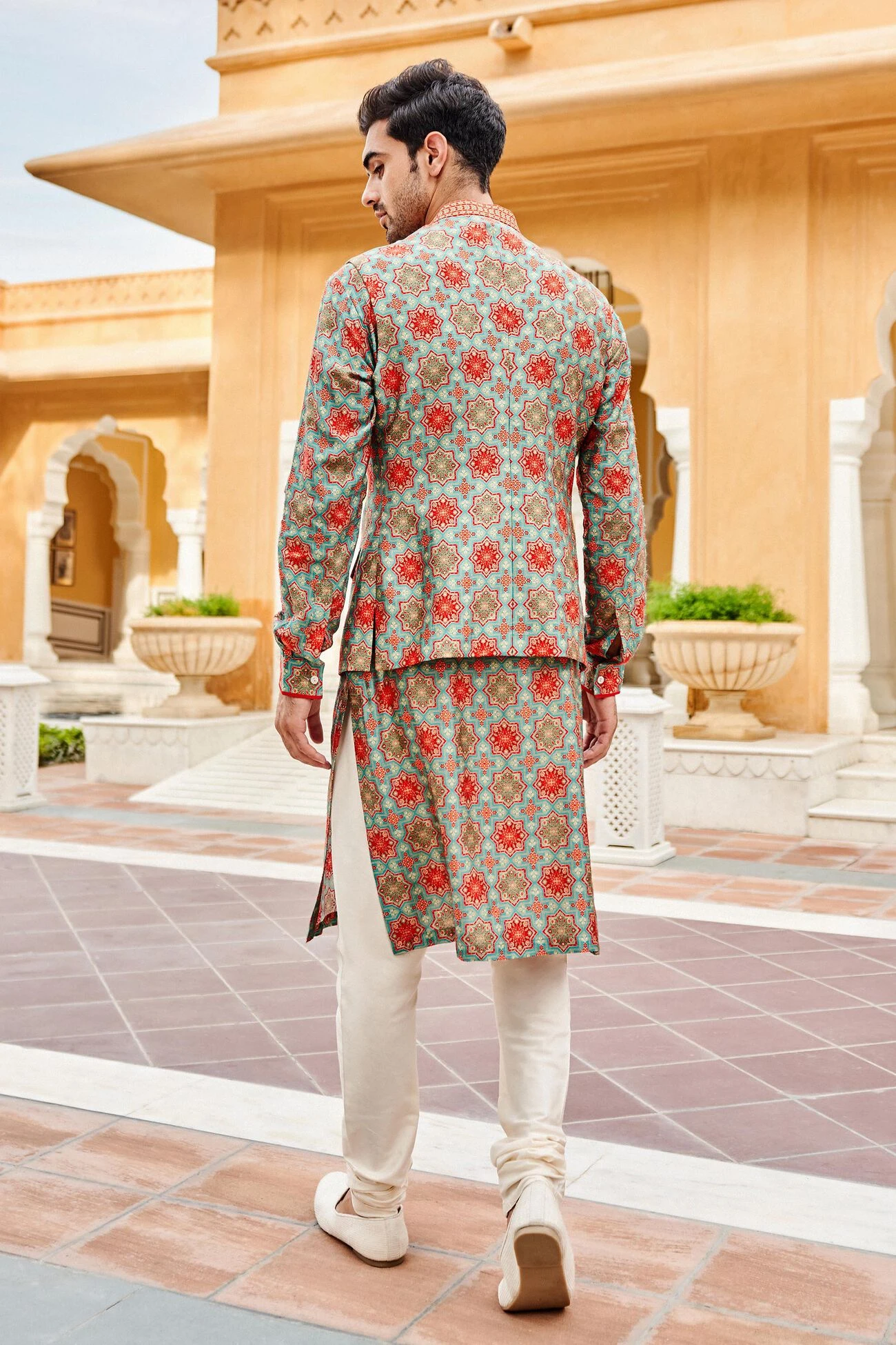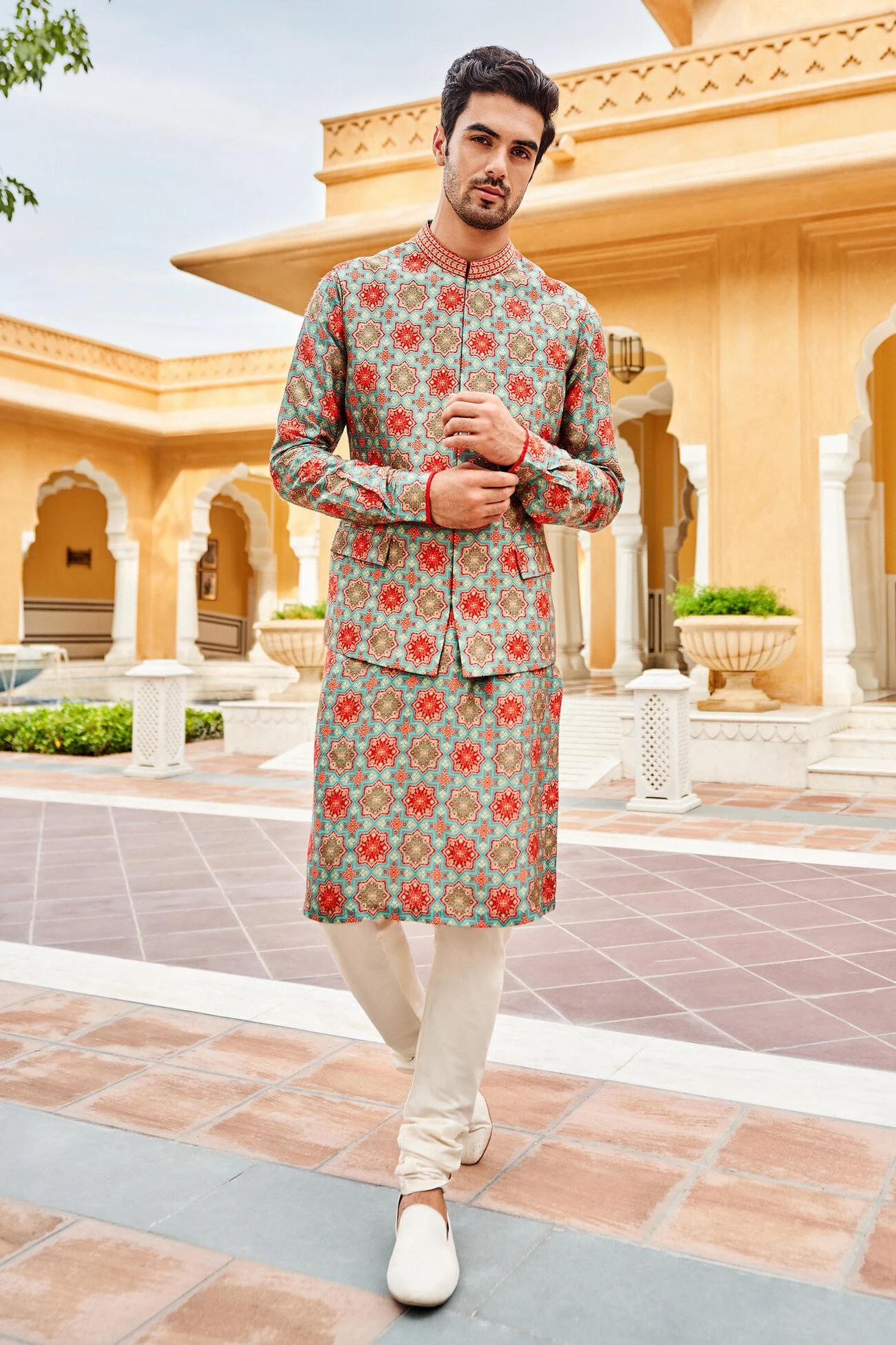 The rich expression of our ice blue Nehru jacket, framed in prints, makes it a lightweight classic that surely makes a statement any day – any event.