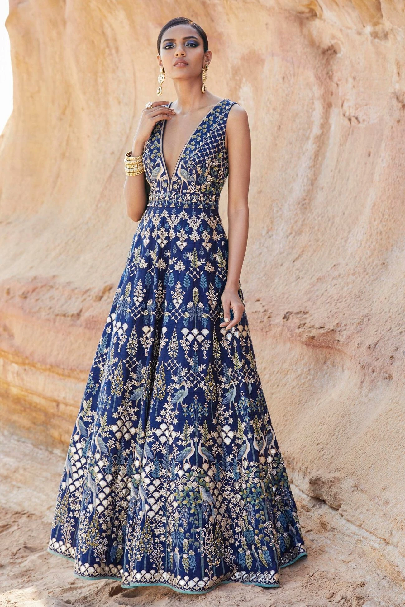 Meticulously painted by hand in traditional pichwai style, the Awa Gown is crafted in pure luxurious silk. This navy blue gown is further embellished with pearls, sequins and our signature craft of Gota Patti. This is Poetry in Pichwai.