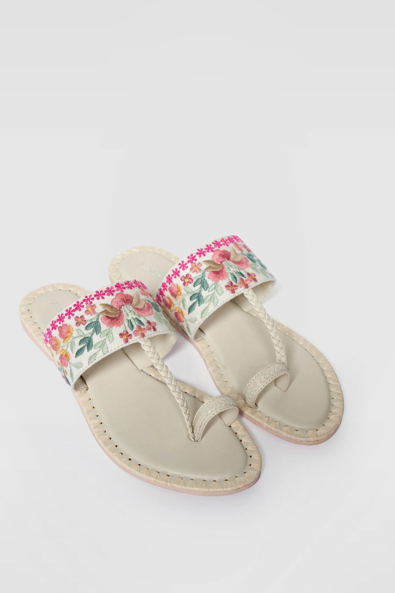Blooms of pink and shoots of green take up space in these femininely elegant chappals embroidered with resham. A comfortable pair of flats that is also vegan.
