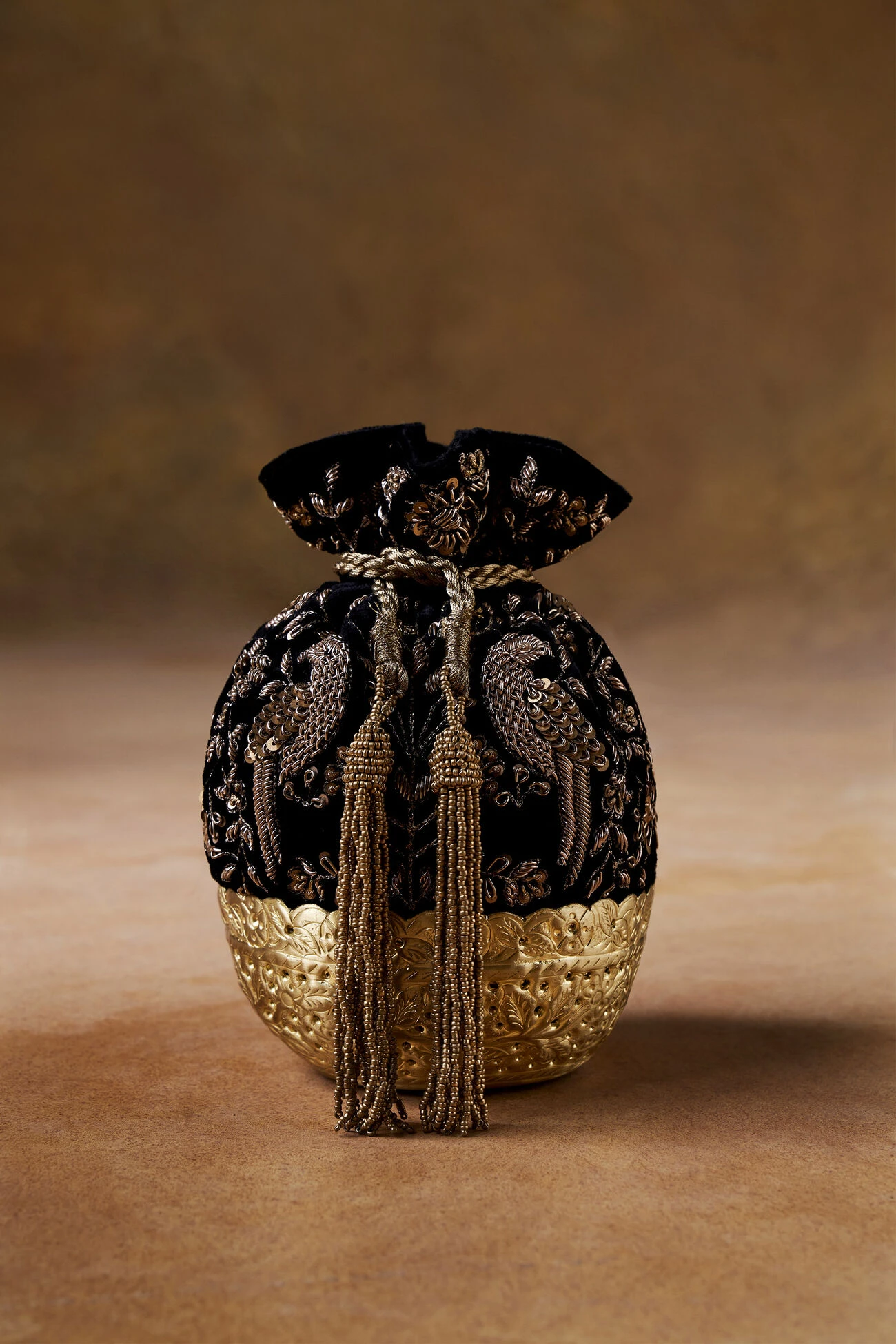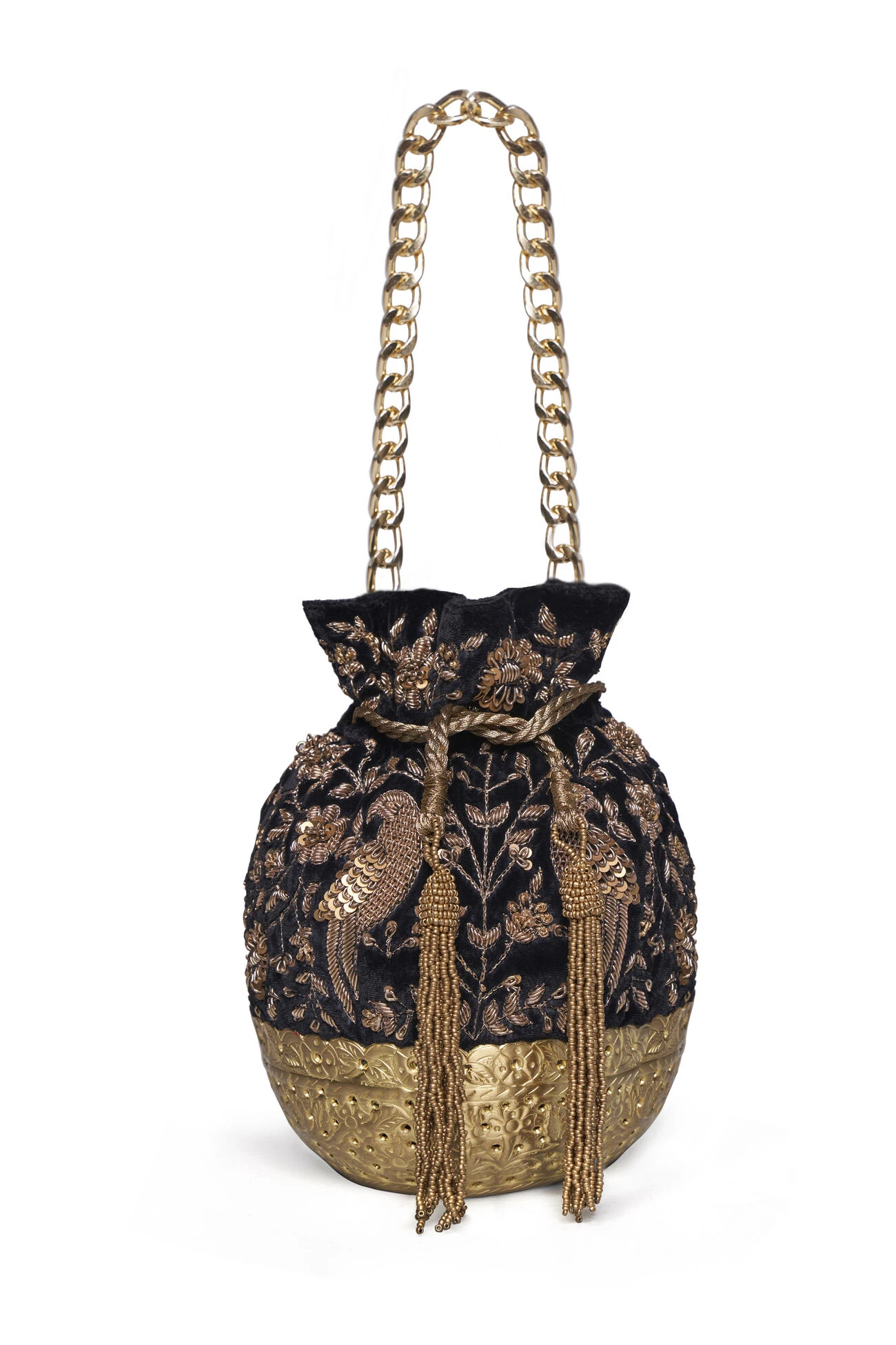 Featured as a signature accessory in our Rewild – Fashion For Good fundraiser, this sack expresses the harmonious bond of inhabitants in the forest through hand-embroidered motifs. Comes with a hand-etched metal bowl and drawstring closure with bead tassels. Highlighted with a chain handle.
