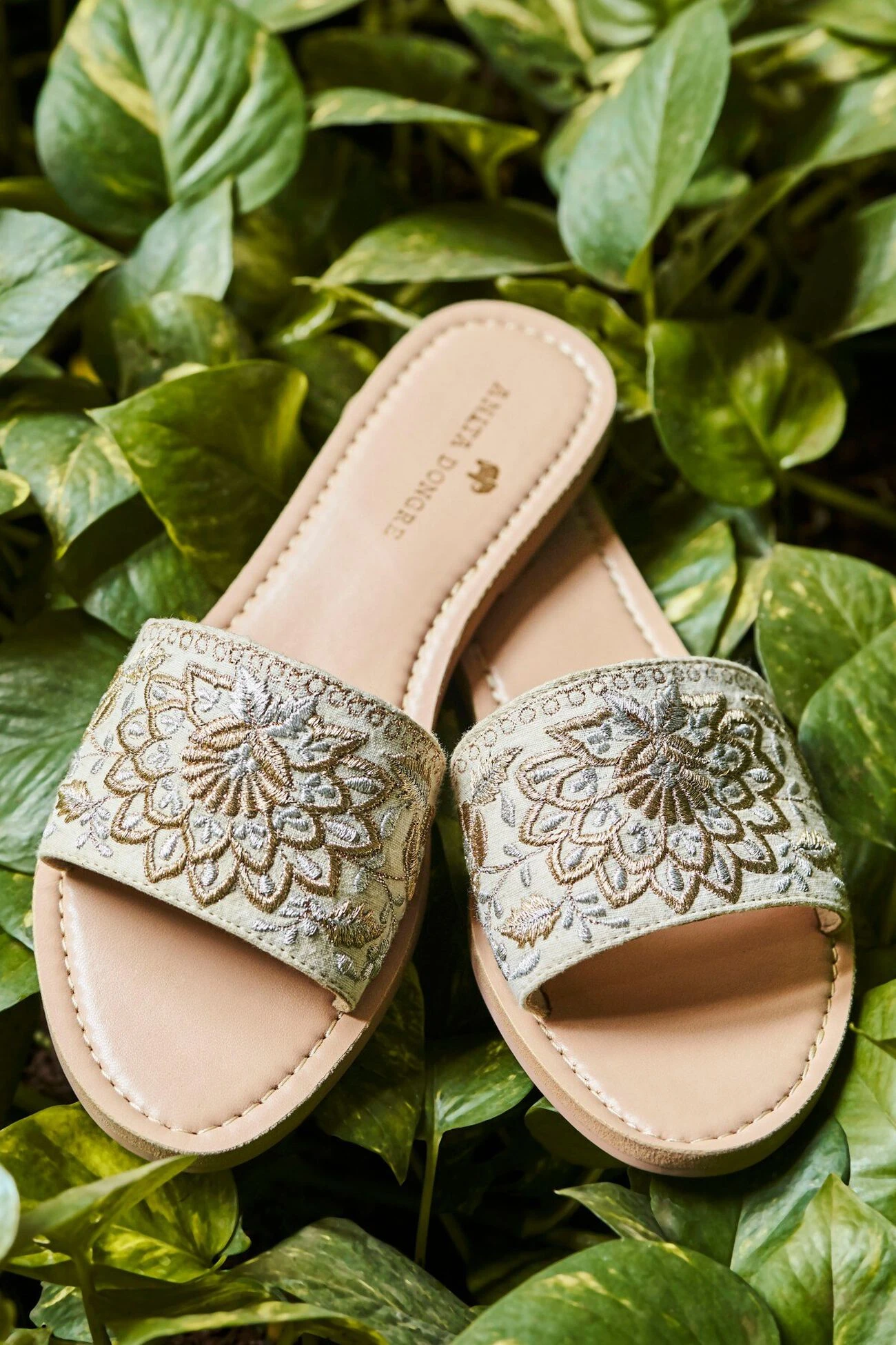 Vegan and cruelty-free embroidered sliders in hand-woven cotton. Soft neutral tones make it a versatile ensemble piece.