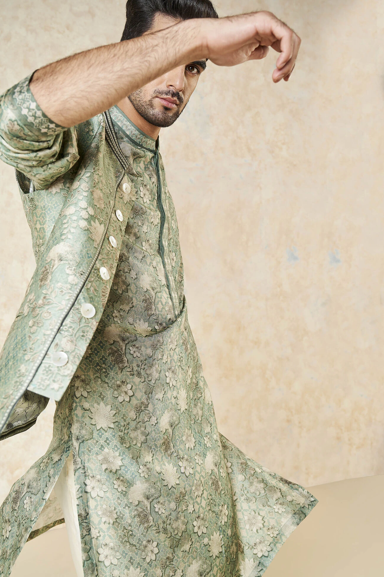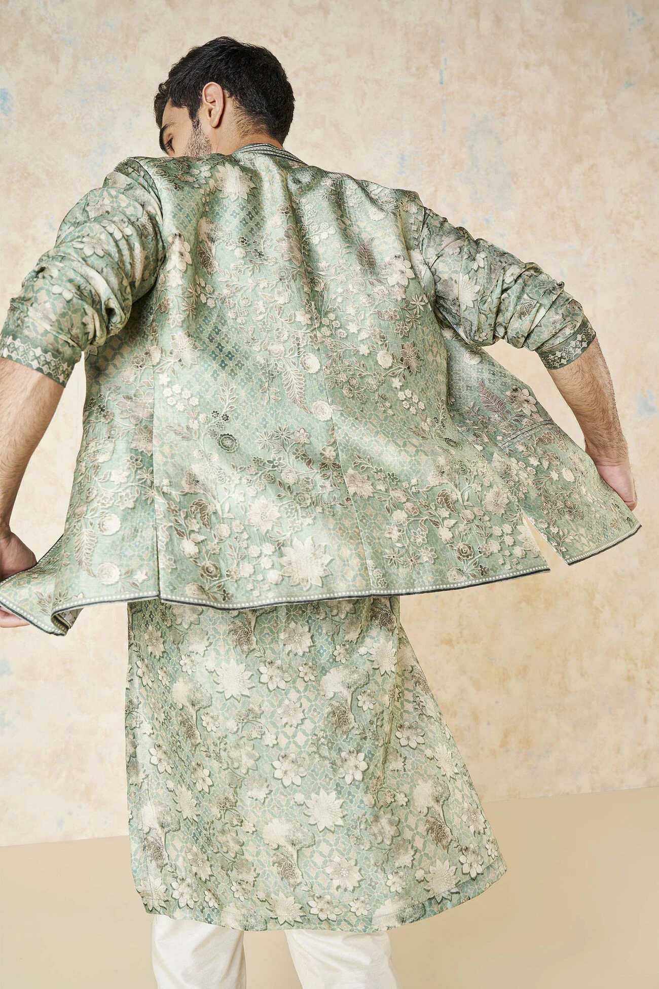 Make a statement in the Bhramar Nehru jacket. Crafted in a hue drawn from natural elements and interspersed with blooming prints, this is perfect for modern celebrations.
