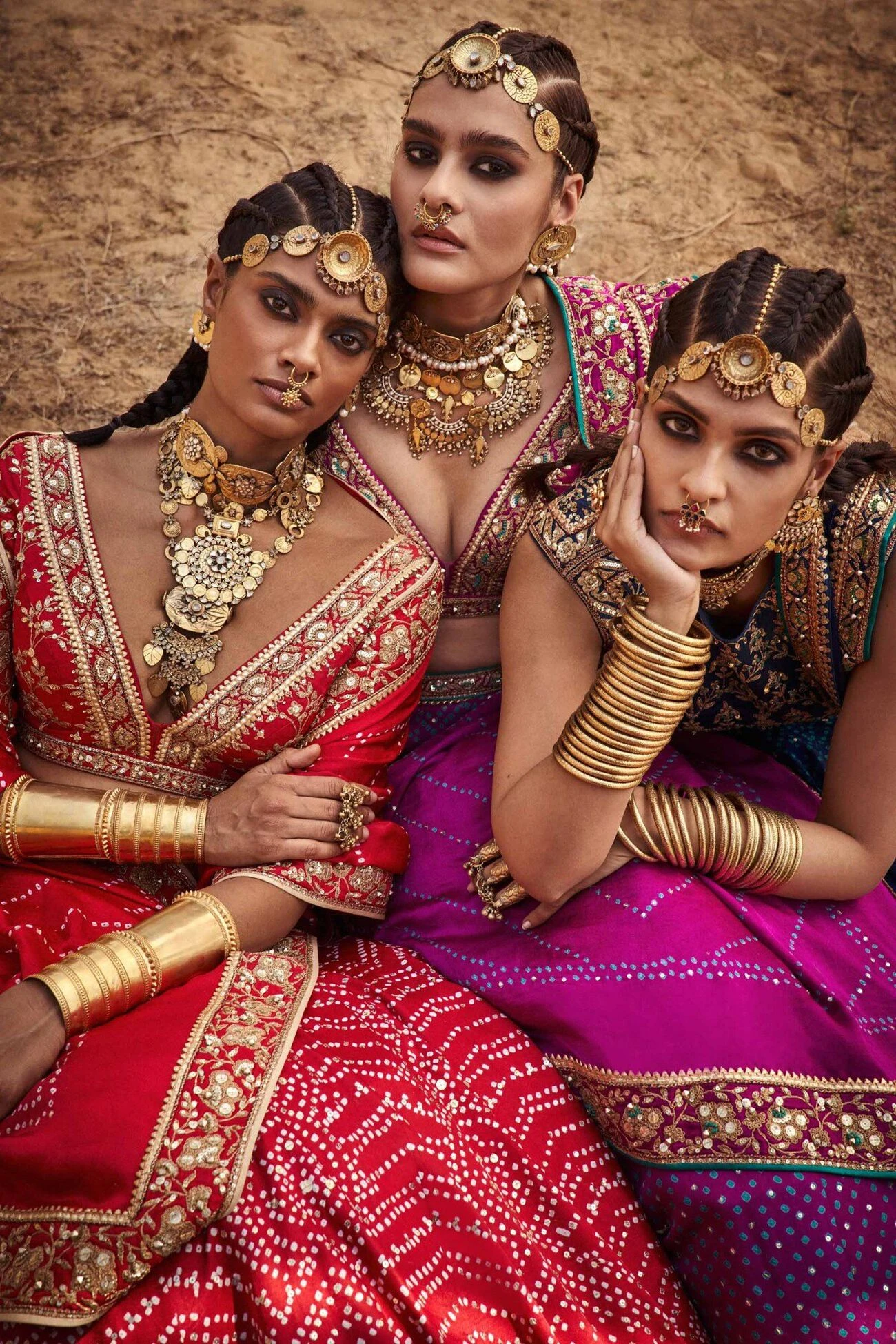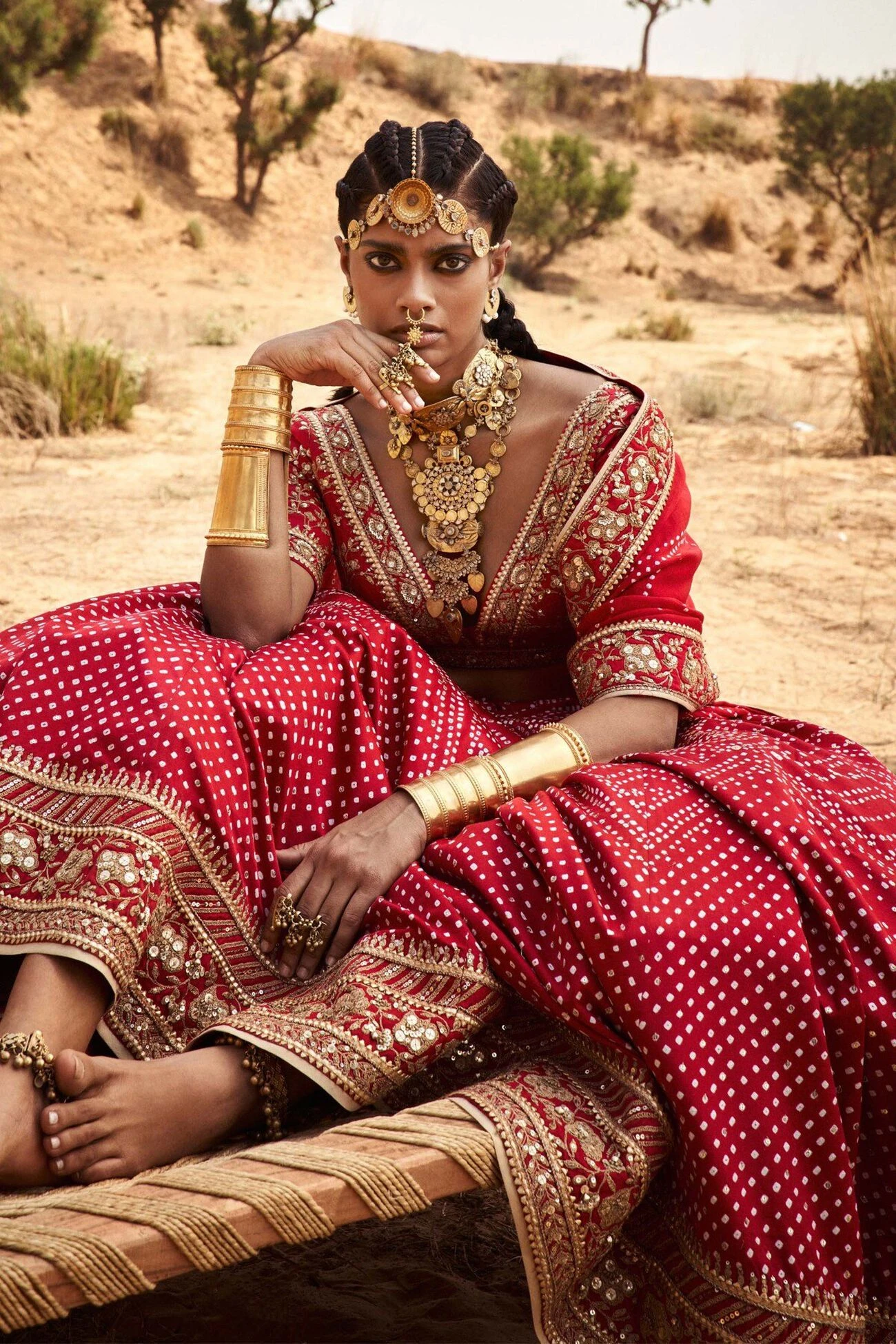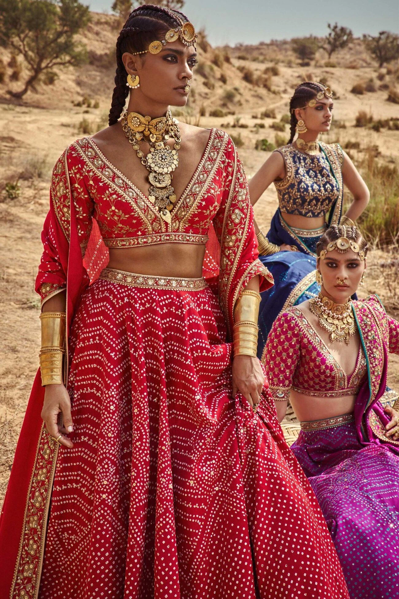A constellation of handmade Bandhani knots is released over red silk lehenga set. The patterns are highlighted with our signature craft of gota patti and additionally embellished with sequins, zardozi and dori patterns. Pockets included. A piece from our expanding conscious couture carrying the legacies of artisans and ancient craft.