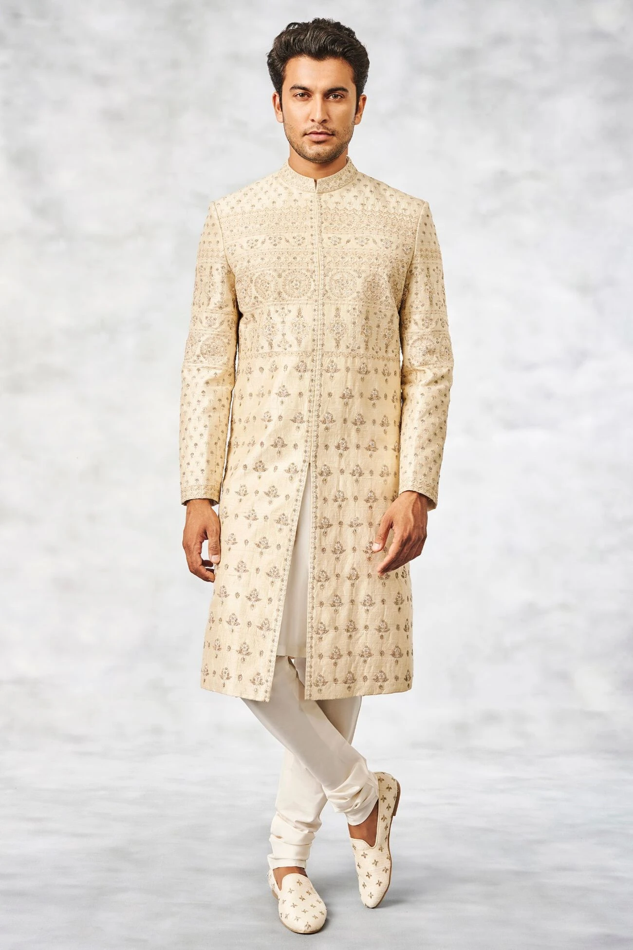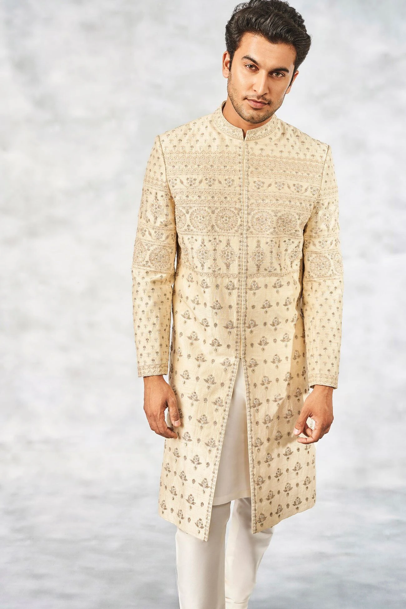 Capturing a charming ease, the silk Bidur Sherwani comes with placement motifs created with intricate thread work and hand embroidered detailing.