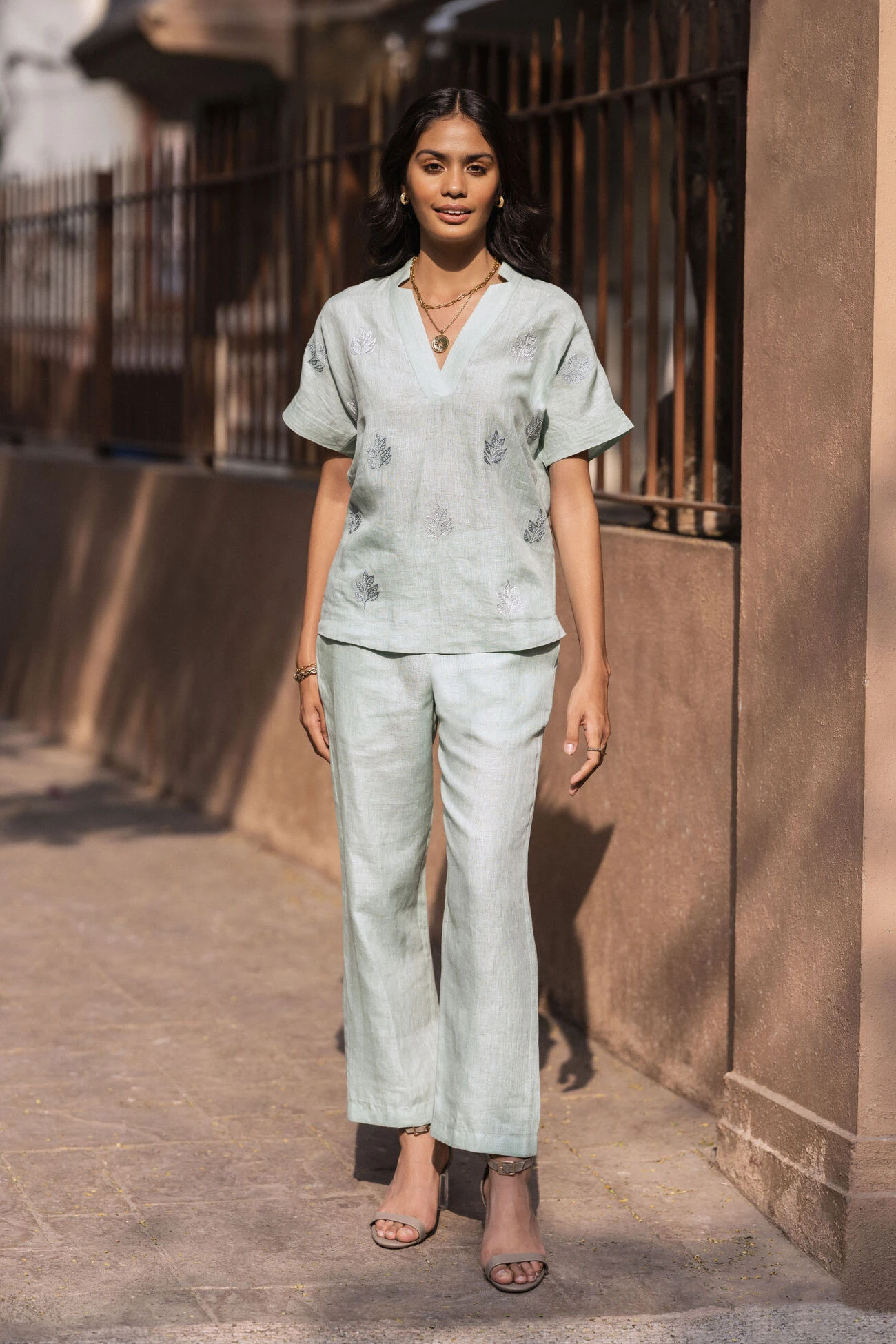 Refreshing summer leaves in tonal embroidery complete the perfectly coordinated look in linen.