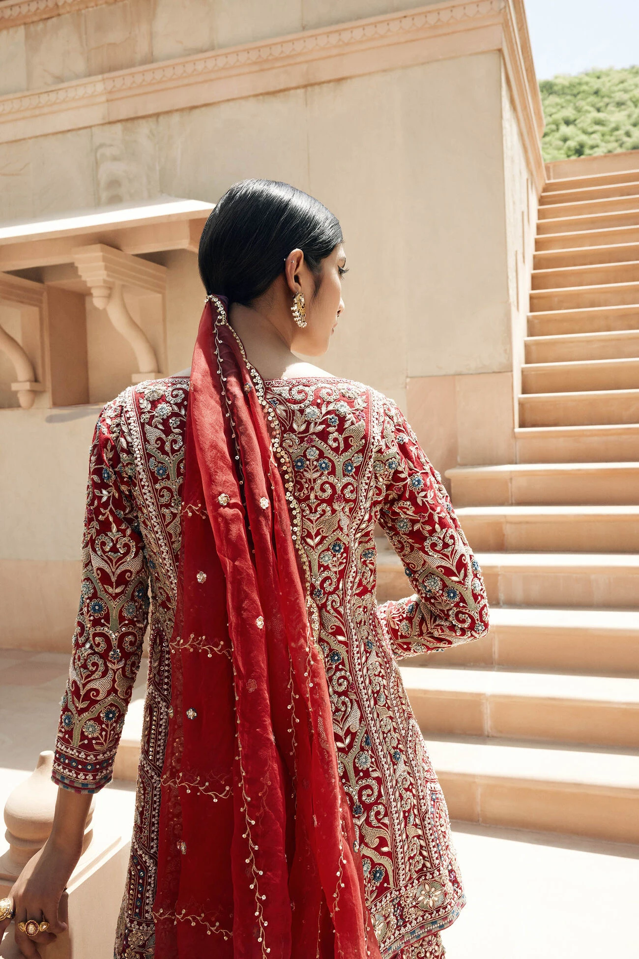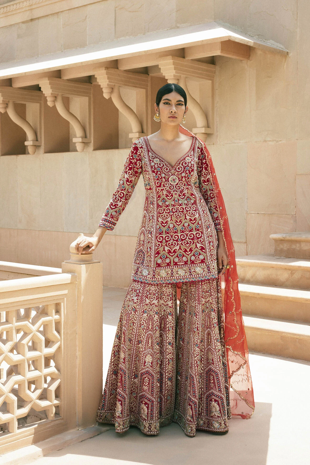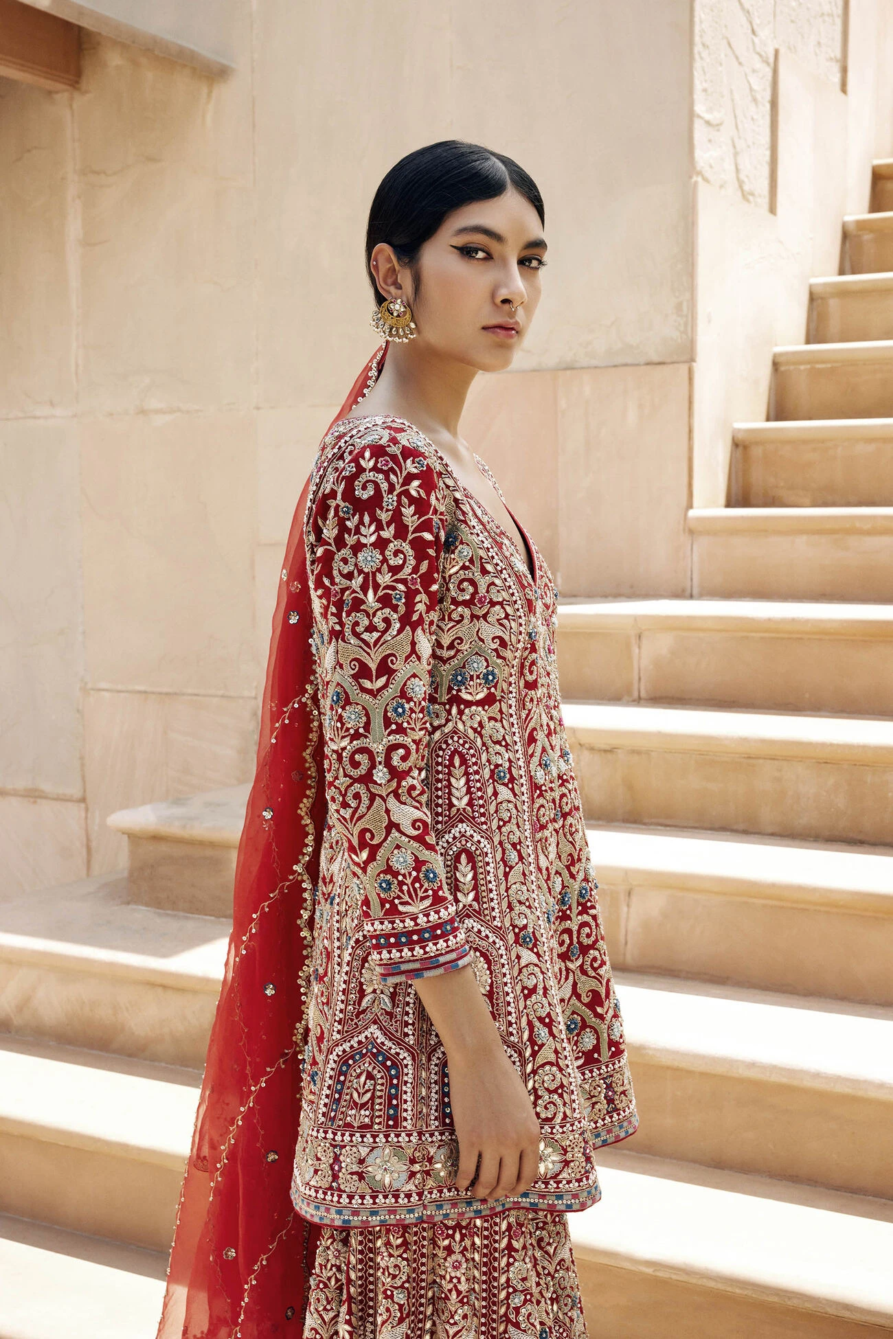 This elegantly embroidered set features Mughal motifs in resham, gotta patti, and zardosi embroidery. A perfect blend of classic details merged with a contemporary silhouette for a modern look.