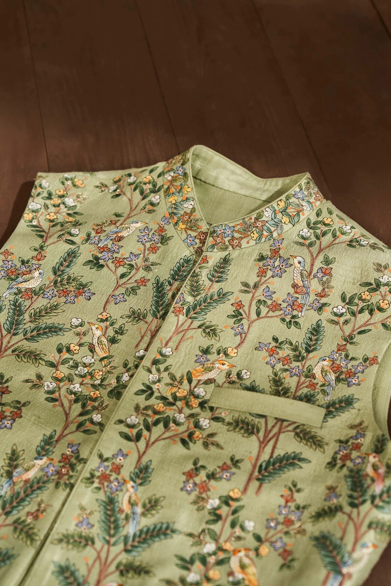 Look occasion-ready in sage green Bandi accented with traditional Pichhwai artwork. The intricate embroidery on the entire Silken jacket evokes a regal aura as its entirely hand-stitched. Also, it has pockets.