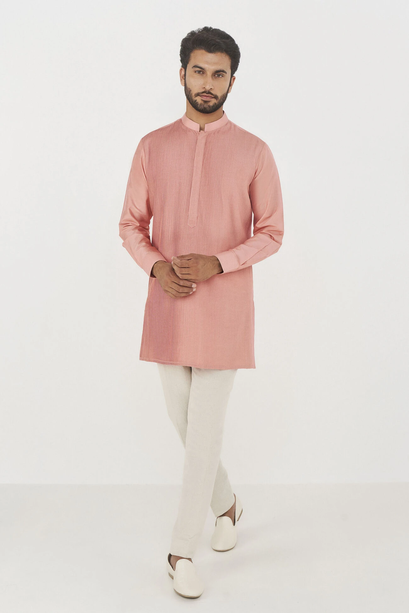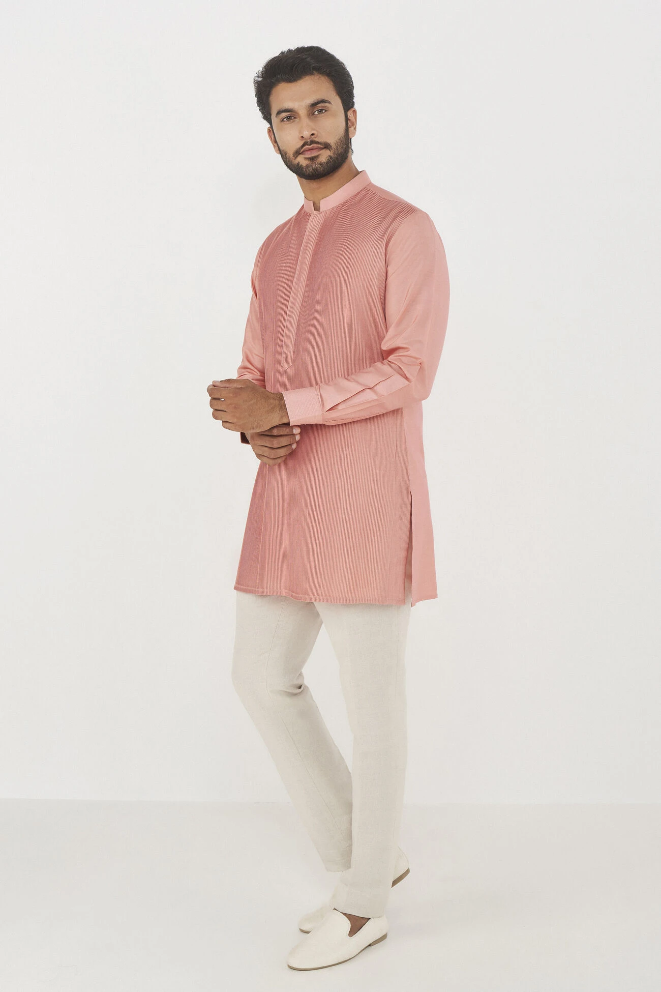 Made with spun silk, with a stylish Chinese collar and cuff detail, this short pin-tucked kurta is the multi-tasker every stylish man needs. Wear it to any event, or on days you feel like upping the sartorial ante.
