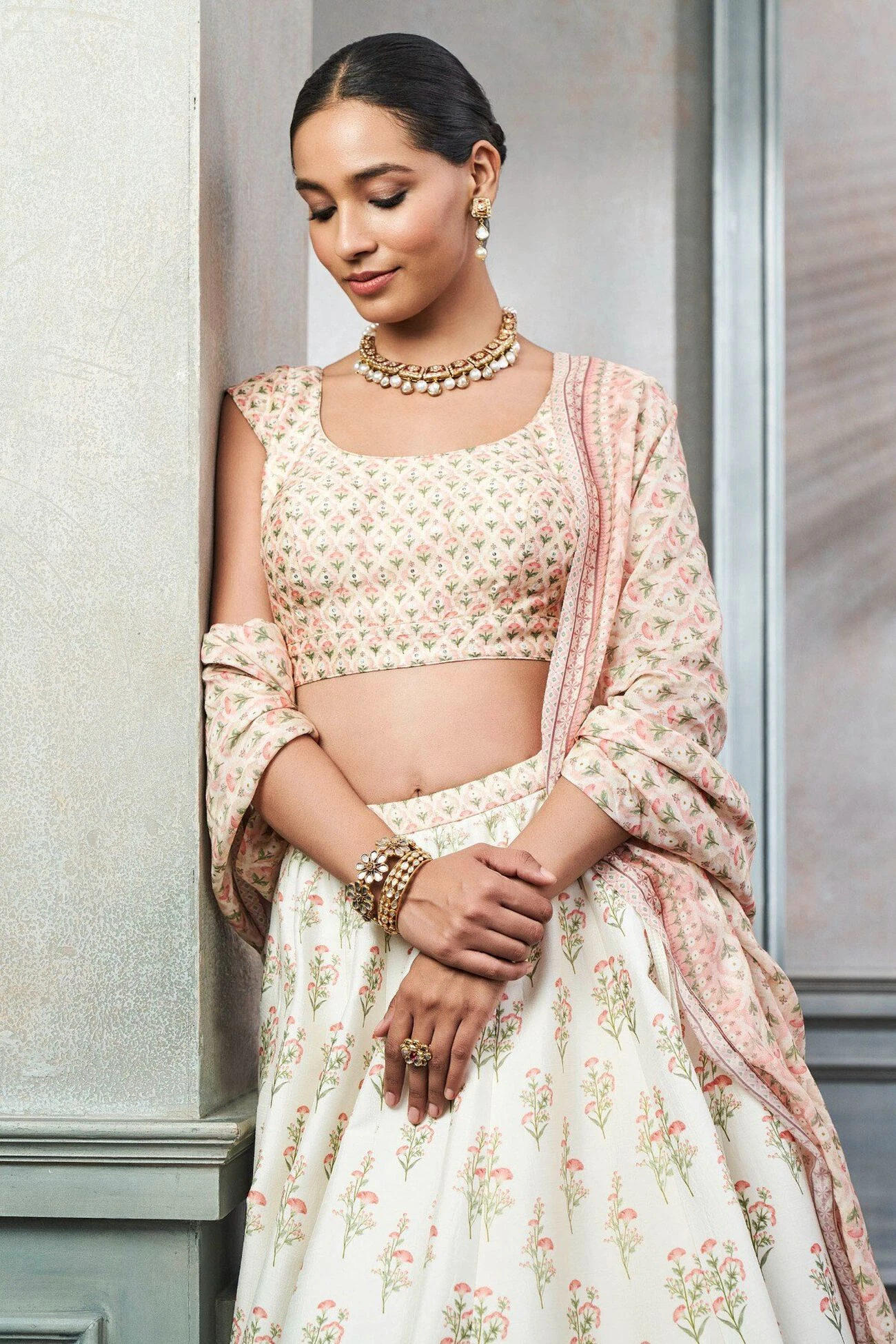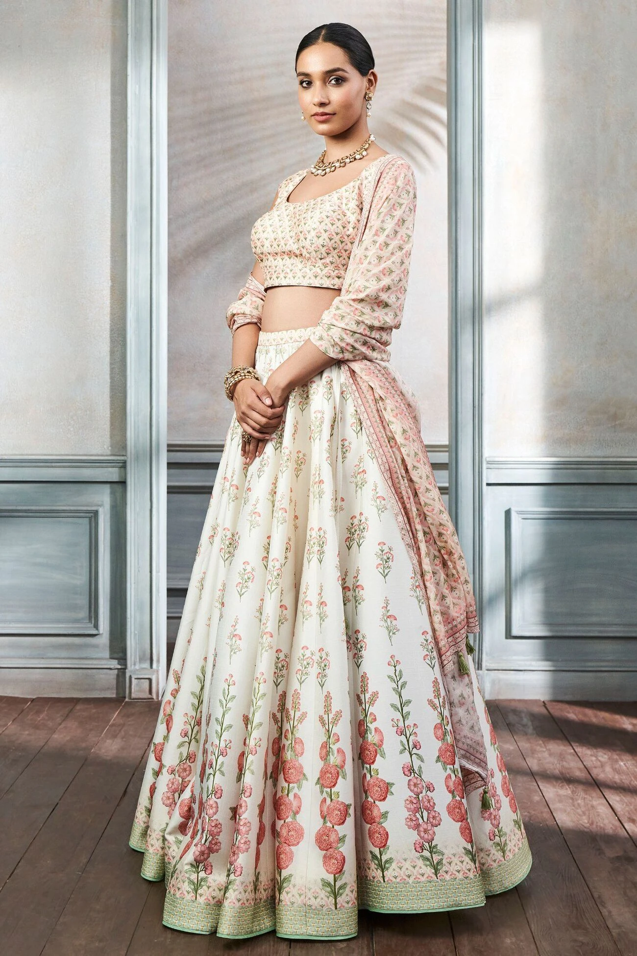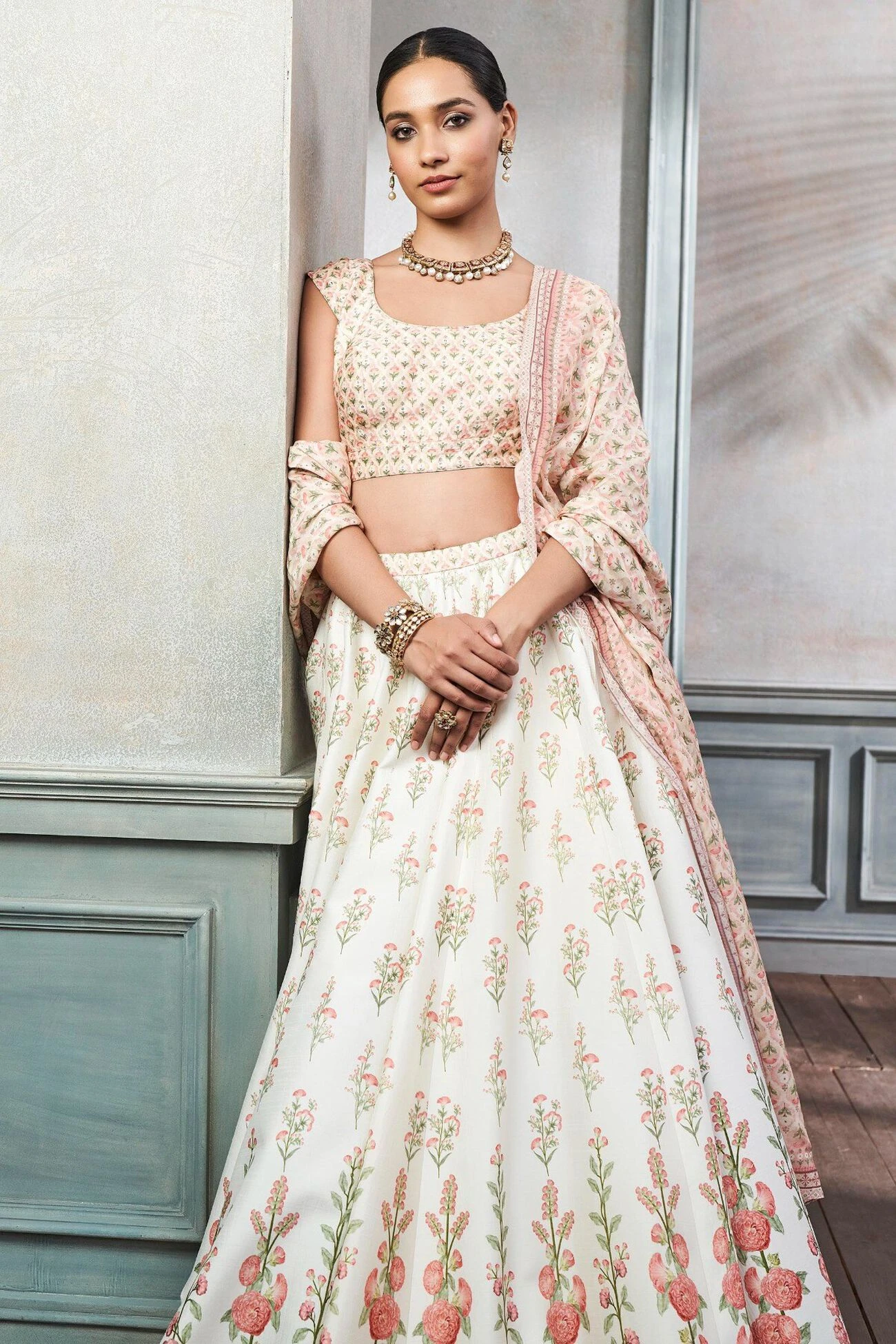 Subtle hues of summer blend with floral motifs of regal Rajasthani gardens in this silk lehenga set. The printed Devanshi set will be your new favourite this season.