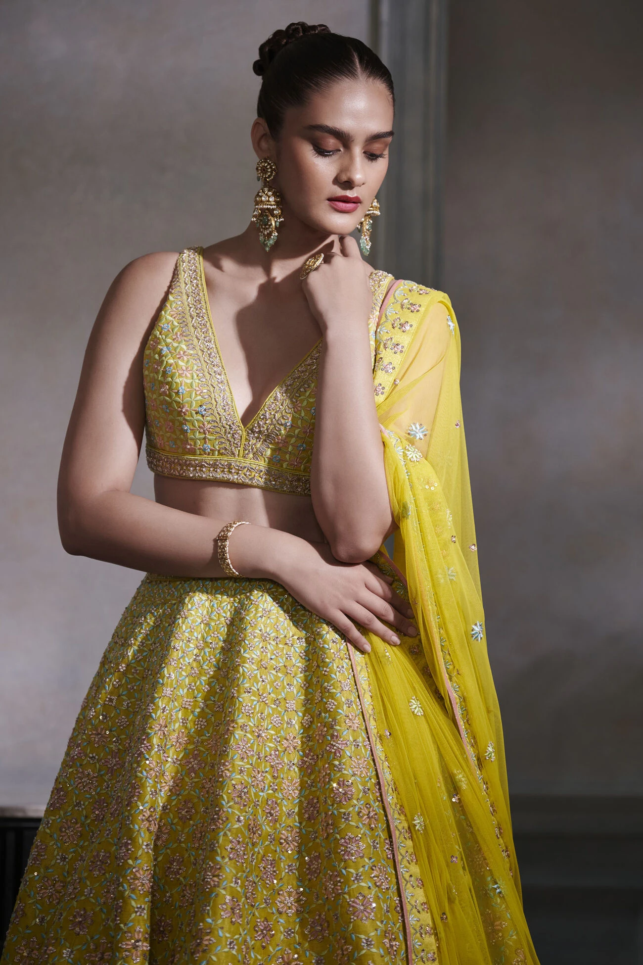 A dazzling lime-hued silk lehenga with twinkling works of signature gota patti hand embroidery along with intricate embellishments featuring resham, pearls and sequins over a vivid canvas. A charming ensemble for your day events. Pockets come included.