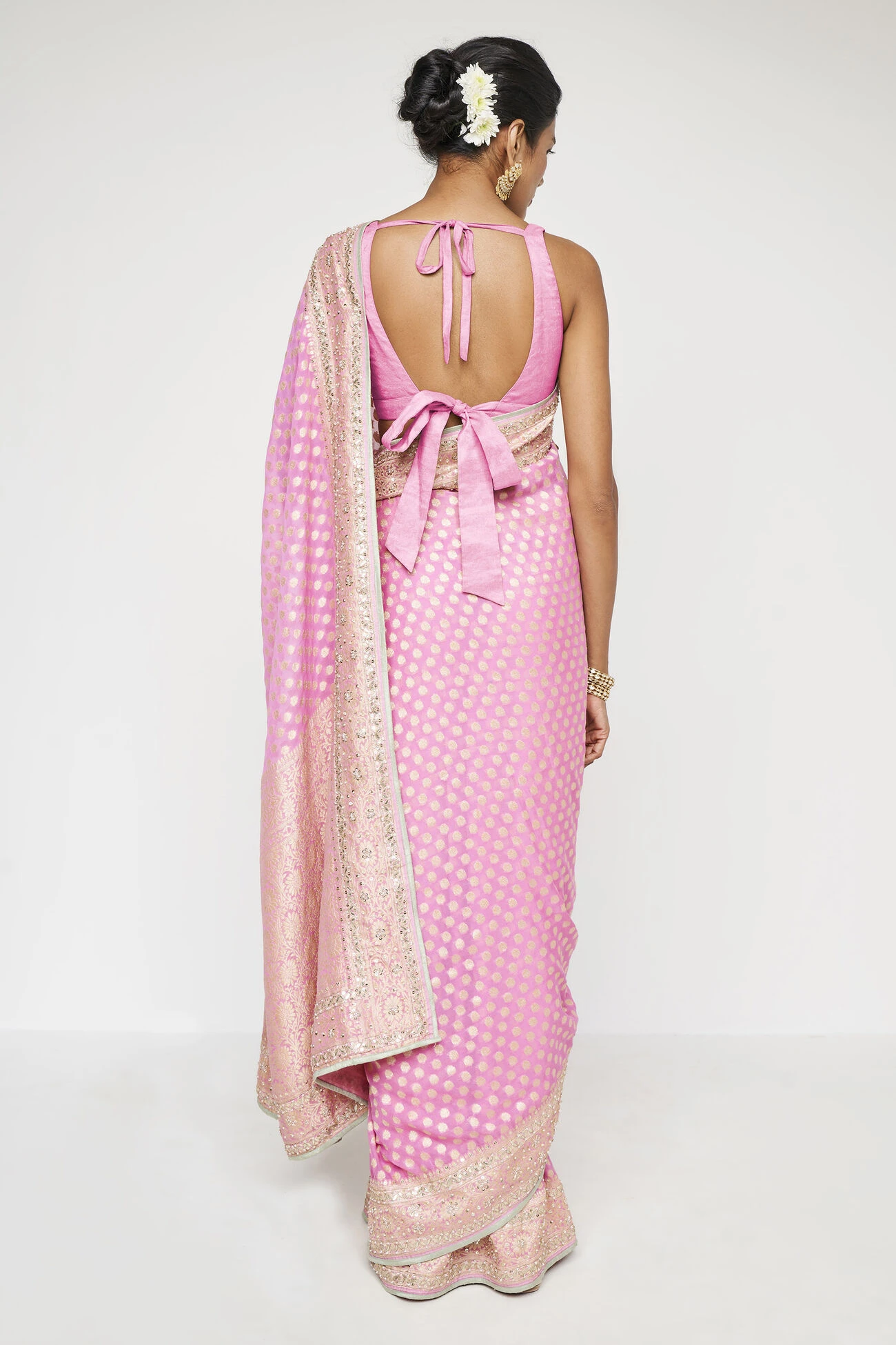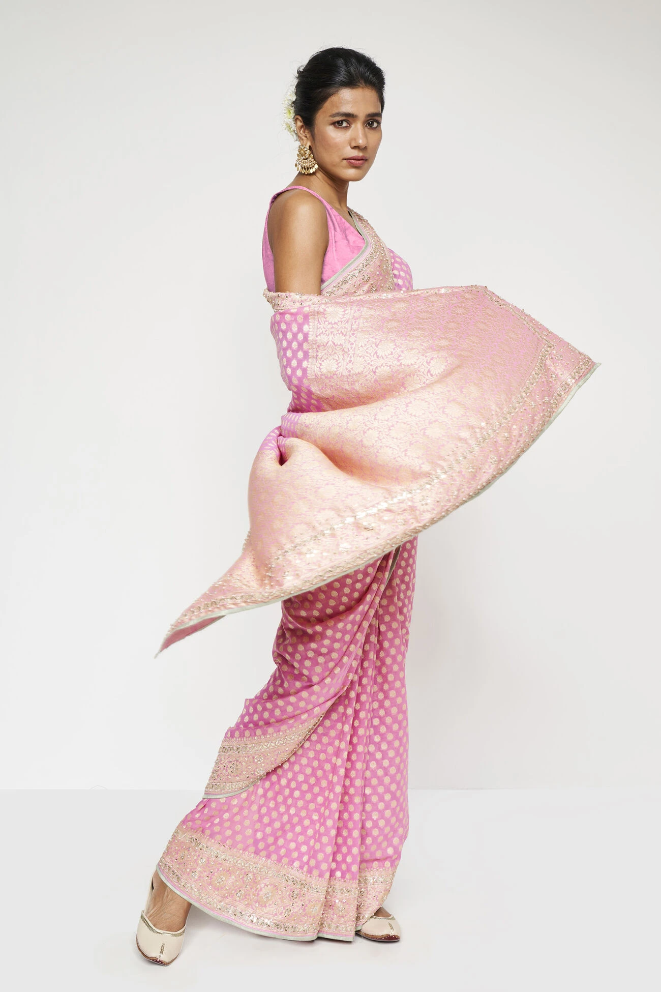 In an elegant Benarasi silk frame, our Ekisha saree features fine floral motifs all over. Handcrafted by artisans, sequins and French knot accents add an exquisite touch.