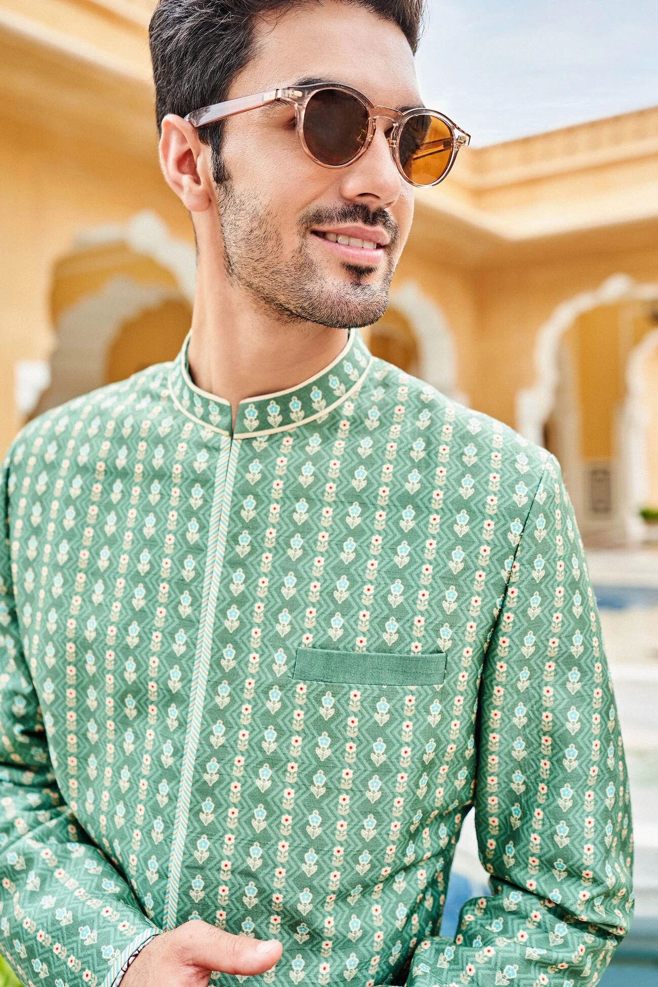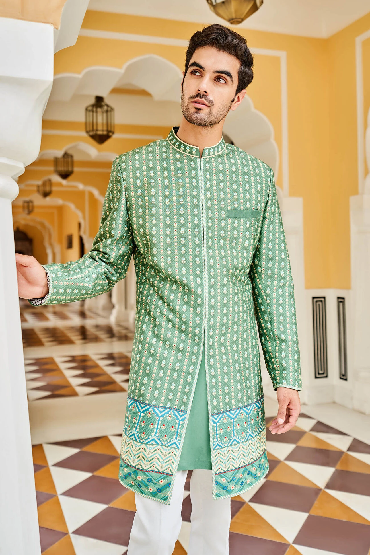 Our Elash sherwani in sage green adds versatility to your wedding wardrobe with a stylish blend of geometric and floral prints. A front pocket and detailed borders frame the piece, making it smart and appropriate for any occasion.