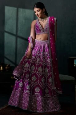 The vivid violet hue of our silk Eshma Lehenga frames ornate floral bouquets with an exquisite composition of our signature gota patti hand embroidery with abundant embellishments including silver pearls, zardozi and works of sequins. Pockets come included.