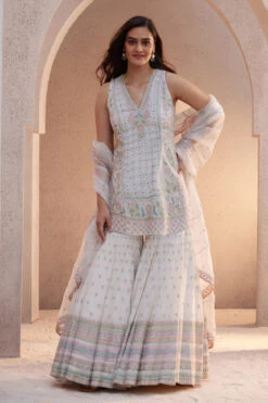 Inspired by palatial gardens, Farhin is crafted for daytime celebrations. Meticulously designed aari embroidery blends beautifully with the ivory tone and elegant silhouette of this ensemble, making it an occasionwear staple.