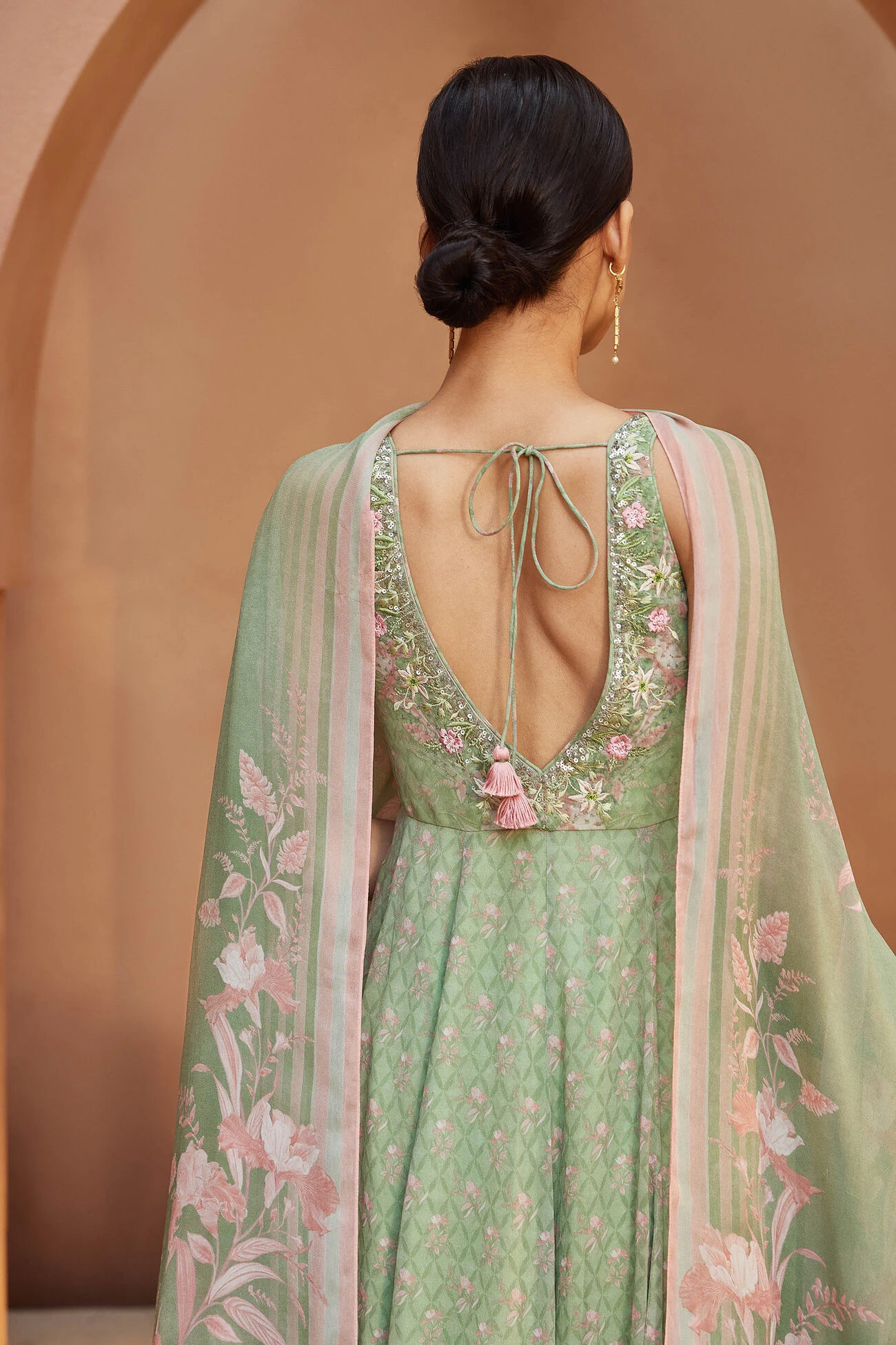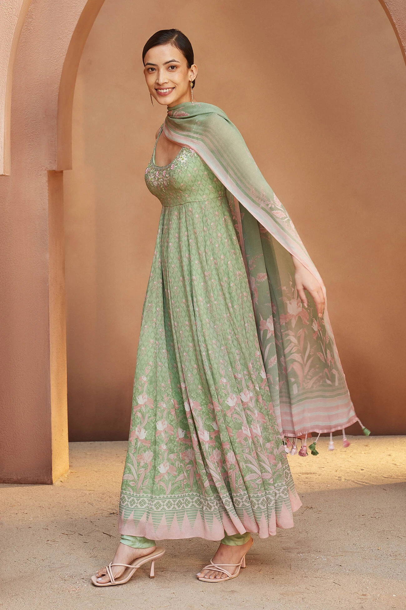 Floriana exudes easy elegance with a contemporary touch. The light-as-air fabric in a palette of pink and green makes it a versatile wear.