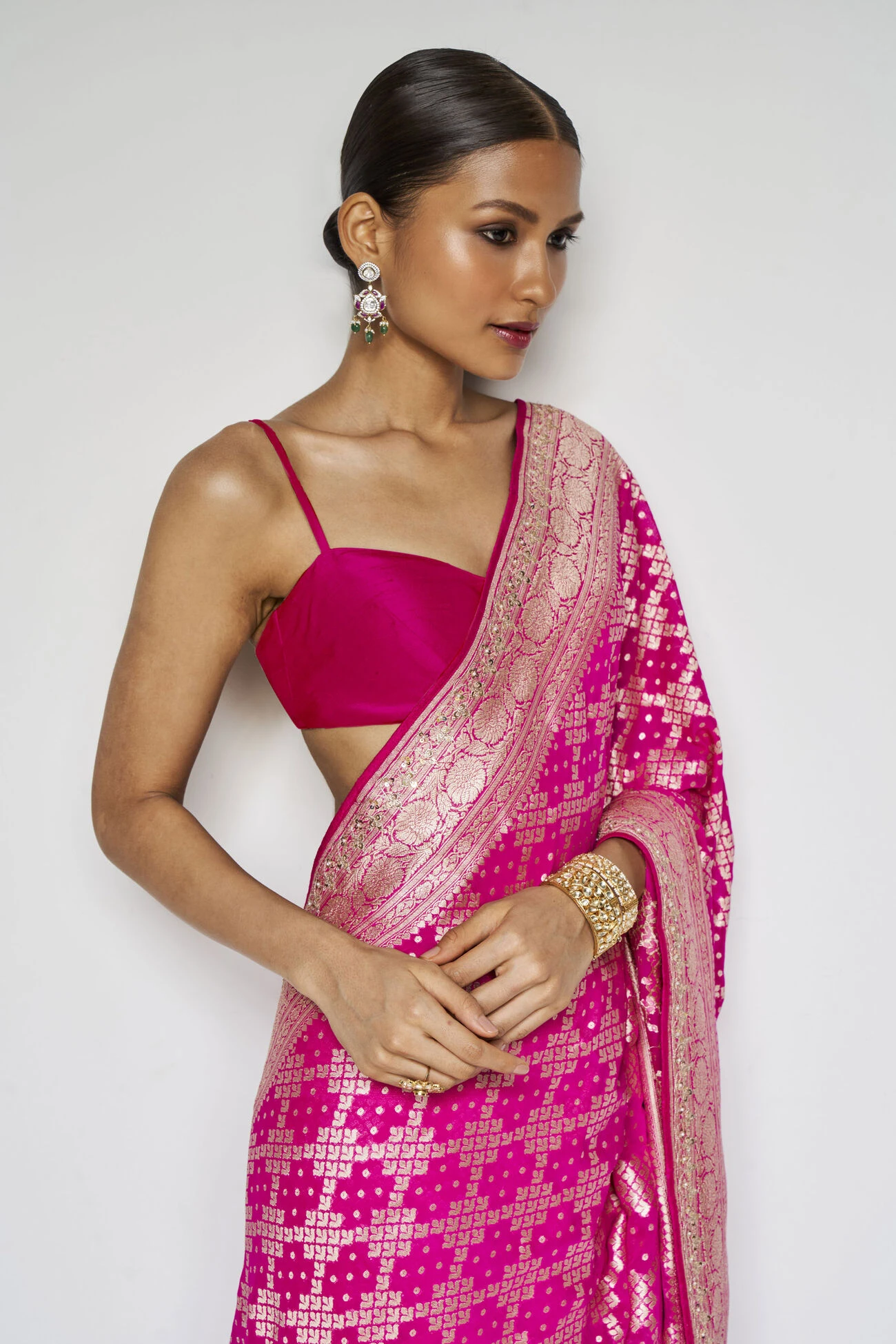 Gul is a resplendent pink saree that is handwoven in Benaras by master artisans. Perfect to make a statement at glamorous soirees.
