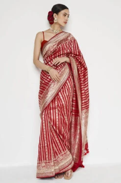 Handcrafted by master artisans in Benarasi silk with intricate sequins, gota patti and french knots needlework. This elite saree deserves a spot in your wedding wardrobe.