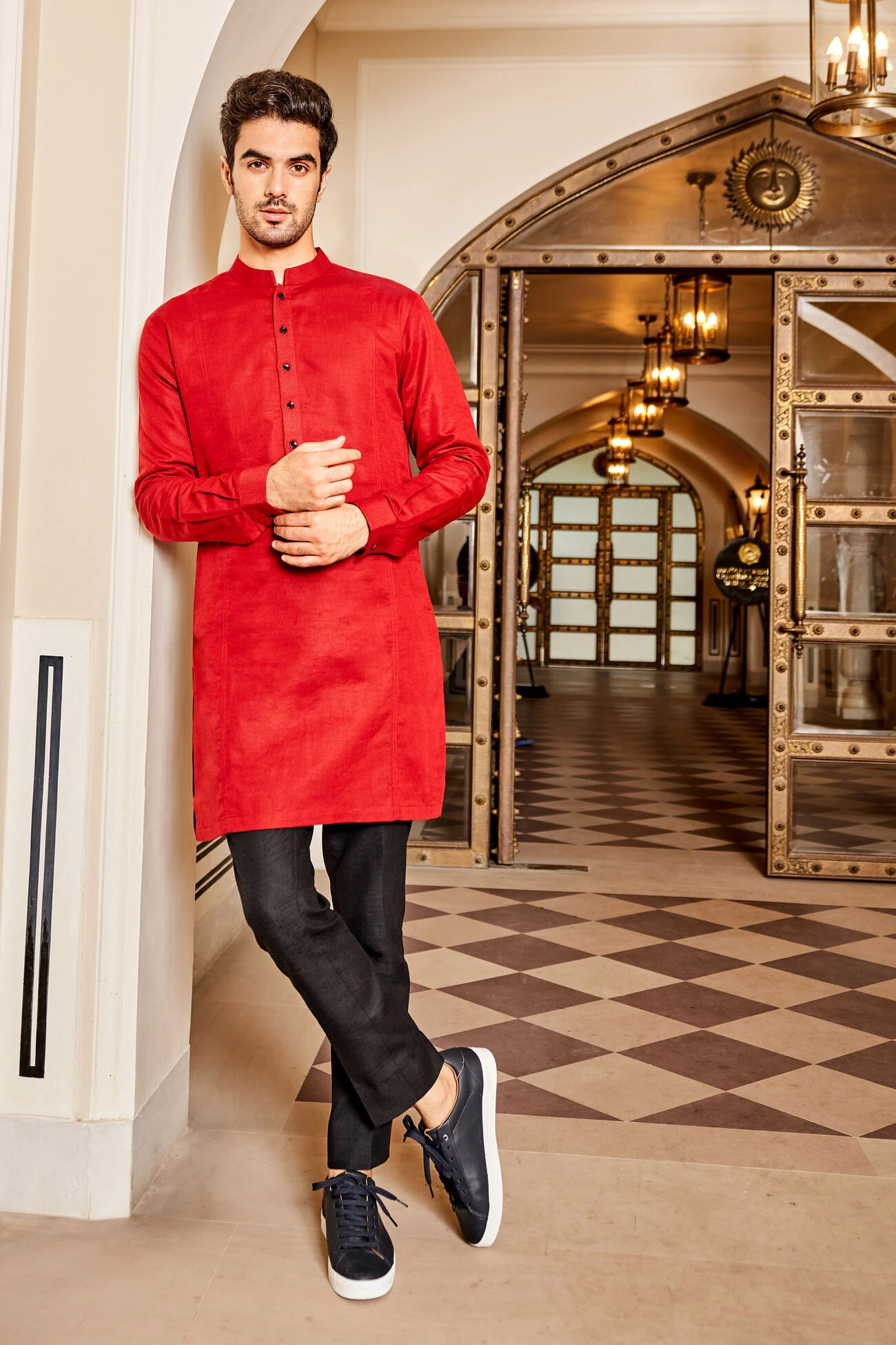 Hridaan kurta in the deepest red hue is enhanced with stitch line detail. Perfect for festive season, this lighthearted kurta will keep you relaxed while upholding the stylish edge
