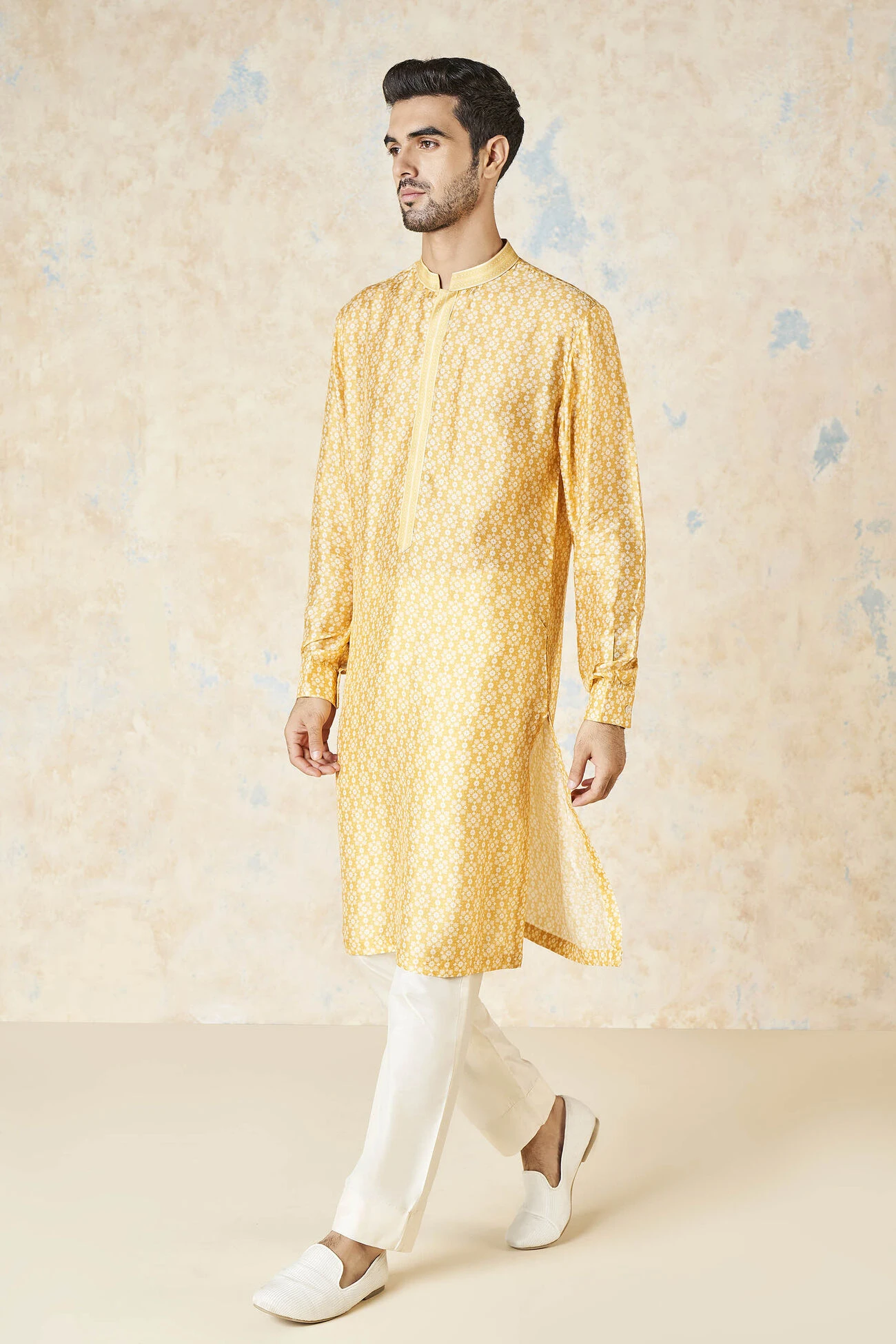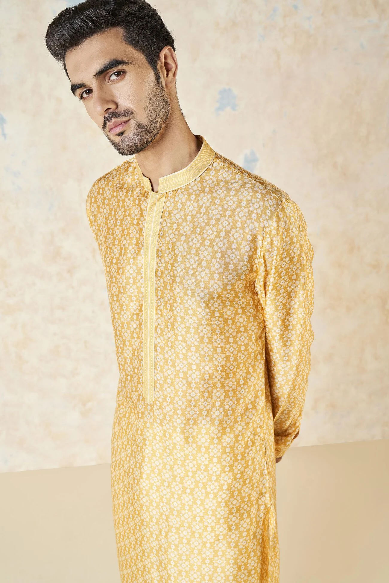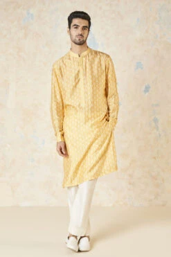Iravan exudes a regal aura with its subtle sheen and mustard color. It is a classic that can be paired with our Nehru jacket, featuring the same print.