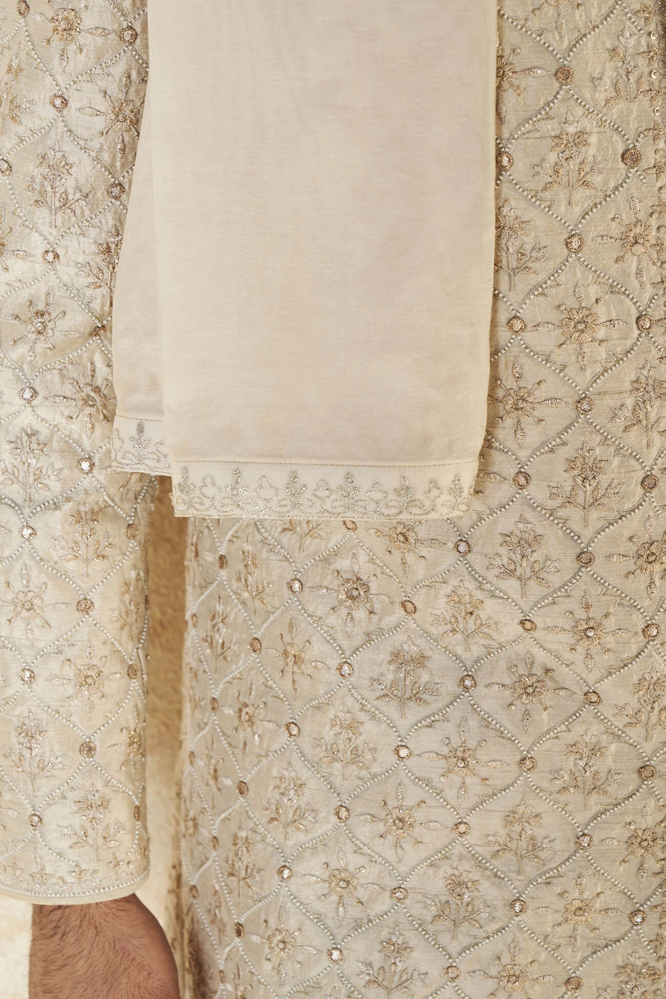 A silk safa in a muted gold shade is perfect for the charismatic groom. Perfect to be paired with any ensemble.