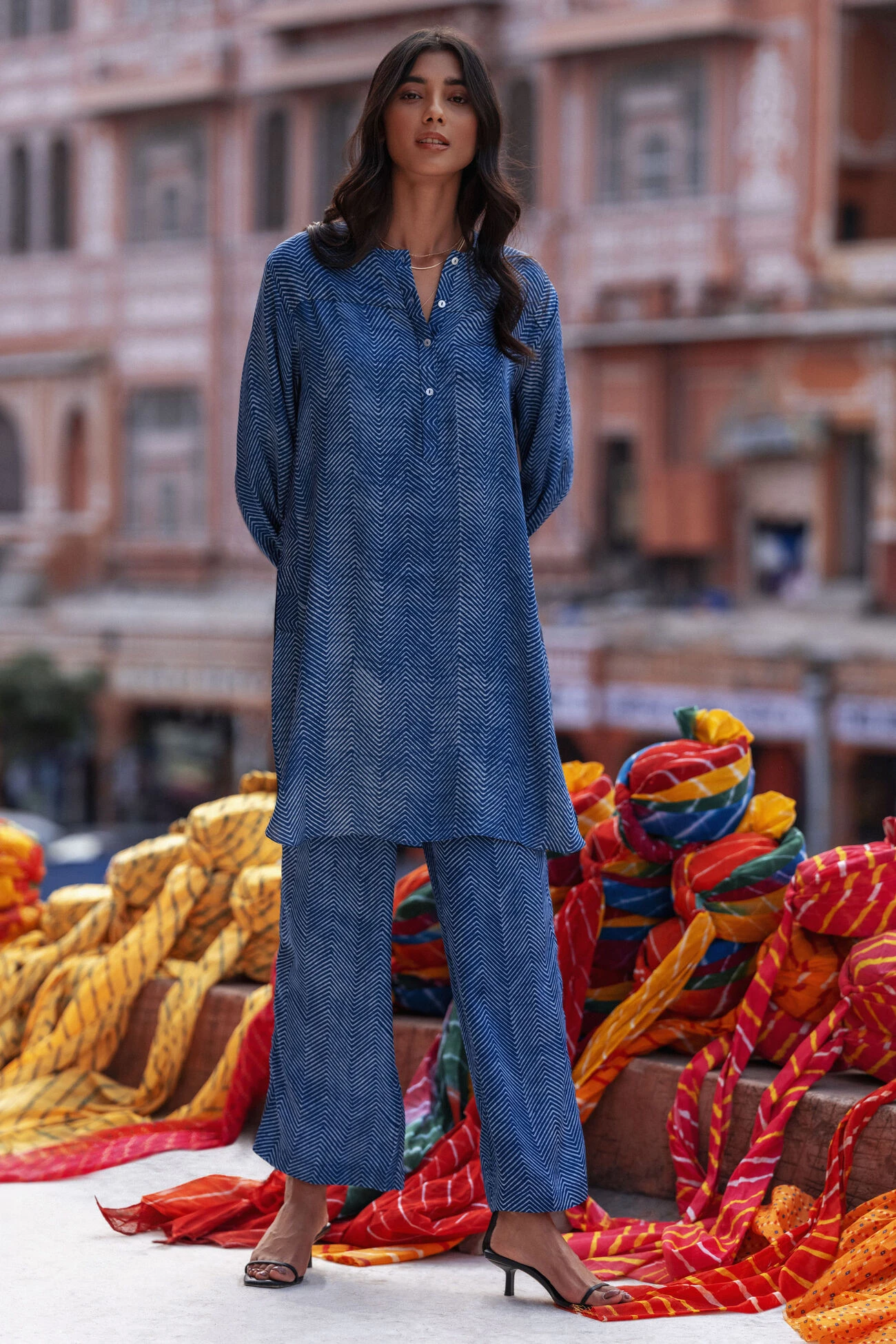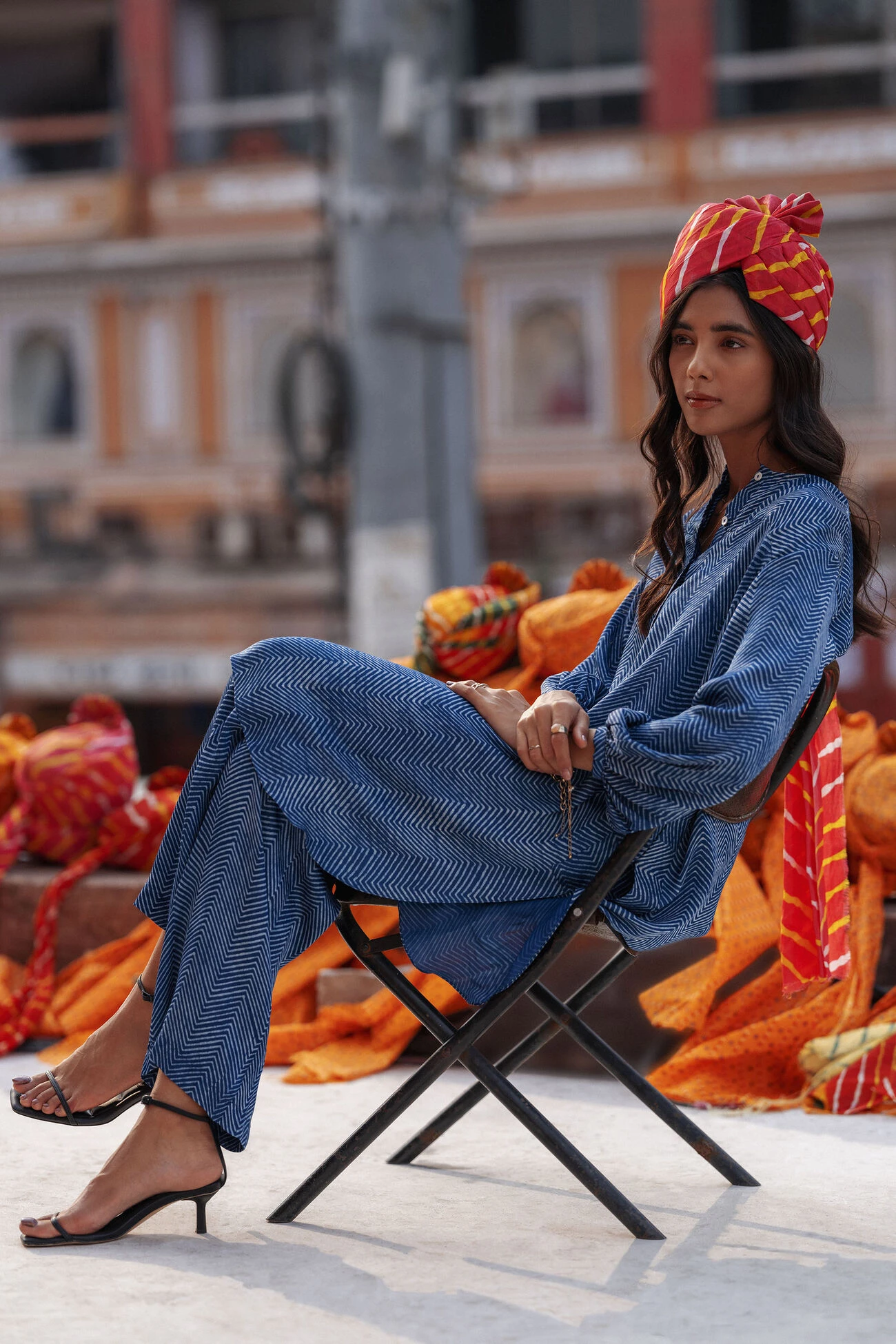 Relaxed frame of the front placket opening tunic and straight trousers makes it ideal for strolling around Rajasthan’s alleyways or touring the palaces. Fit: Relaxed