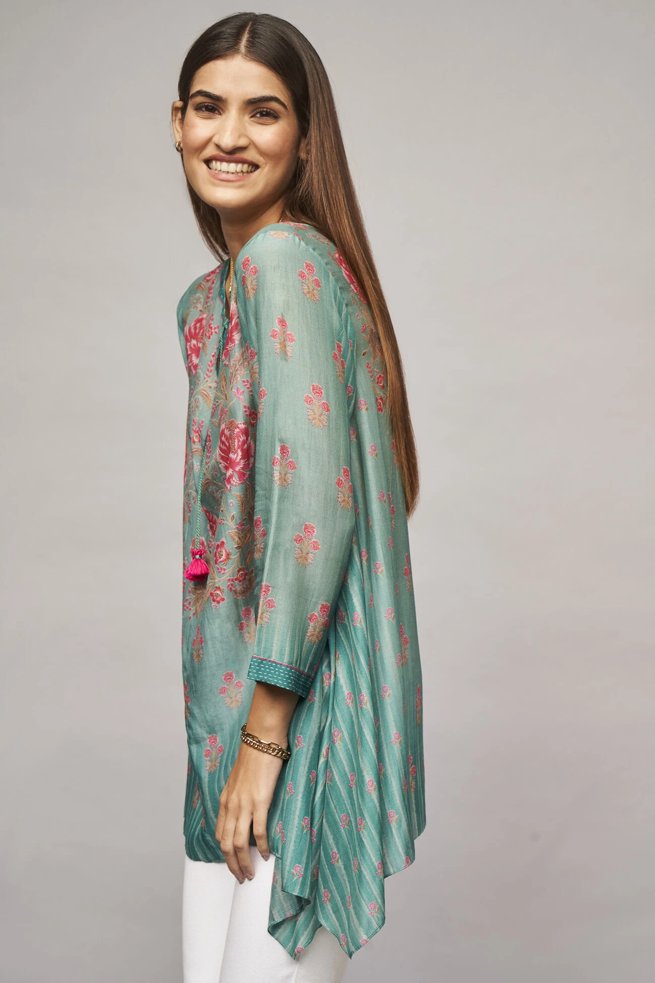 This easy and sustainable Kasia top in sage with digital print all over exudes elegance. With an asymmetrical hemline and tassel accent at the neck, this flowy fit proves to be perfect for noon dates and laid-back settings.