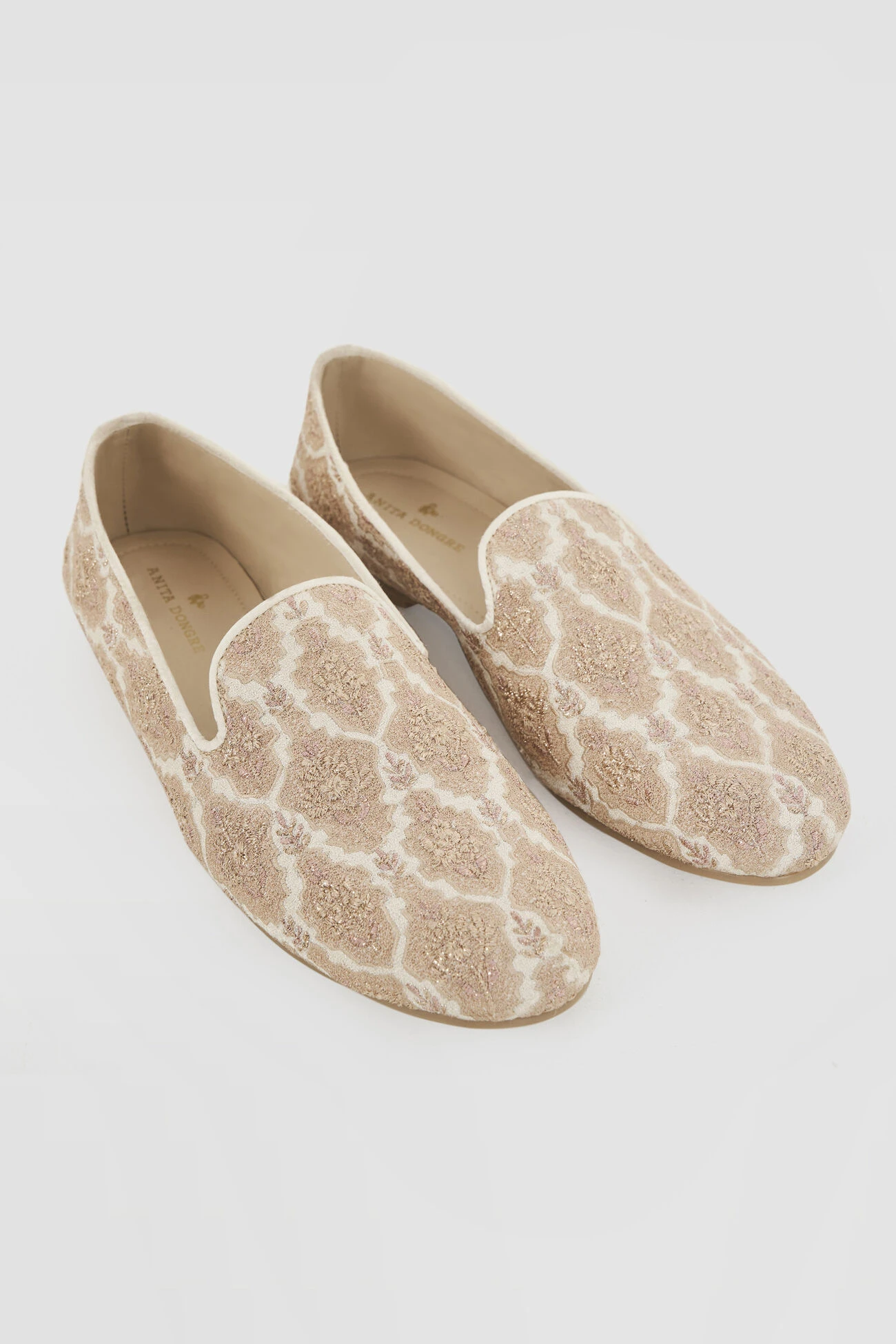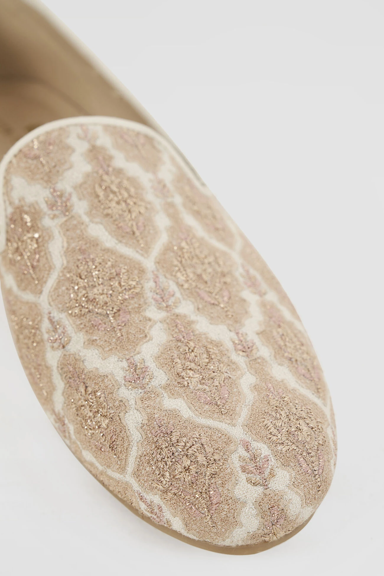 Subtle-toned and sleek, these closed mules are a perfect accessory for the festive season. Detailed with gold and pink embroidery, it has a refined texture.