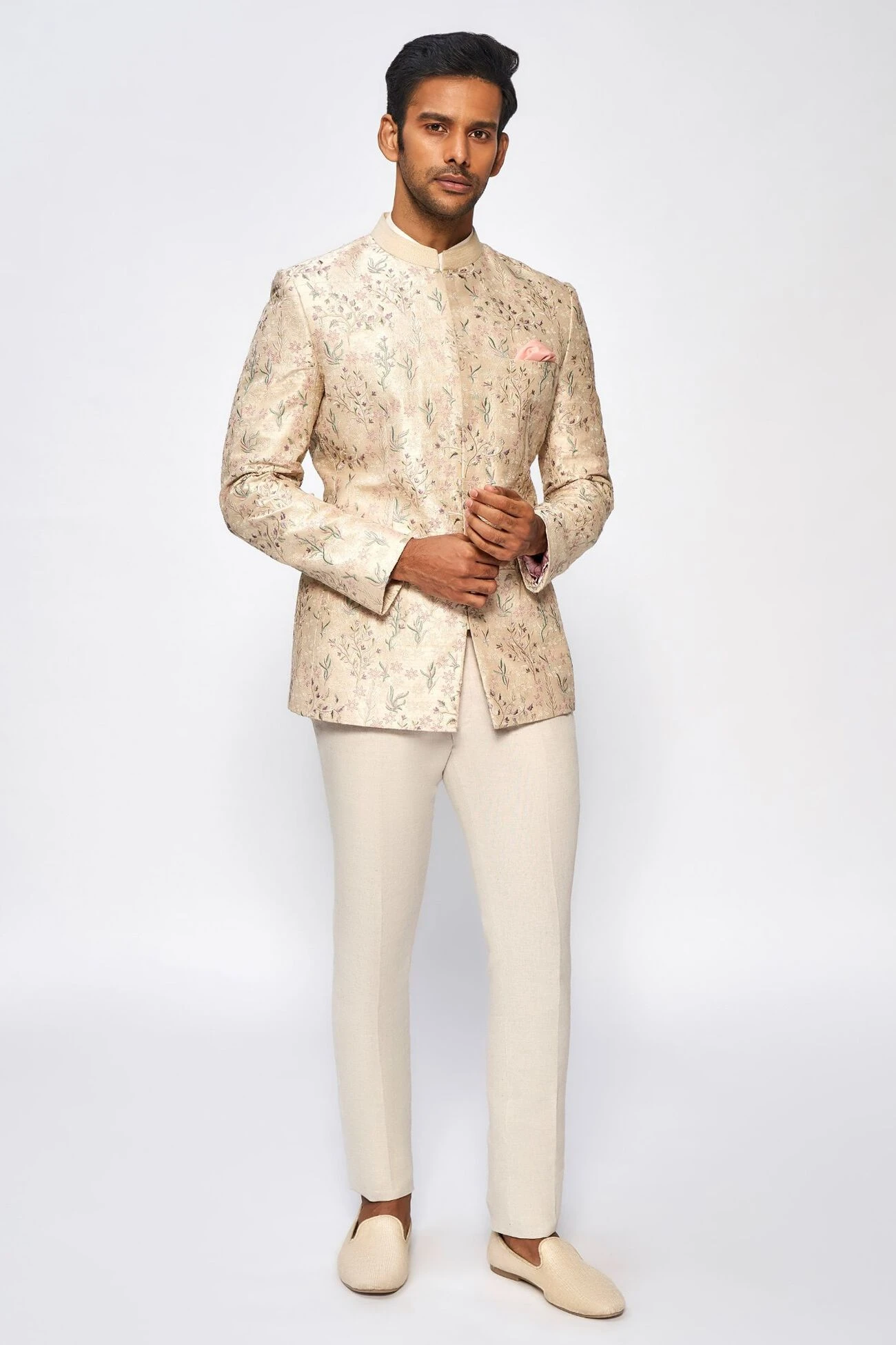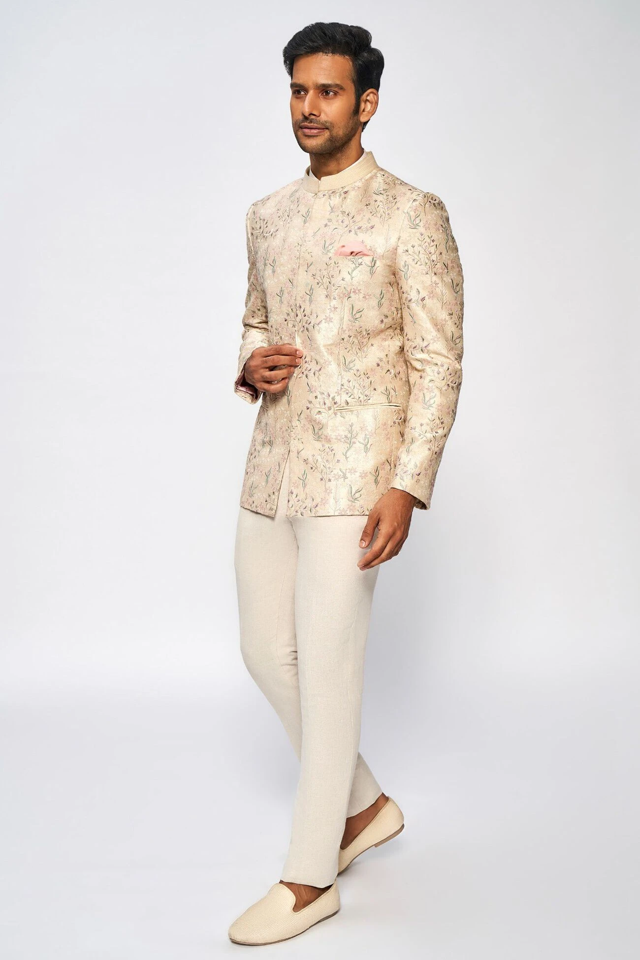 The supremacy of our off-white Bandhgala hails in the detailed multi-thread embroidery. The silken fineness, colourful accents, and muted hue make this piece truly pleasing to the eye. Plus, the front pockets allow you easy accessorization.