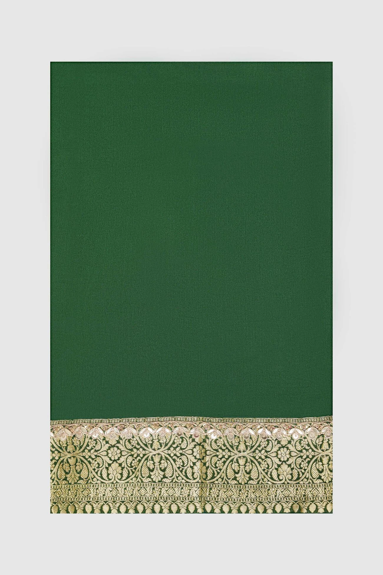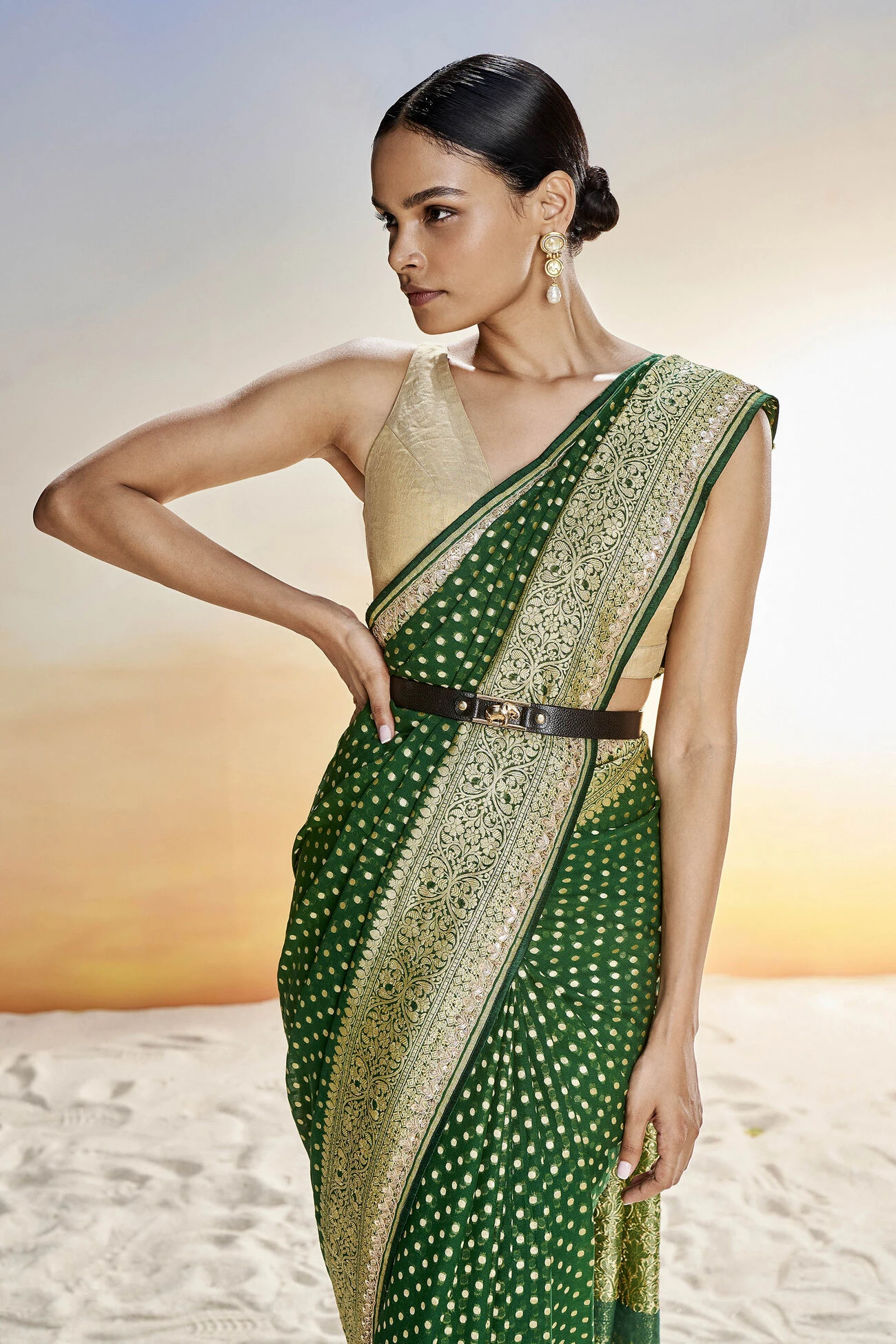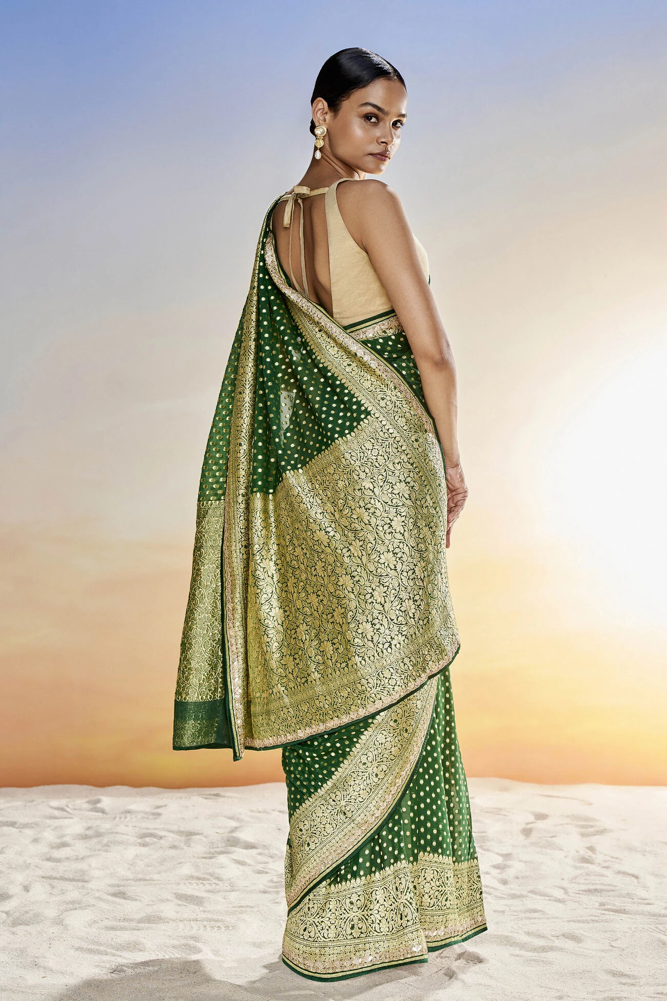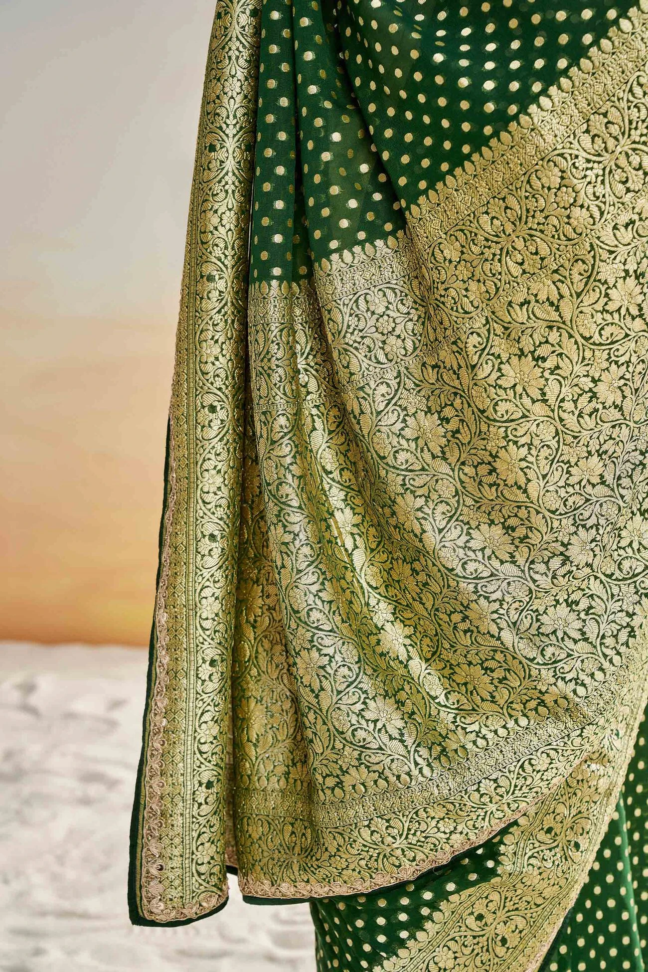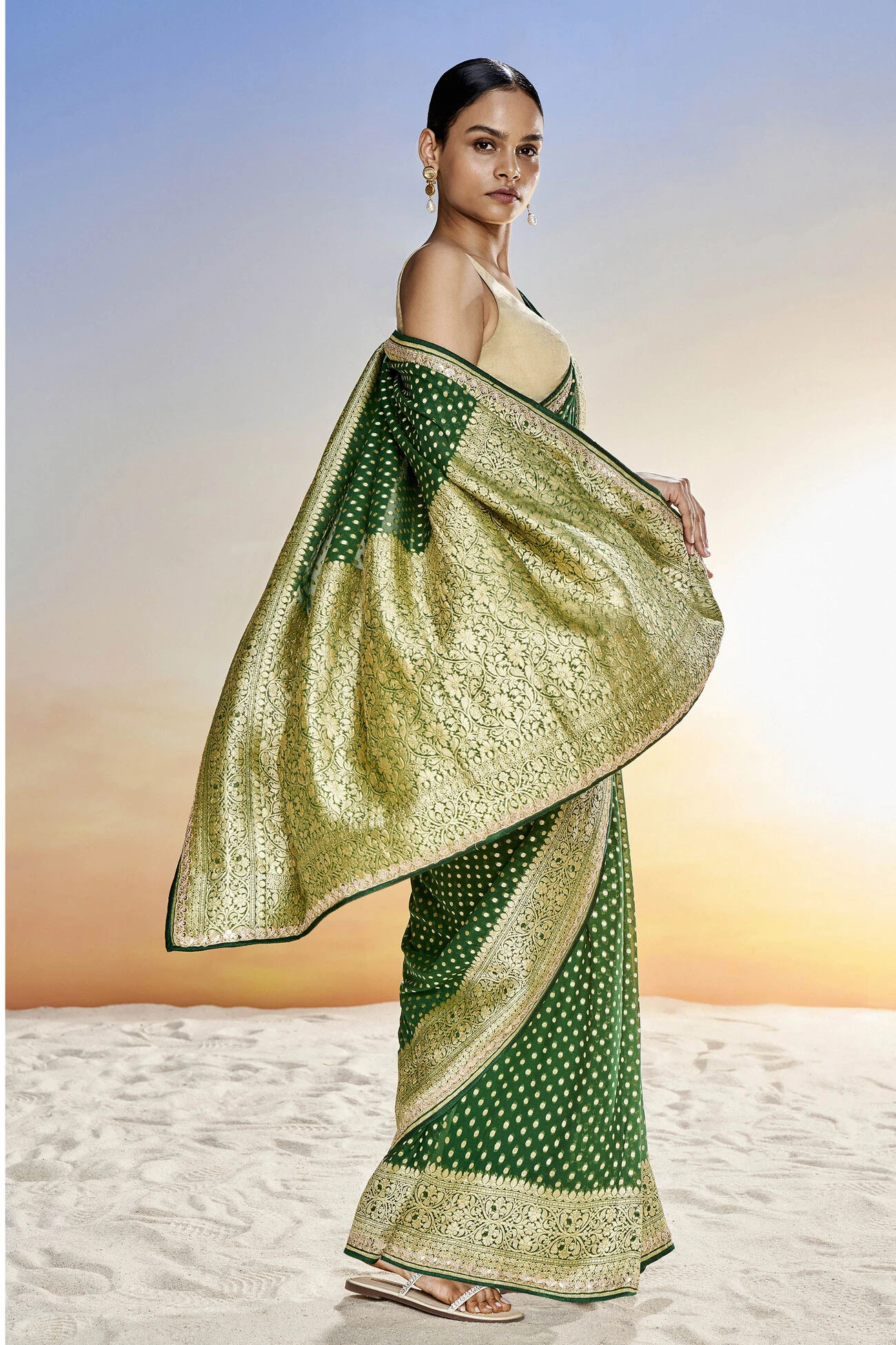 This richly hued green saree features broad embellished borders and fine motifs throughout. With its exquisite Benarasi silk fabric, this drape is something to behold.