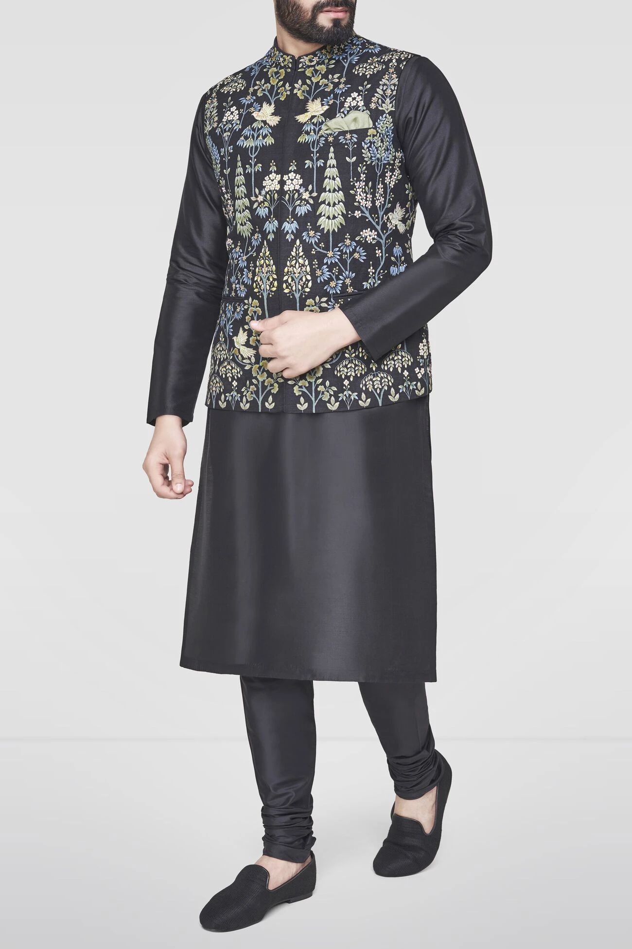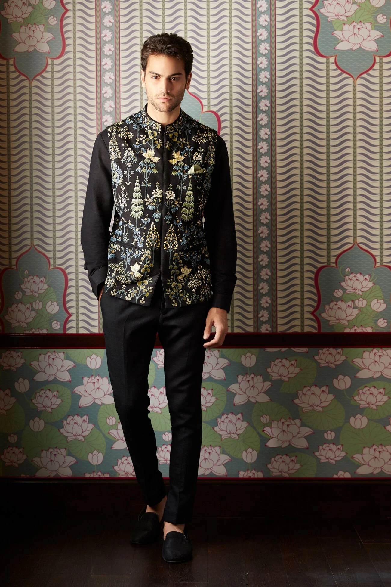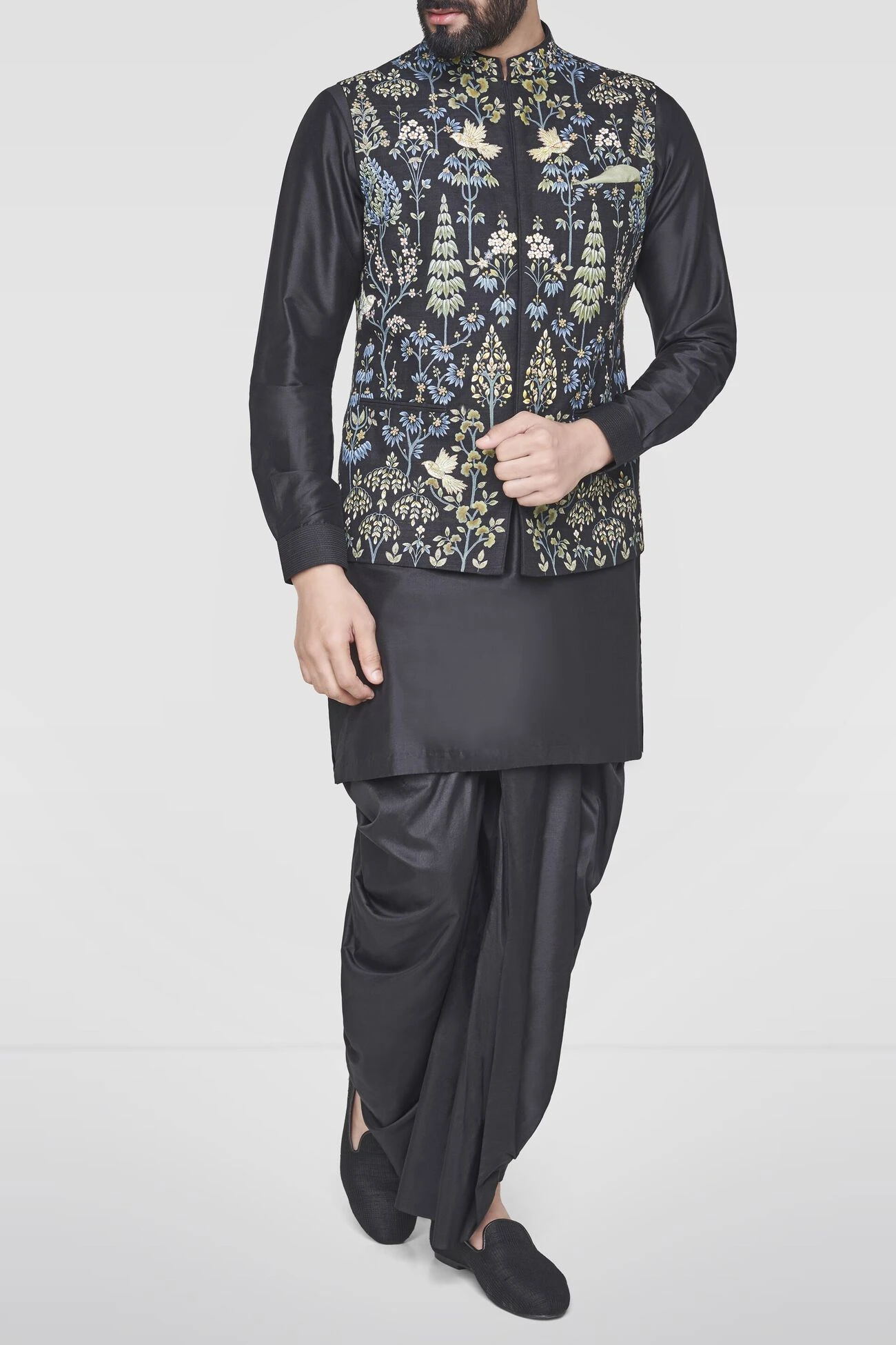 Meticulously painted by hand, by master craftsmen trained in the ancient art form of pichhwai painting. The black Lohit Bandi is crafted from handwoven silk and is touched up with hand embroideryand, featuring a concealed placket.