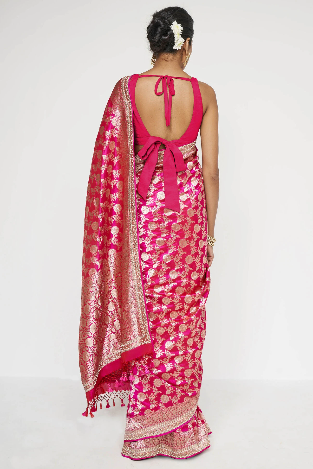 Our Madhurima saree is handwoven in Benaras. With its intricate embroidery and striking pink expression, it is a perfect choice for weddings.