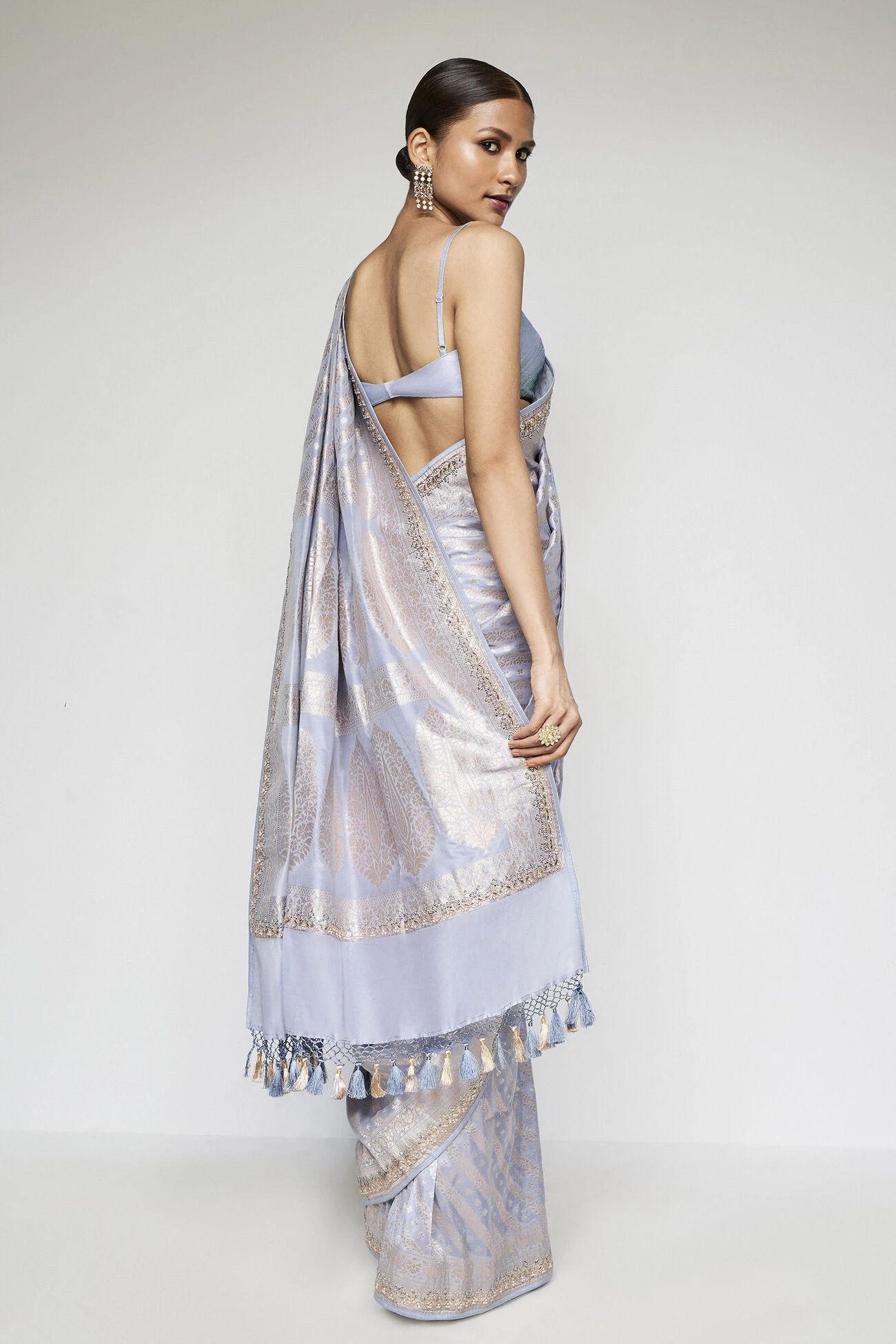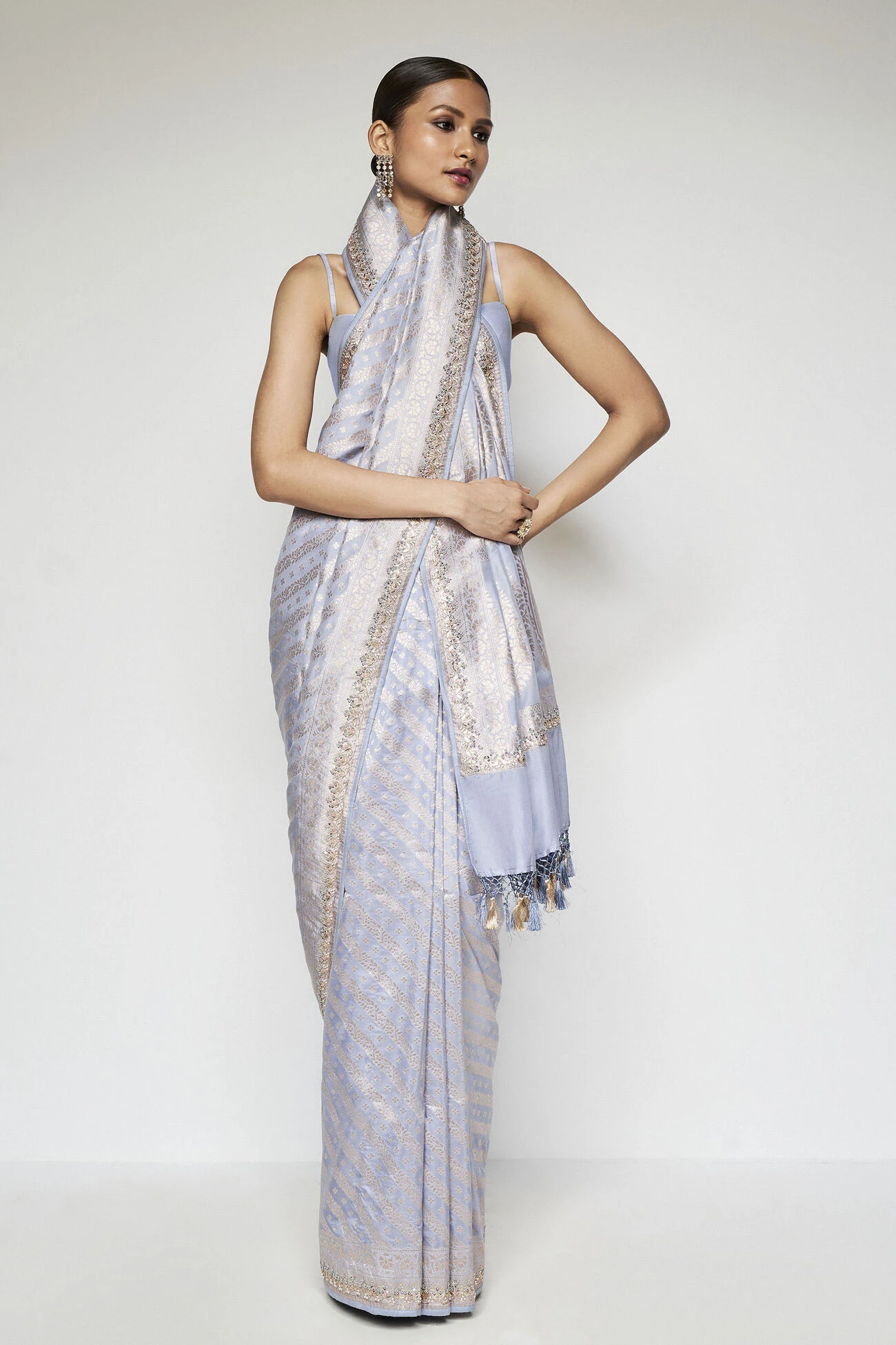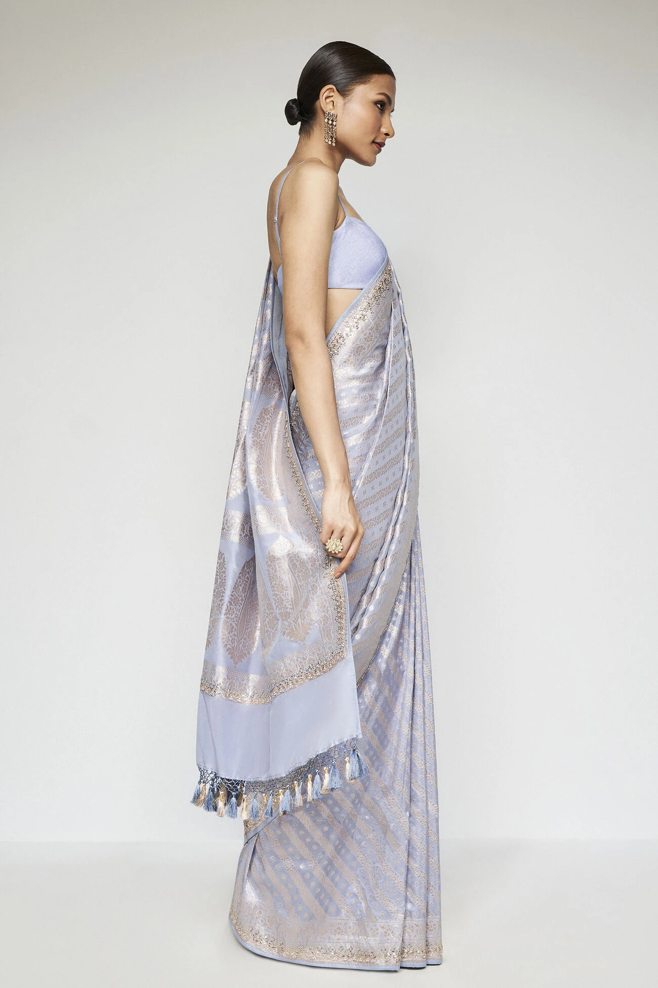 Handwoven in Benaras by master artisans, our Madhusmita saree is perfect for wedding ceremonies. The drama of silken pink is enhanced by glimmering sequin embroidery.