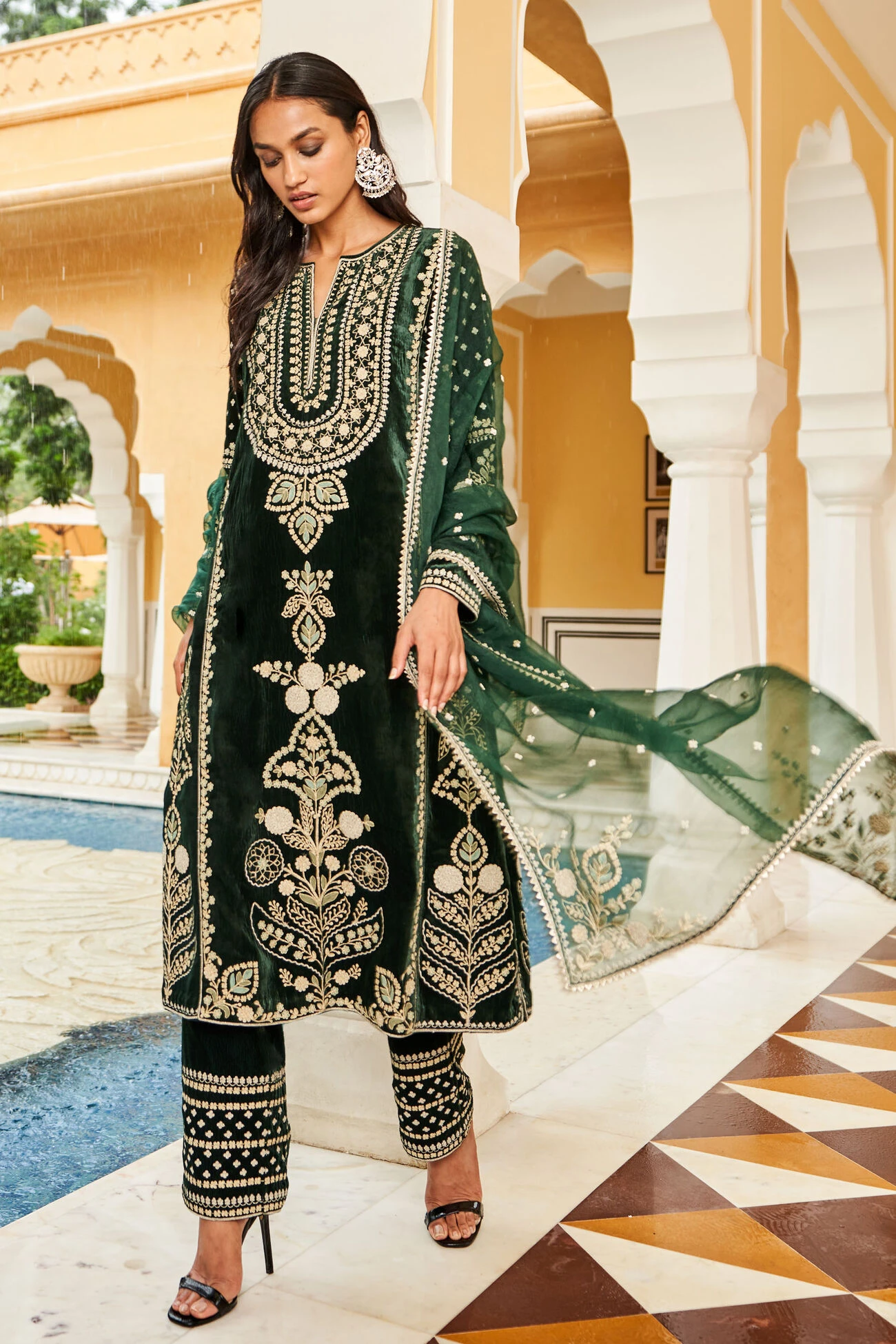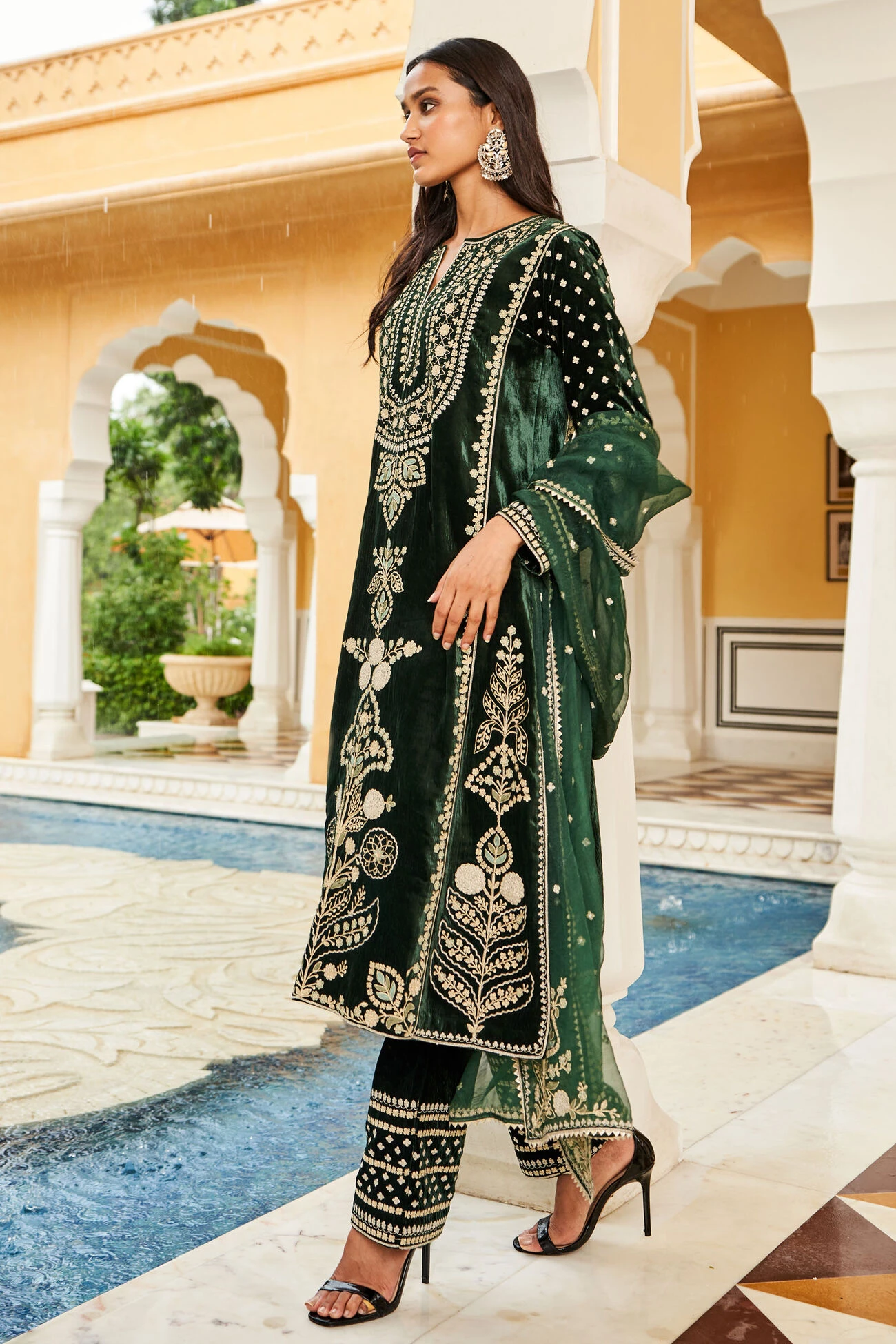 A plush velvet suit set that is perfect for winter weddings. Crafted elegantly with golden cord embroidery, the Mahnoor suit set is a classic ensemble that will elevate your look instantly.
