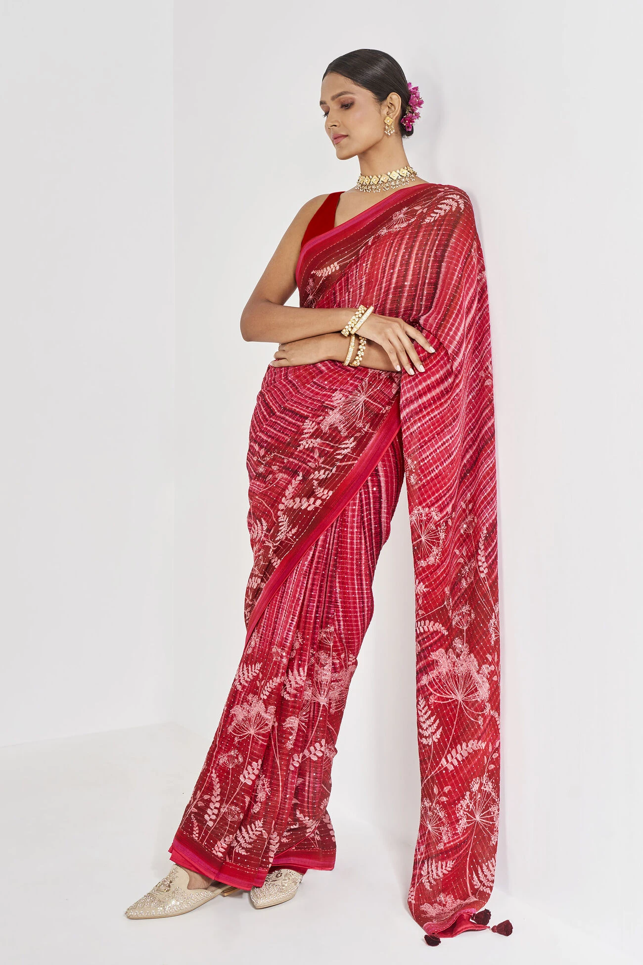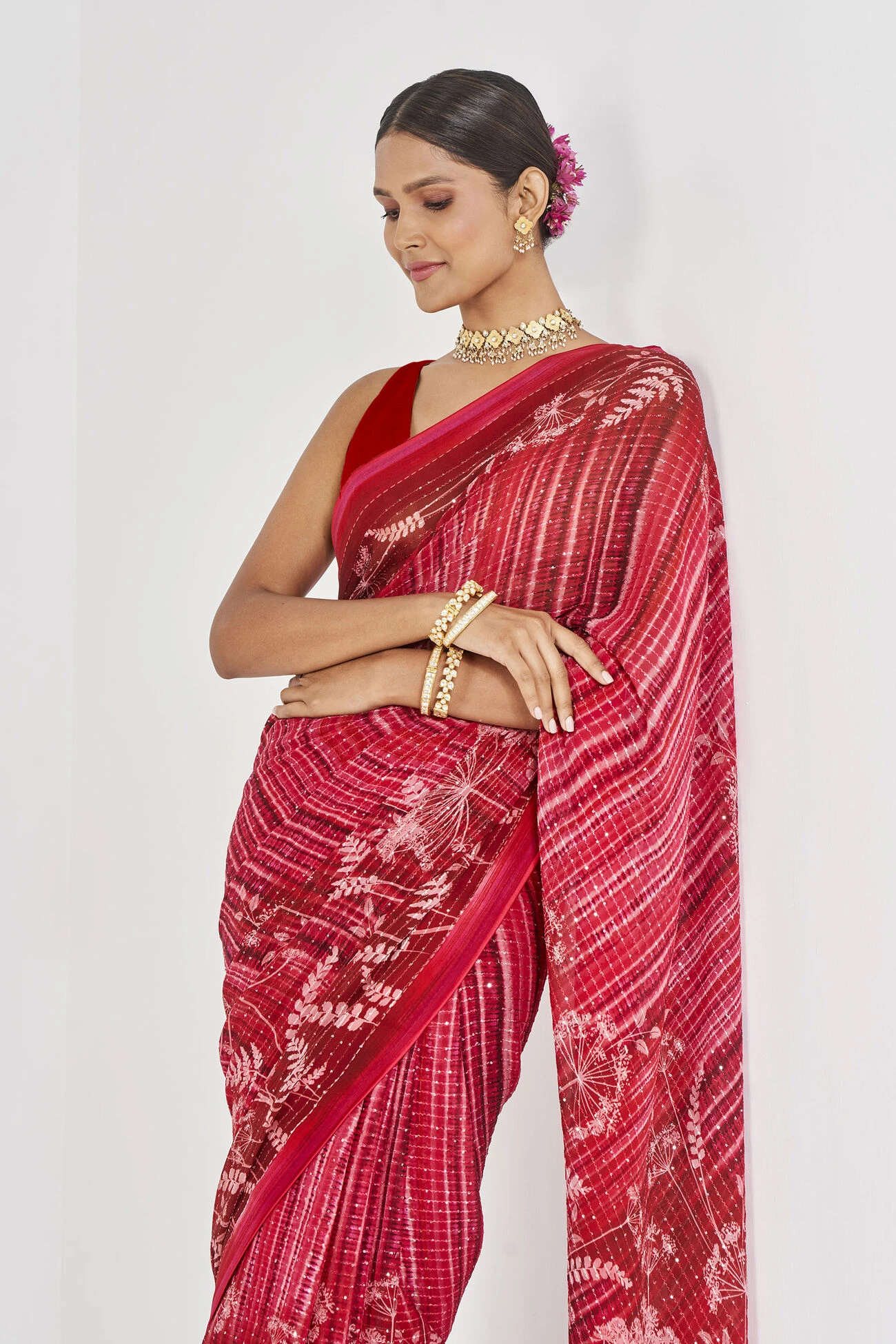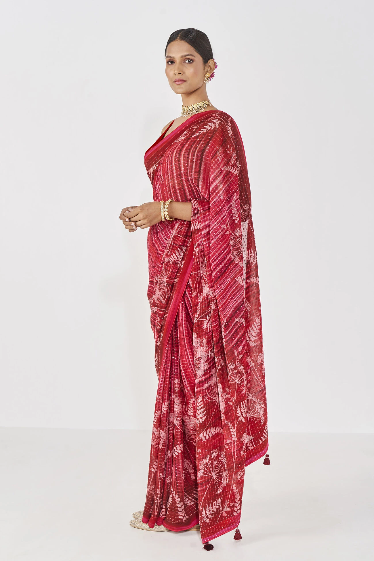 Make a fierce statement in this red saree that whispers laidback luxury. Made of sustainable fibres, the bold floral prints wrapped all over the airy georgette ensure it wears well with the occasion dress code.