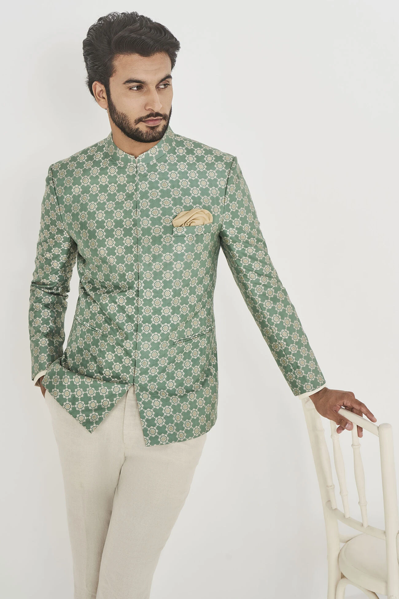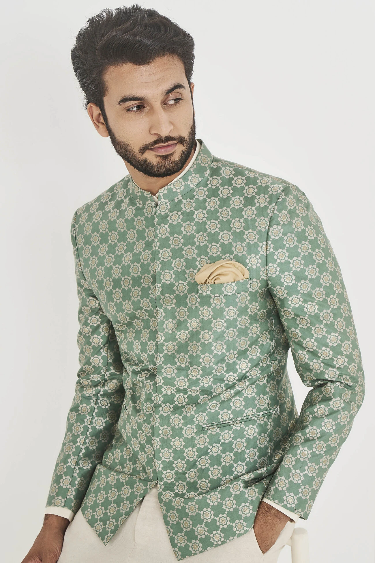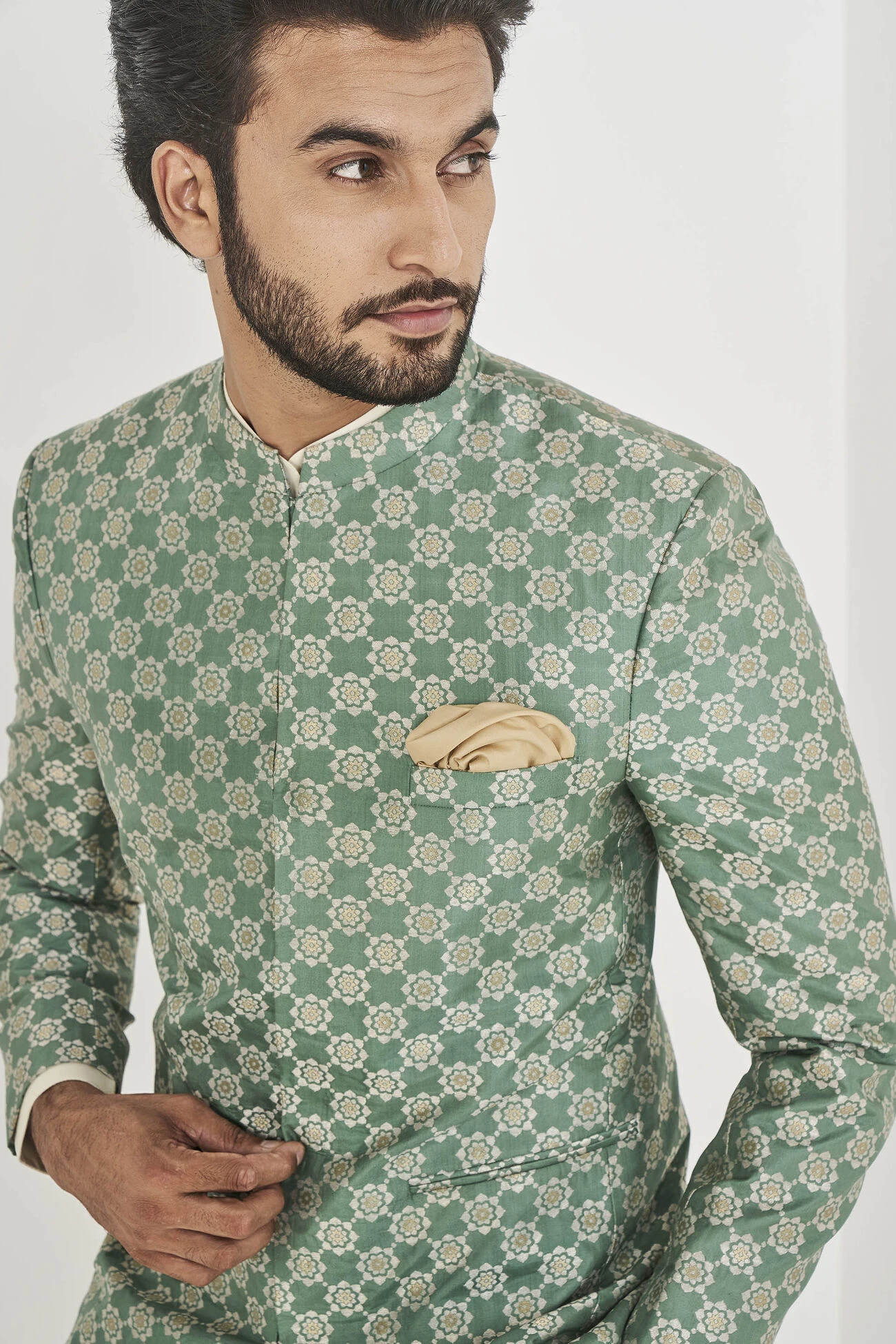 Some silhouettes are classics for a reason. Like our Mir Bandhgala in sage green silk. Perfect for any formal occasion, it is the wardrobe classic you cannot live without.