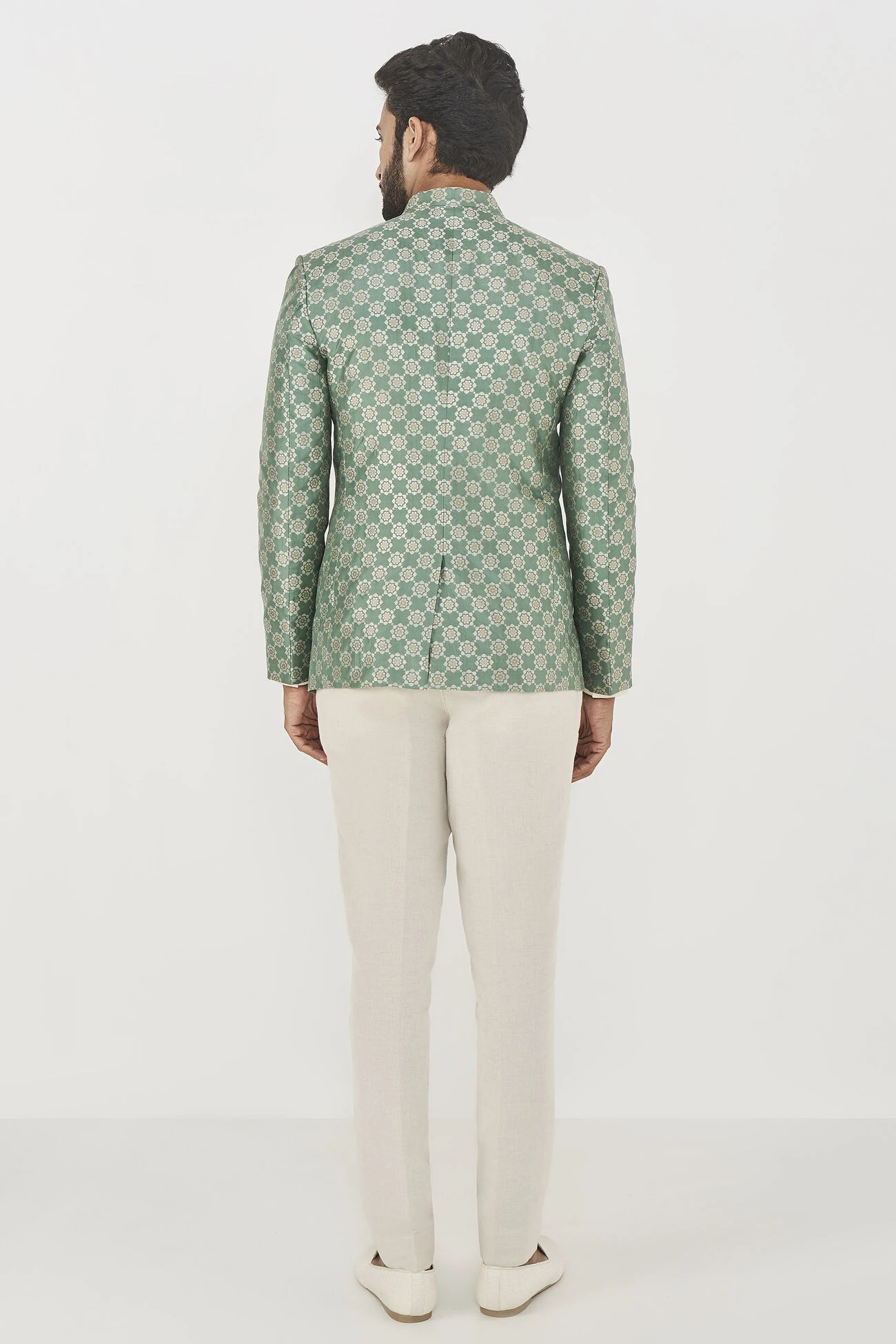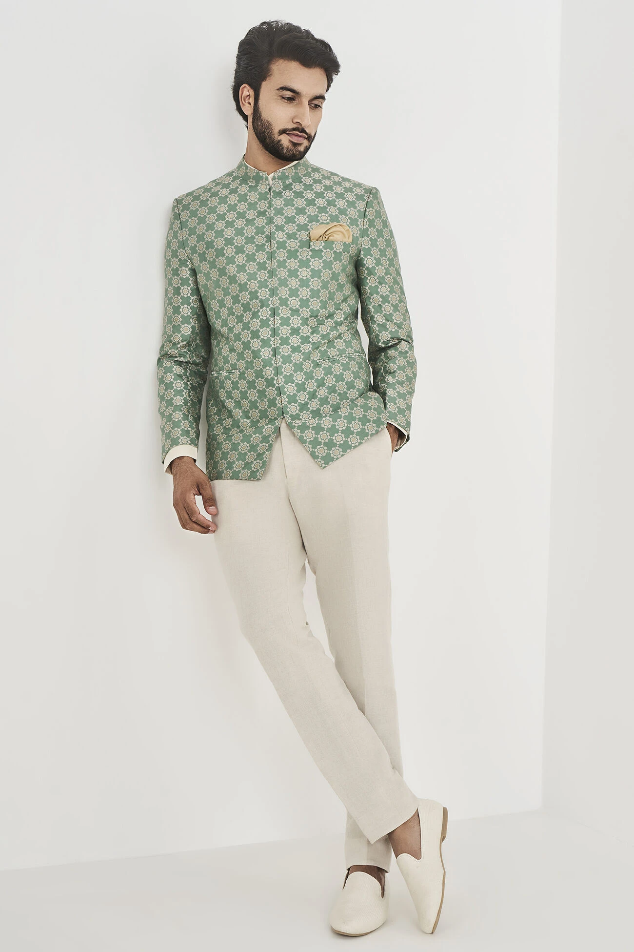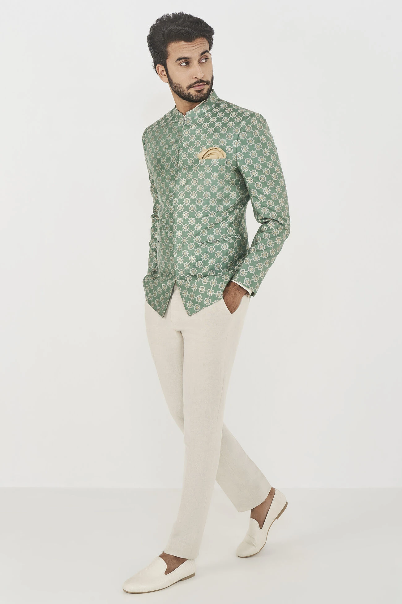 Some silhouettes are classics for a reason. Like our Mir Bandhgala in sage green silk. Perfect for any formal occasion, it is the wardrobe classic you cannot live without.