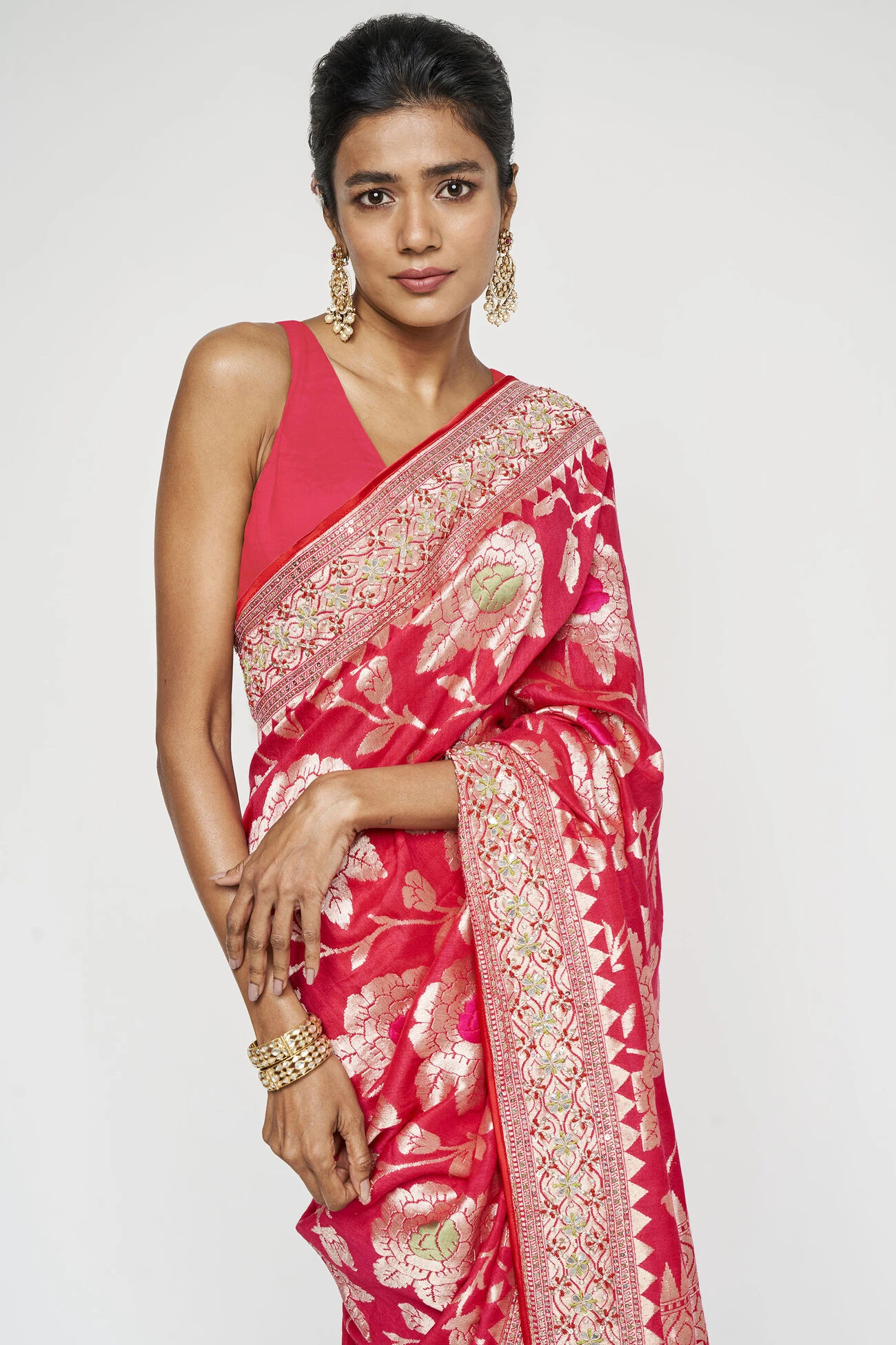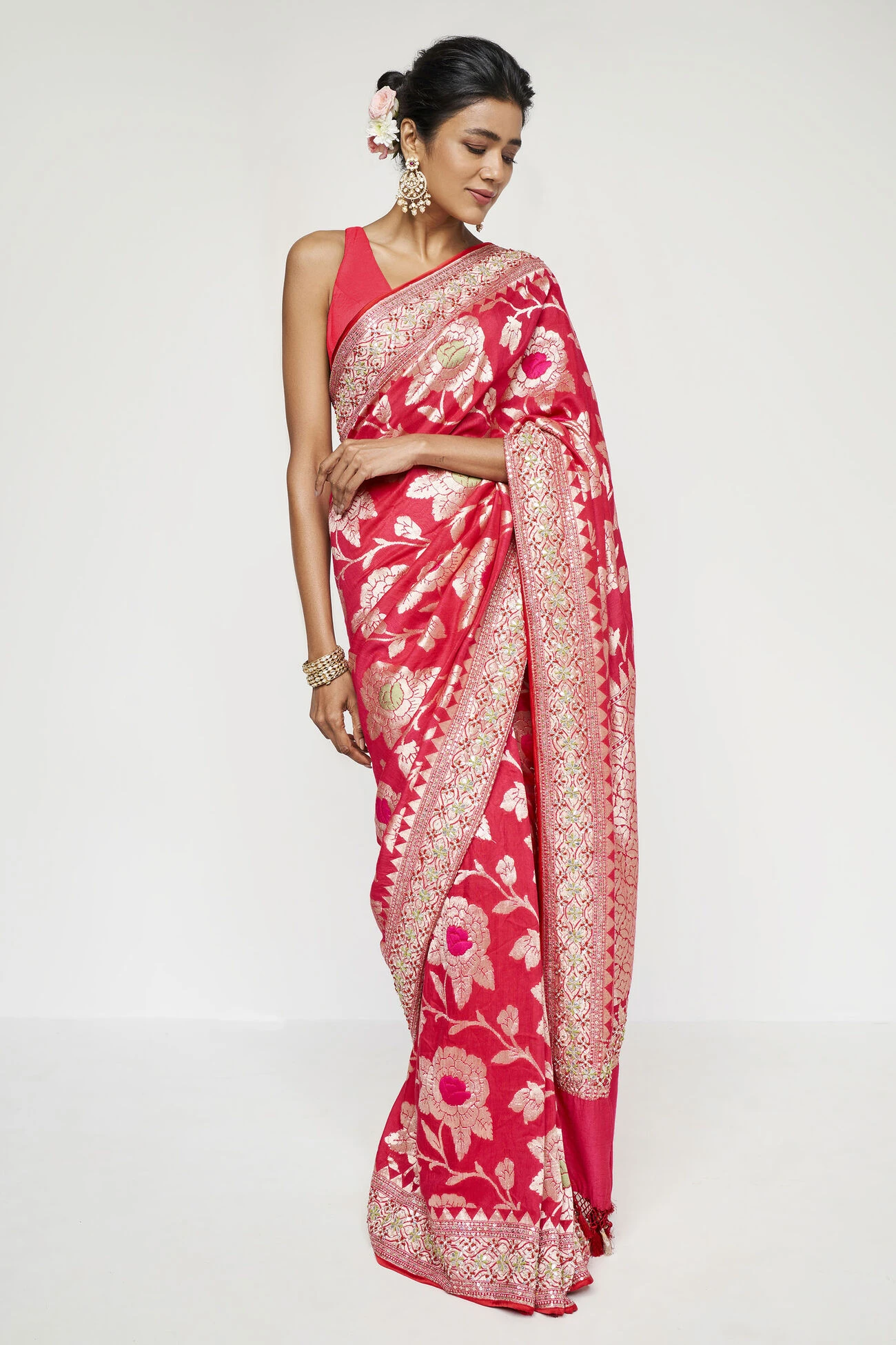 A time-honoured red Benarasi silk saree with intricate gota patti and sequin needlework. Dream for red lovers and traditional affairs.