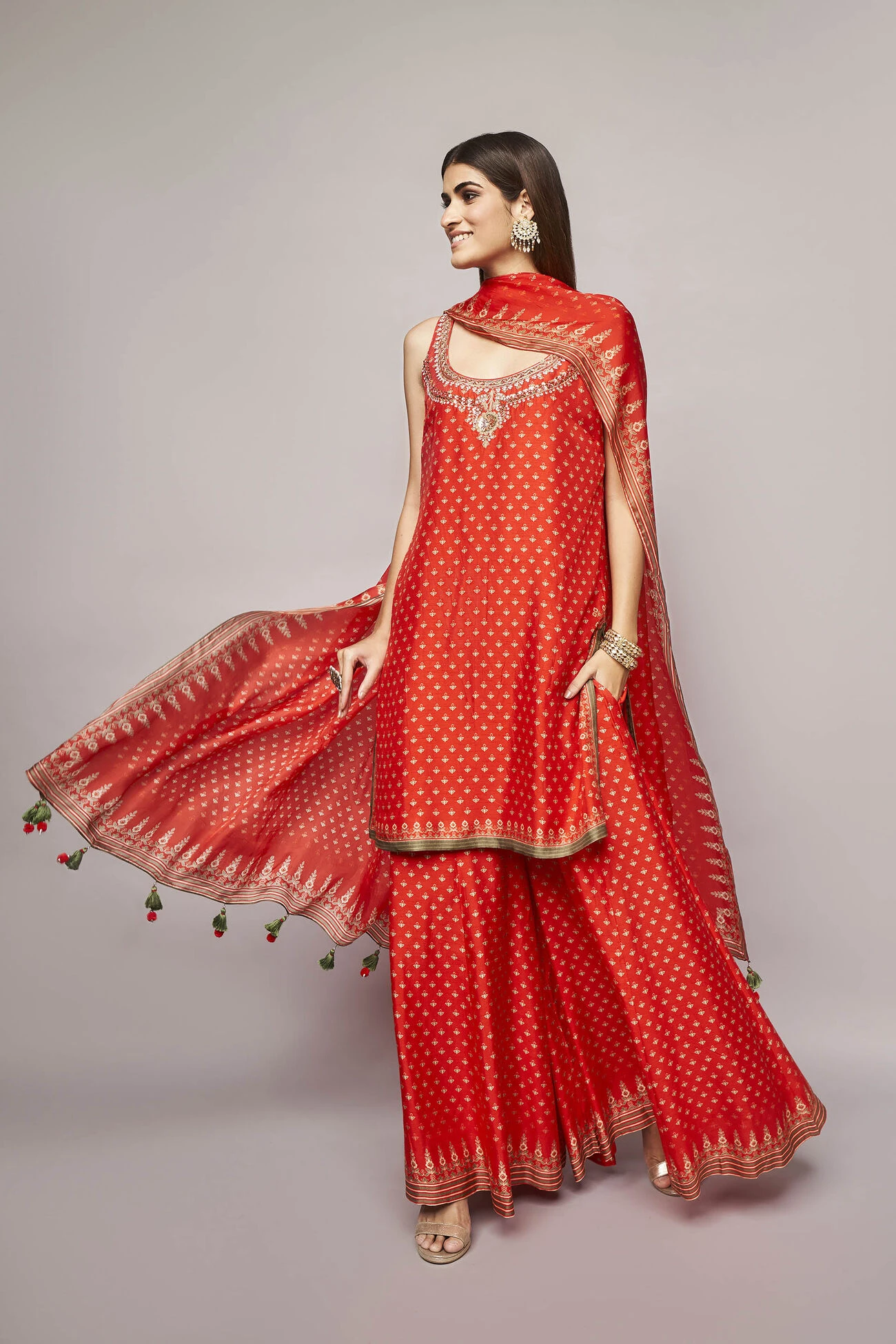 The Nikhara kurta set features a striking color making it a wardrobe staple for any occasion. Embroidered skillfully around the neckline, this raw silk ensemble with digital print allows you to move freely. Comes with pockets.