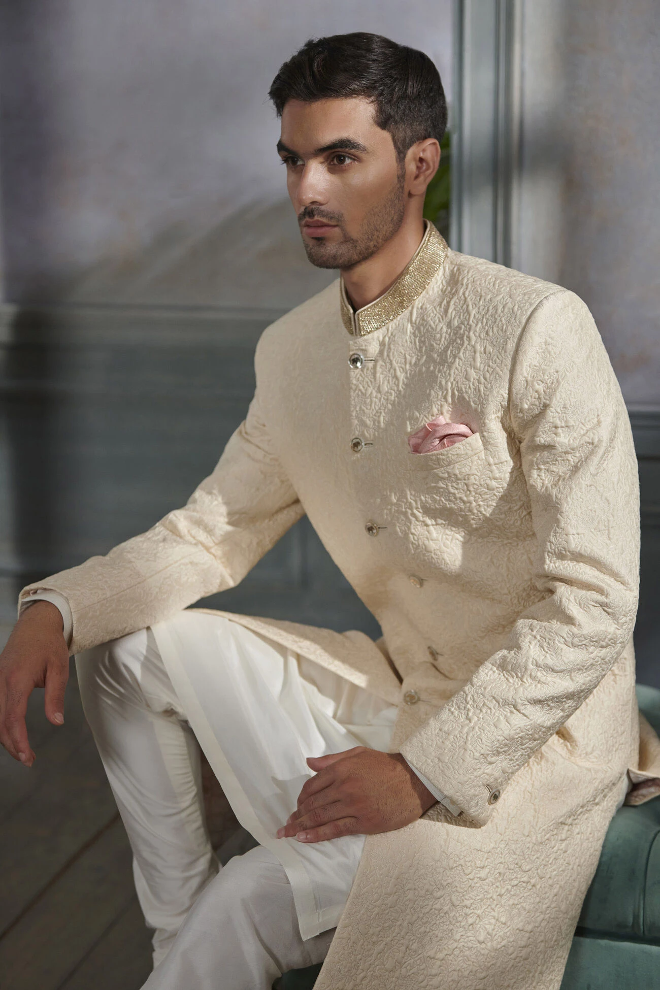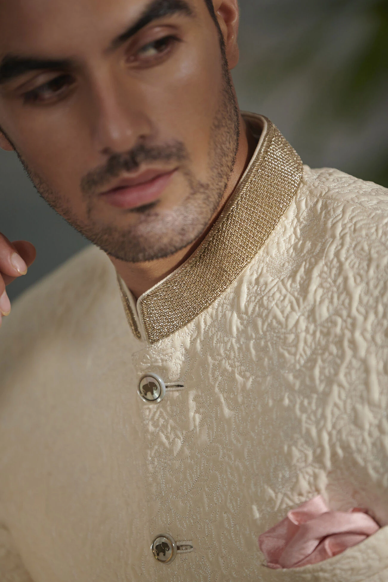 With quilted patterns running over its ivory length and a button-down feature, this sherwani is sophistication simplified. The fabric is sustainably-derived and is light and luxurious. Complete with our signature elephant logo buttons and embroidery at the collars.