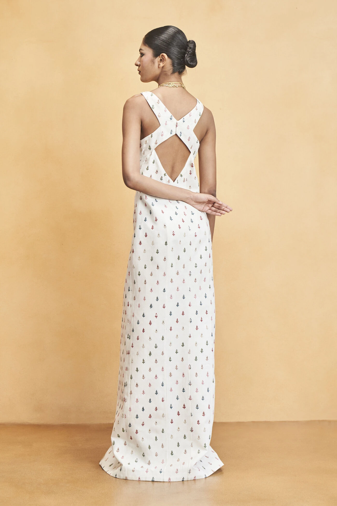 Resplendent flora and abundant fauna of the forest are skillfully hand-embroidered by the women artisans of SEWA on this statement silhouette. A glamorous slit makes it the perfect ensemble for contemporary celebrations.