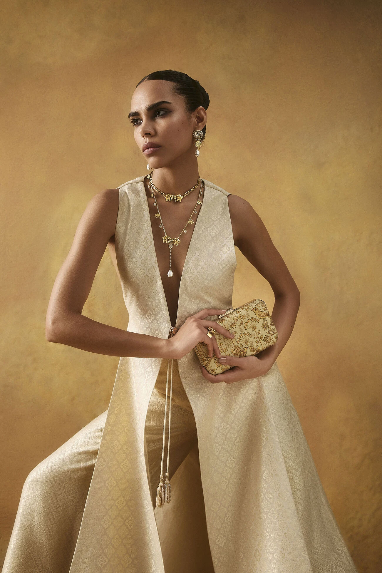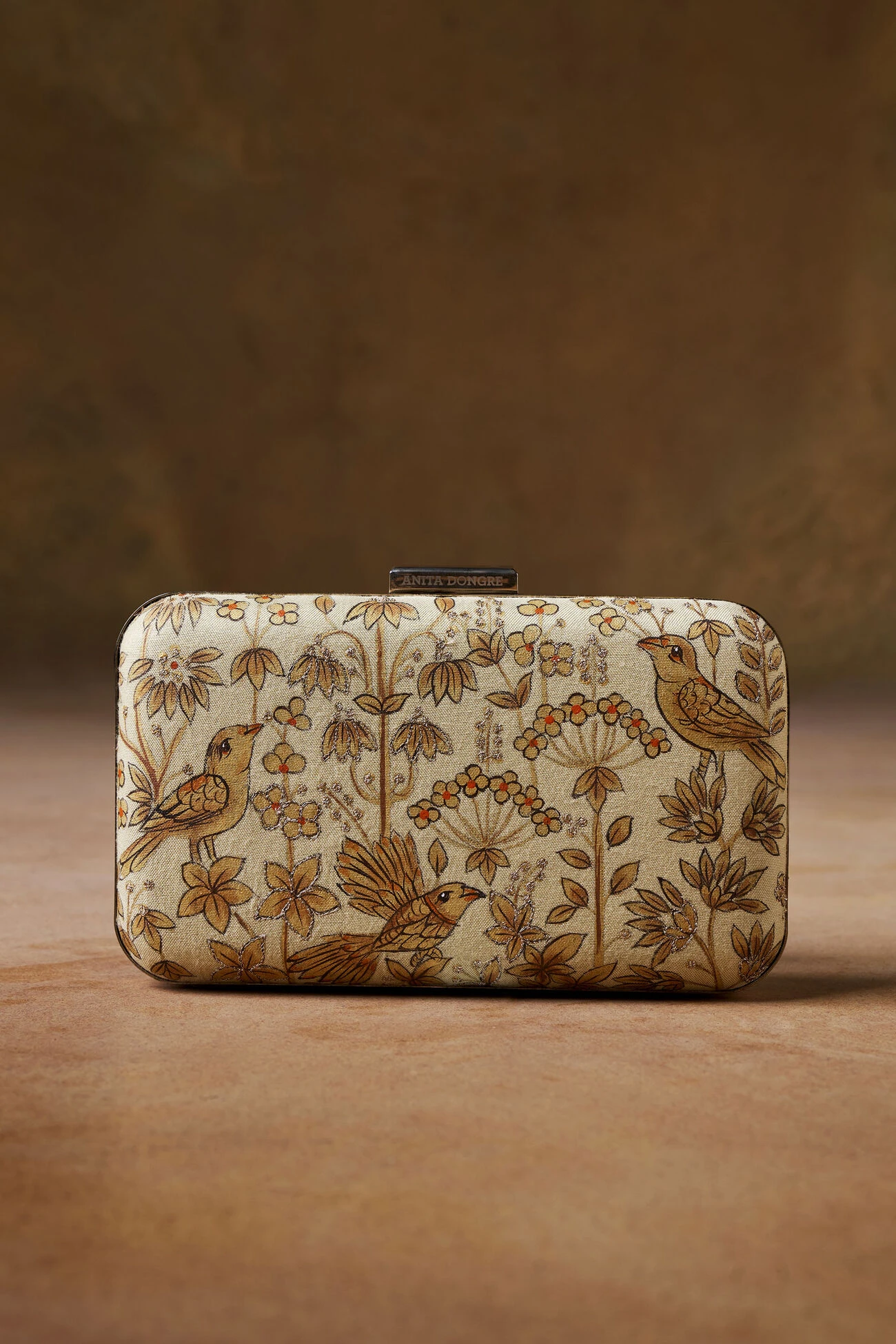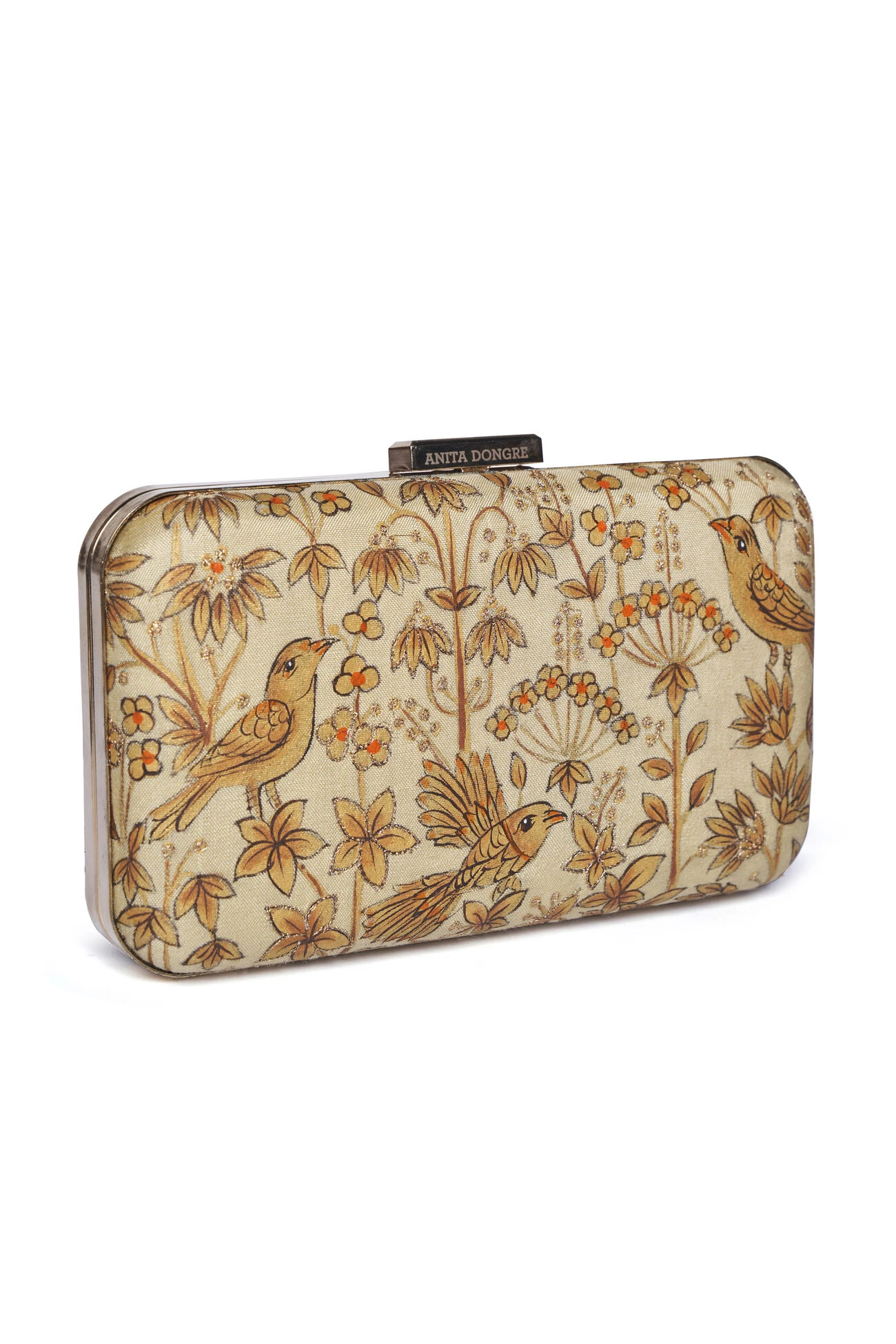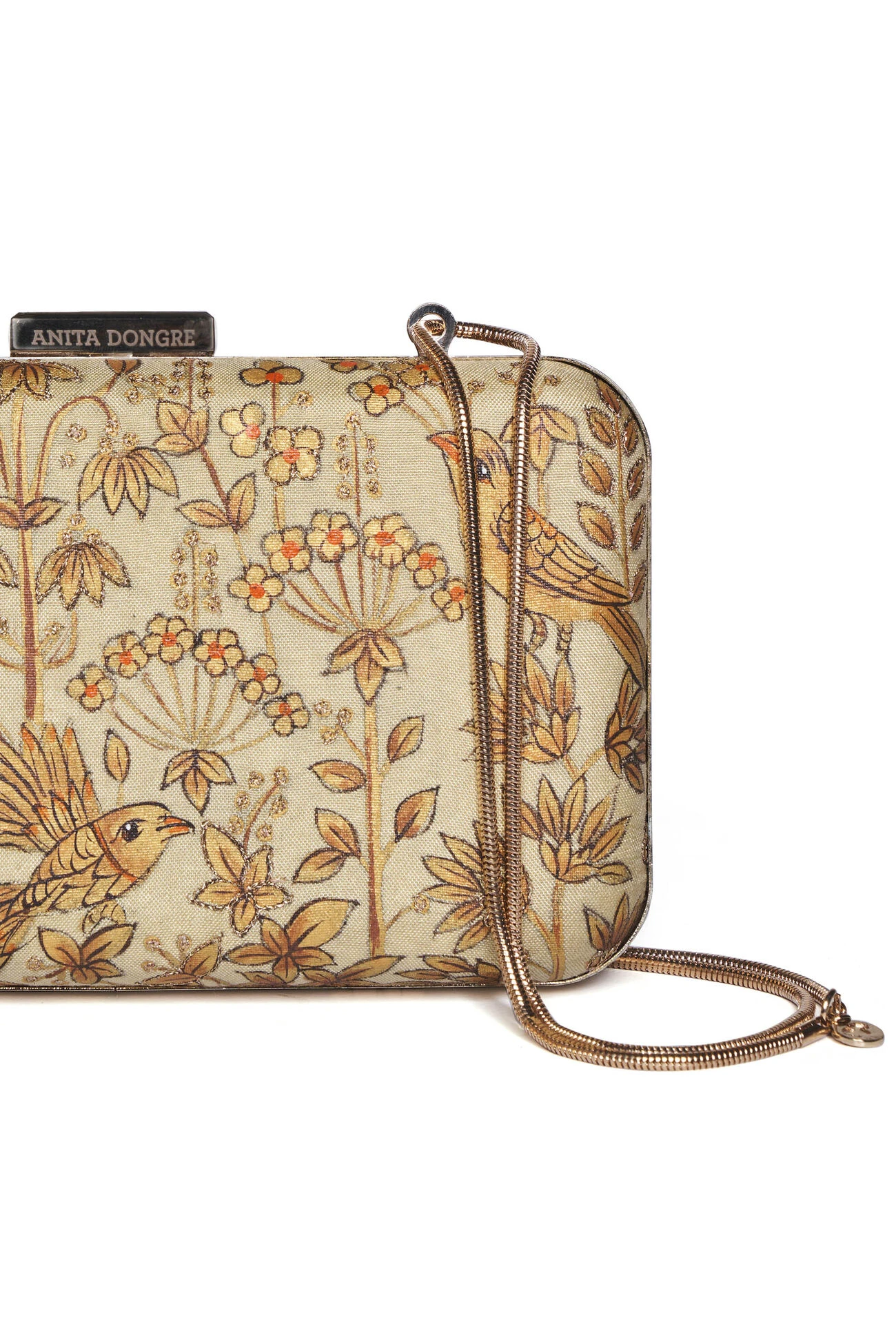 A clutch designed by master artisans keeping alive the 400-year-old legacy of Pichhwai. Crafted with a nature-inspired palette in mind. This cruelty-free accessory comes with a clasp closure.