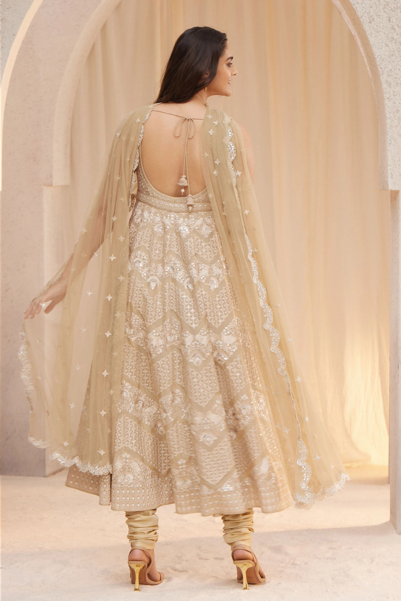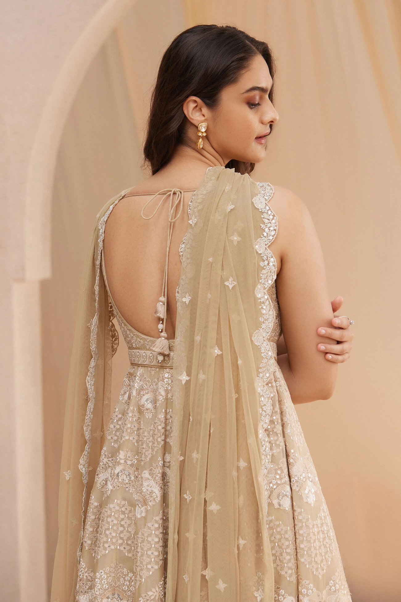 Our Pranayi suit set features geometric motifs with gleaming tonal embroidery. Perfect for daytime events and glamorous nights, this is a versatile ensemble for any celebration.