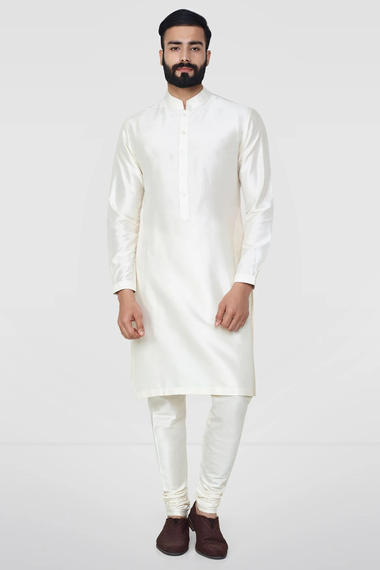 A classic cream silk kurta with stitch-line detailing at the collar and placket. Pair it with a gold dhoti for an elegant day occasion.